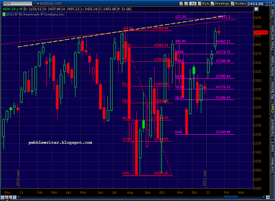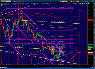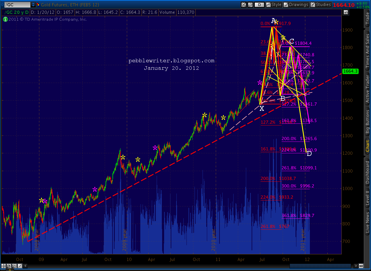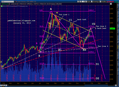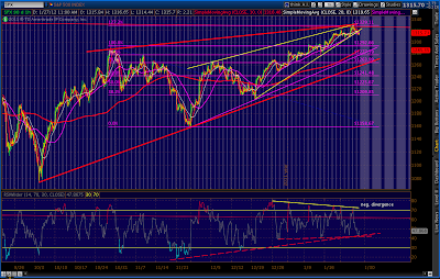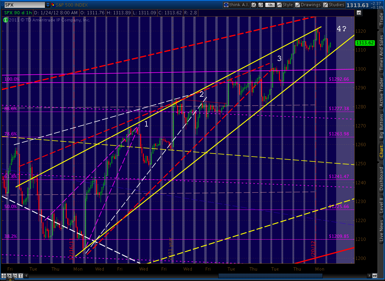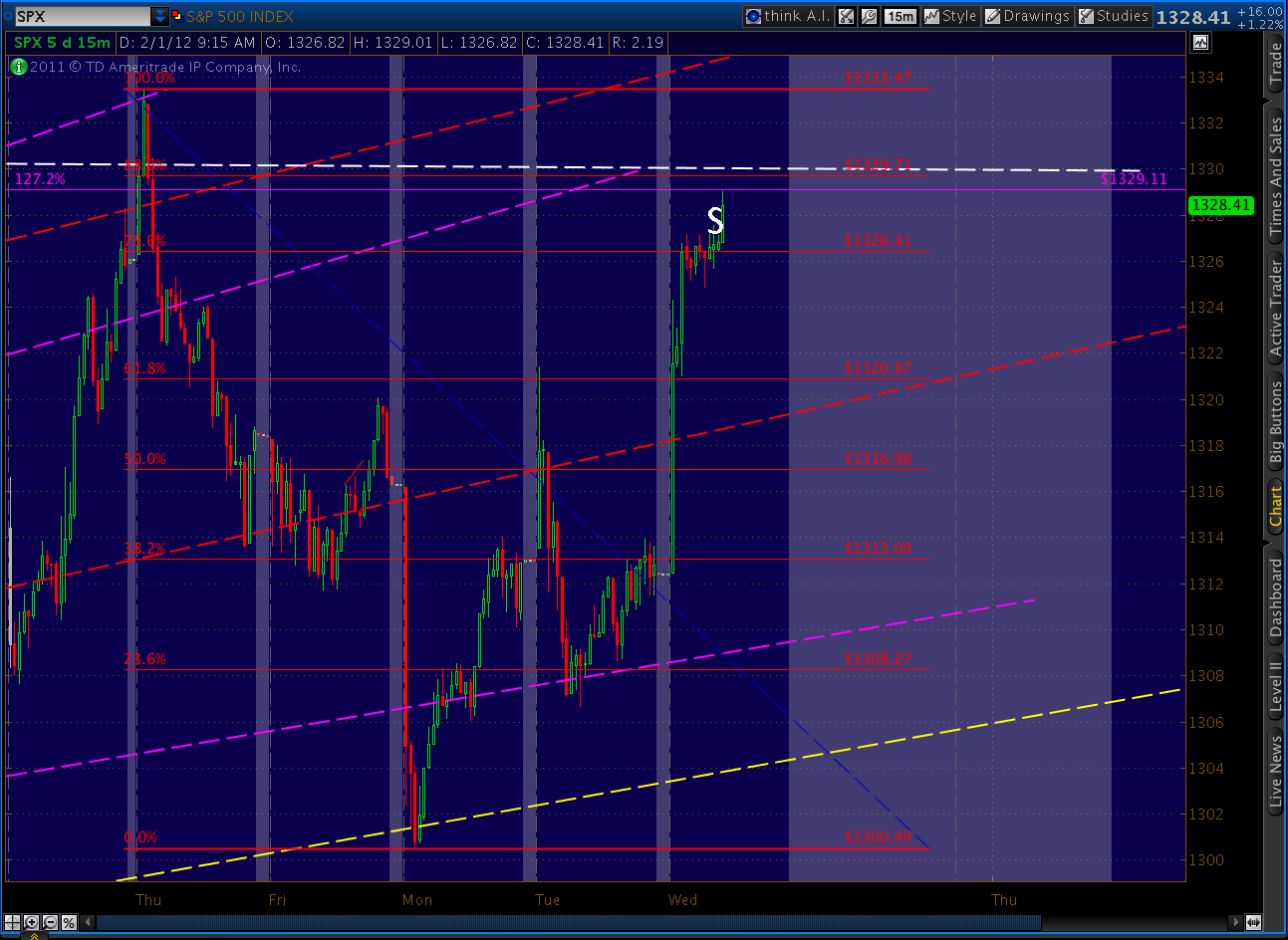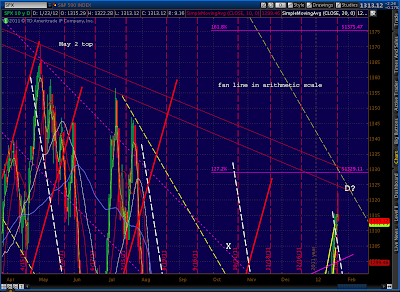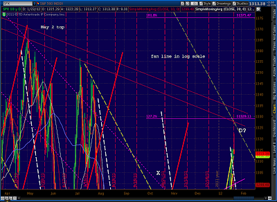 The number we care most about, of course, is 1333.47. It should present tough horizontal resistance, along with the Butterfly target (1329.11) and the Fan Line from 2007 which we just hit. Here’s the updated big picture of our fan lines, trend lines, channels and harmonics.