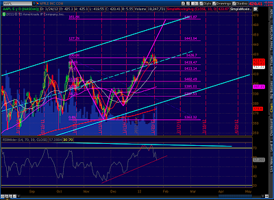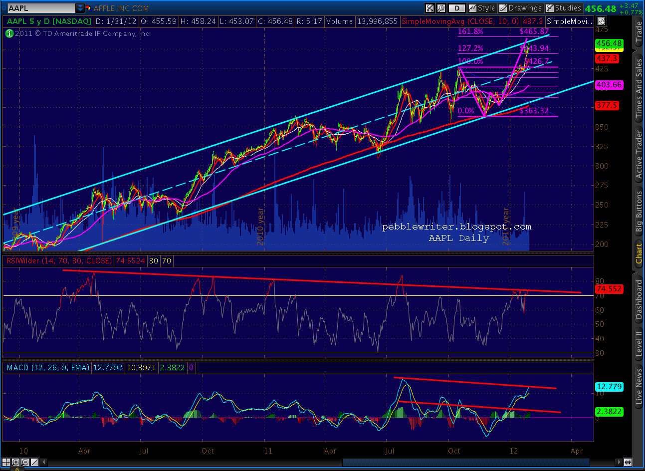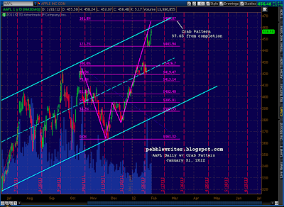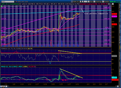 Apple’s high yesterday was only 7.63 from completing a bearish Crab pattern at 465.87 — a price that would also exceed the channel that’s guided AAPL’s upside for many moons. Check out the negative divergence on the hourly and daily charts.