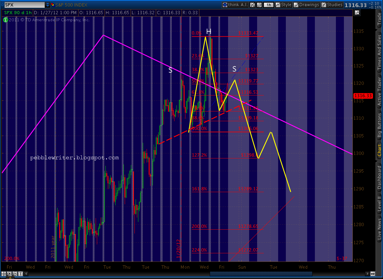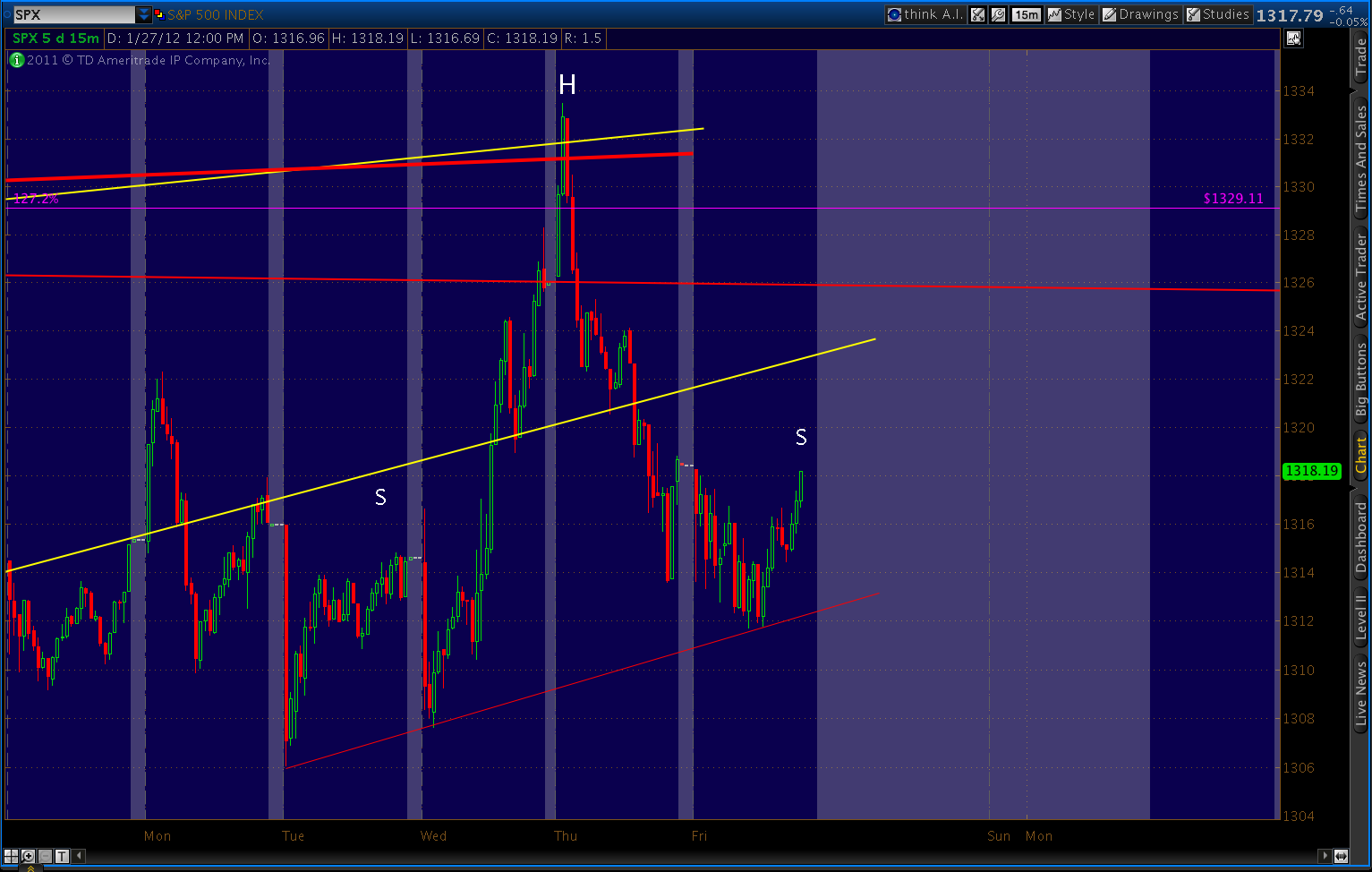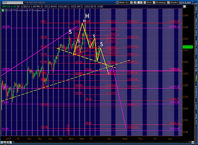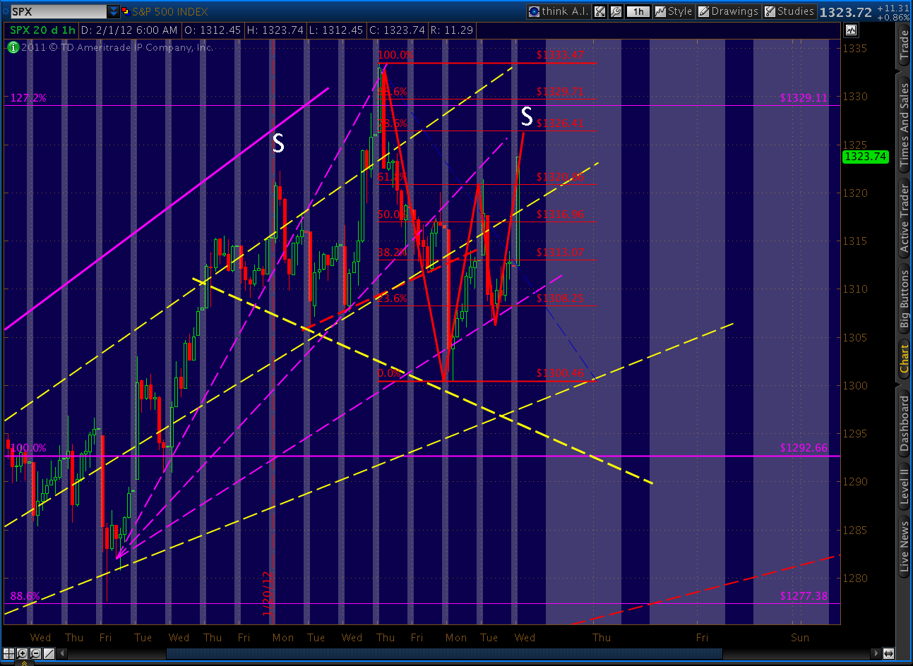 We hit 1321.41, which is generally close enough to work. Gartley’s are also expected to reverse at their .786 Fib level, which was the 1326.41 level I posted this morning. Prices dawdled at that level for three hours before popping up as high as 1329.1 a few minutes ago.