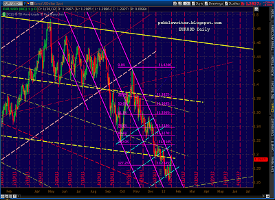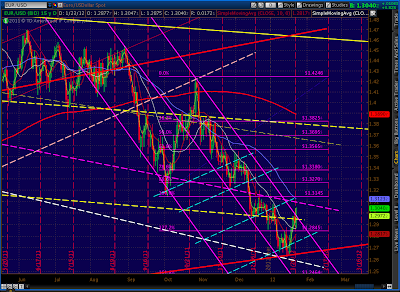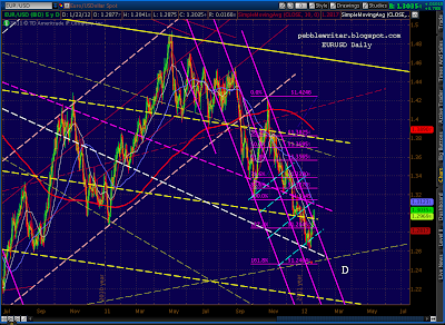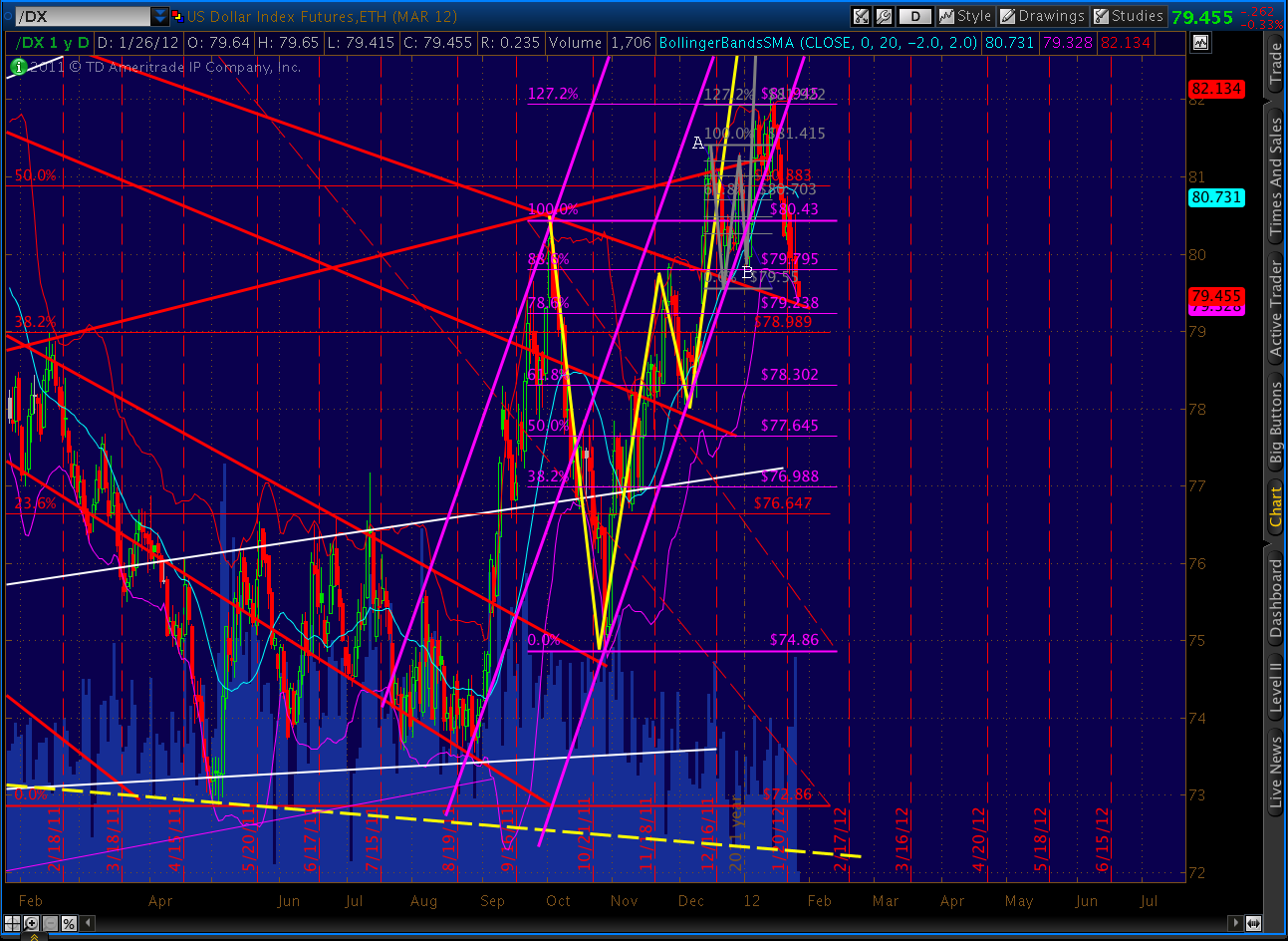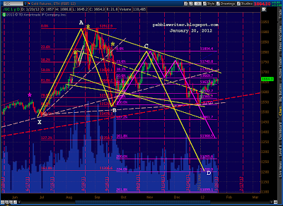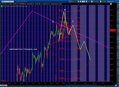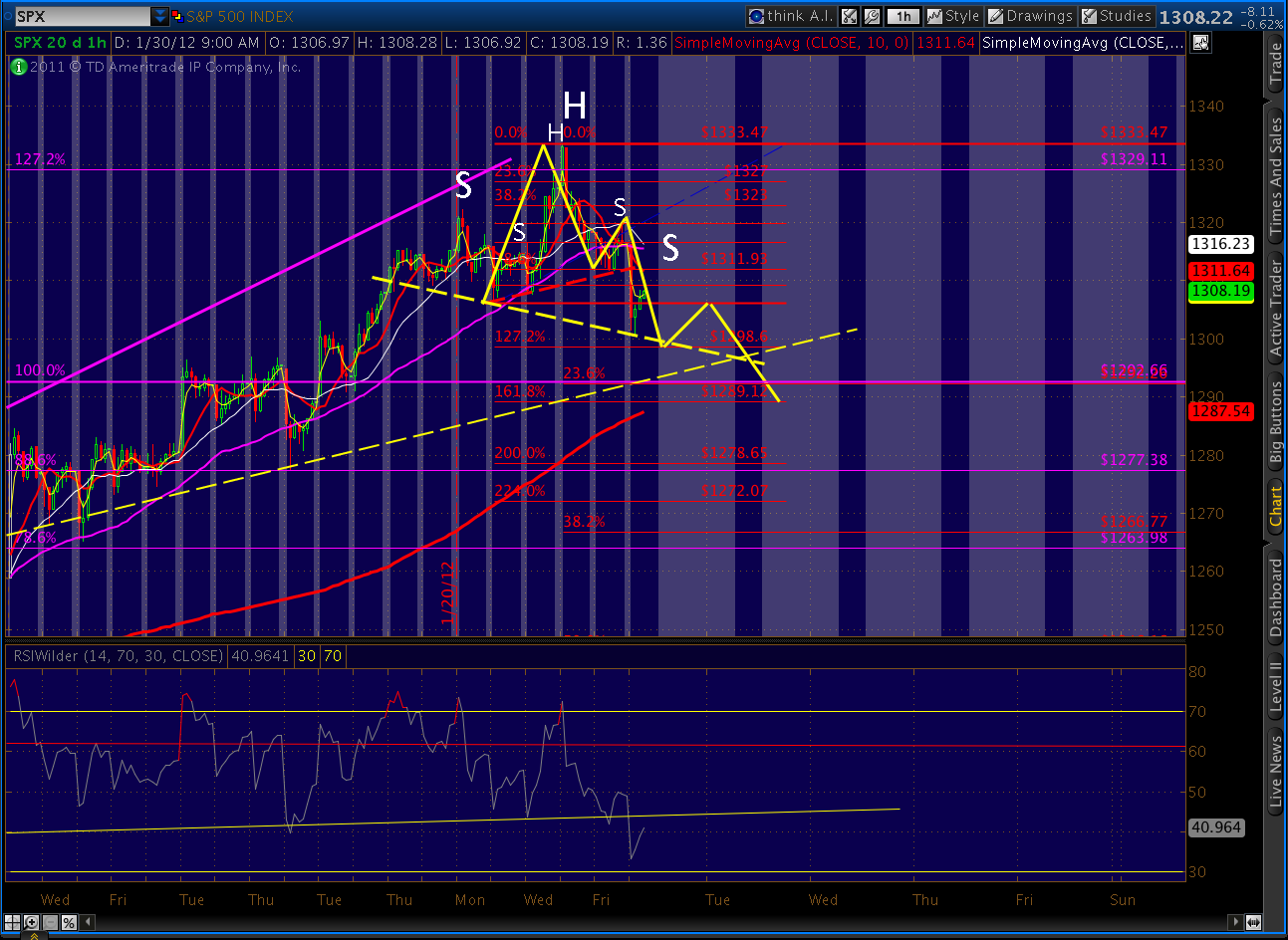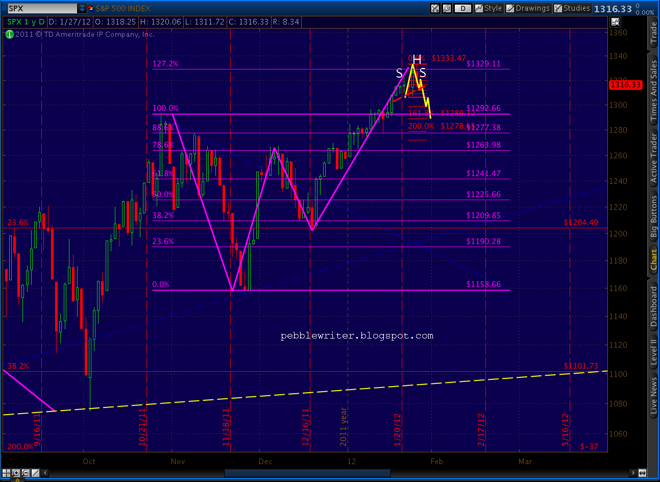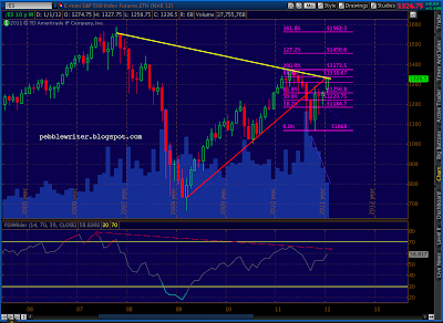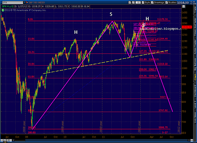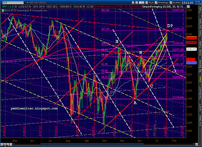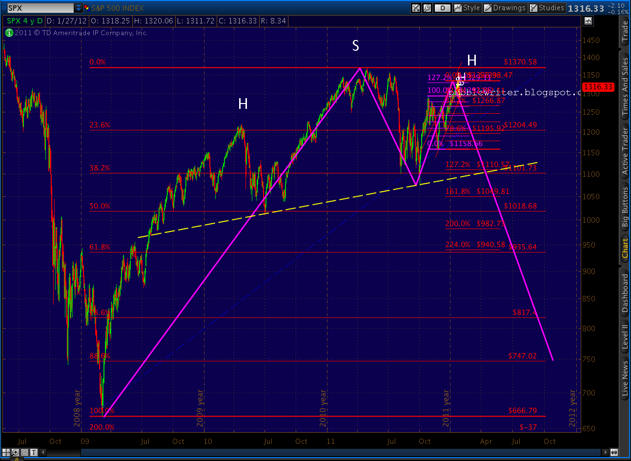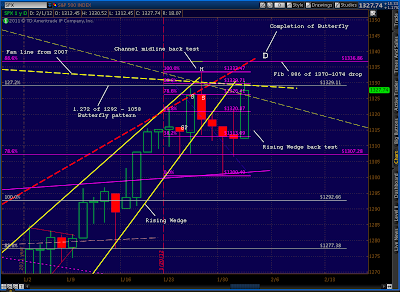 Recapping: current prices are right at the fan line from 2007 and are at the completion of the bearish Butterfly pattern (1.272 of 1292 – 1158) and the .886 of both the 1370-1074 drop and the last significant move (1333 – 1300), not to mention back testing the rising wedge that recently broke.