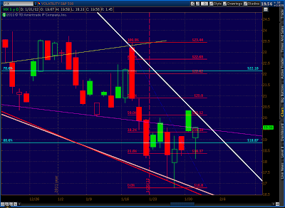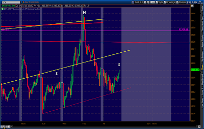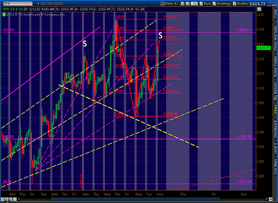 We’ve popped up above the 1326.41 Gartley target, only to stop right at the 1.272 target (1329.11) of the much larger Butterfly. It’s also a stone’s throw from the .886 (1329.71) of what I presumed was a Gartley pattern. Remember, Gartley’s Point B is at the .618 Fib level — which was 1320.87.