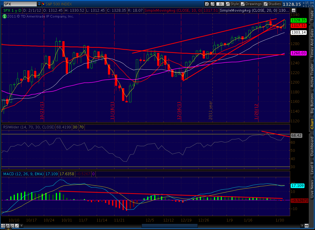 All in all, an excellent case for 1333 as the top. Does this guarantee it won’t go higher? Absolutely not. Experienced traders know that $&#@ happens. That’s why they use stops — as I always, always recommend. Even when I’m positive about a call, I still use stops.