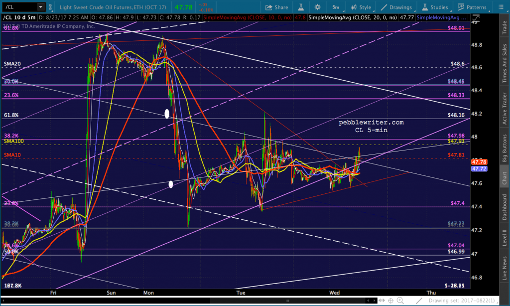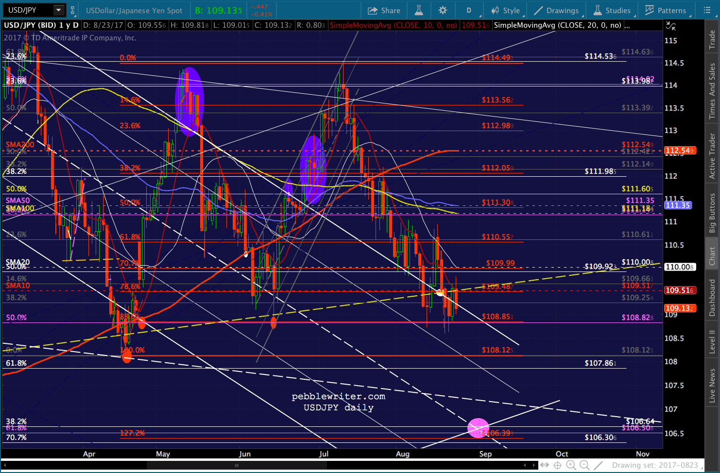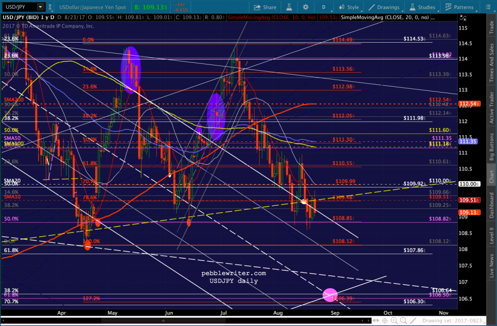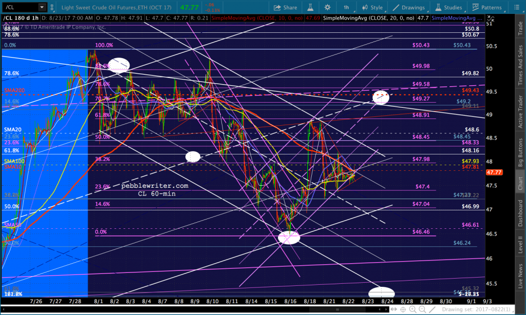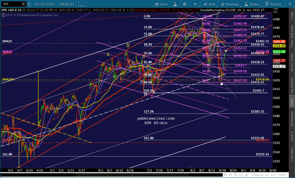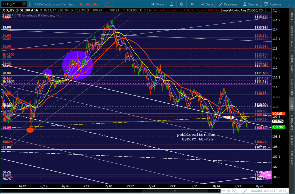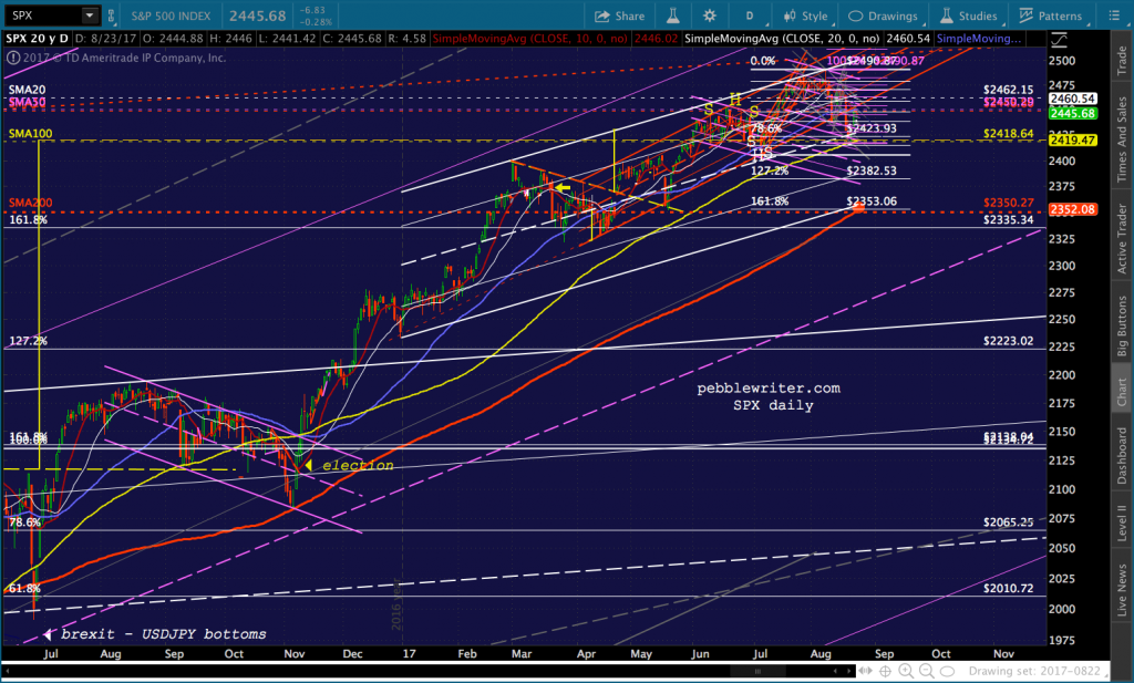 At the close, SPX is off 8.47, VIX didn’t break down but is actually breaking out (a little) and CL didn’t break out. USDJPY continues to slump as the lousy housing report gives the Fed little ammunition to raise rates. We should see a continuation of this slump tomorrow, with Jackson Hole warming up. I’ve restored the .618 target as originally drawn this morning.