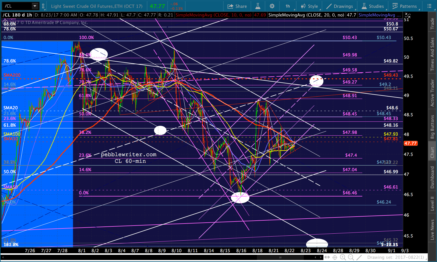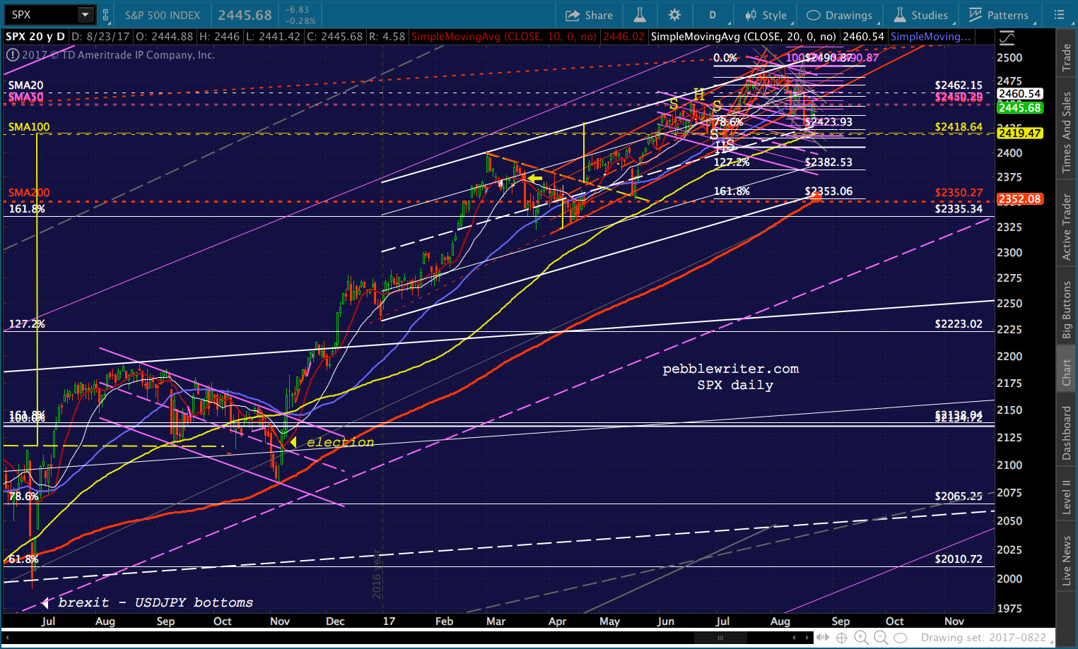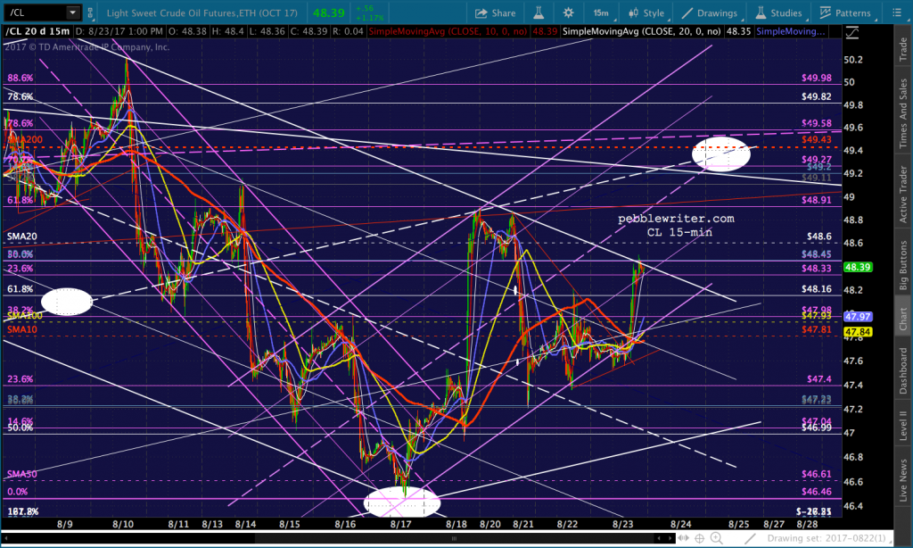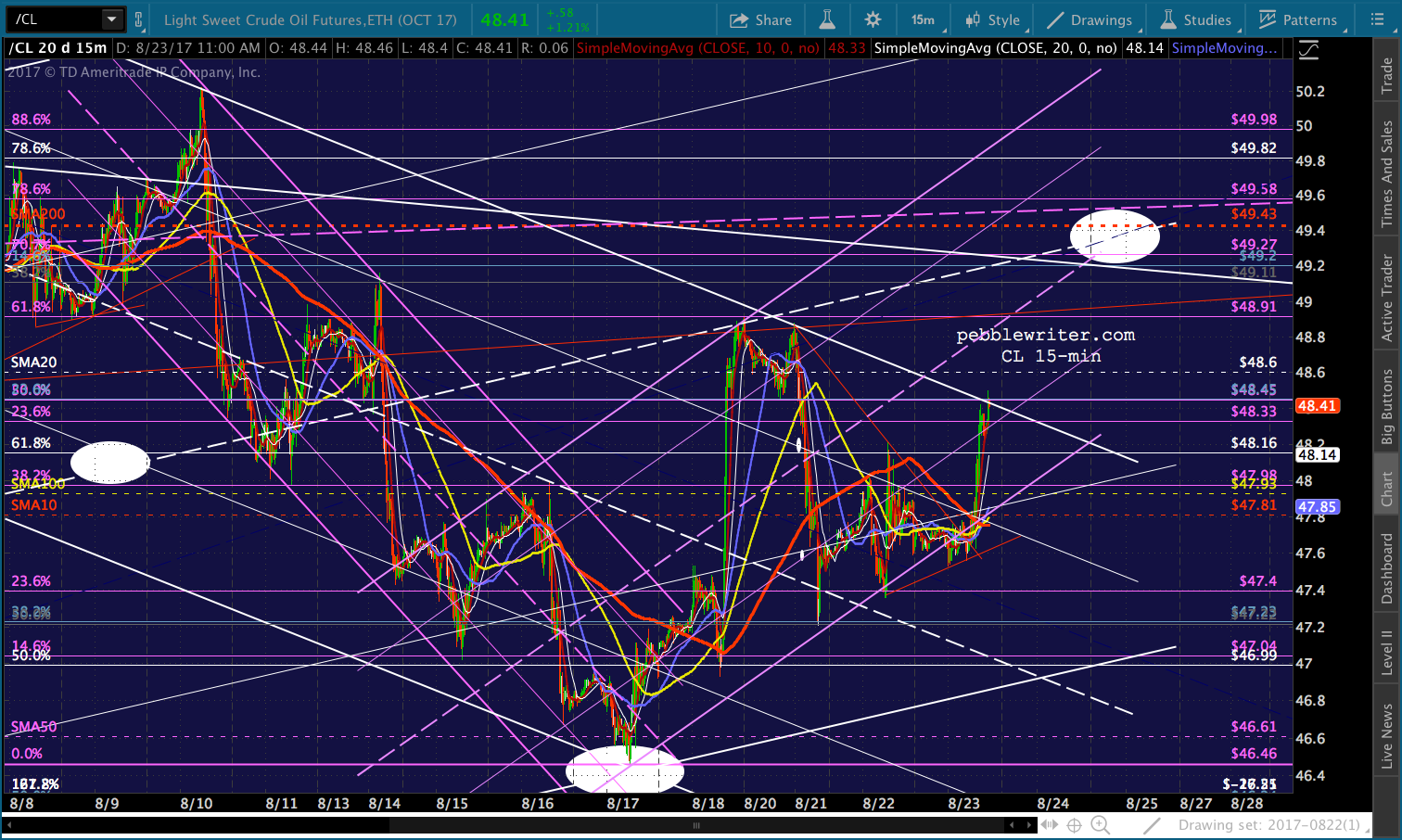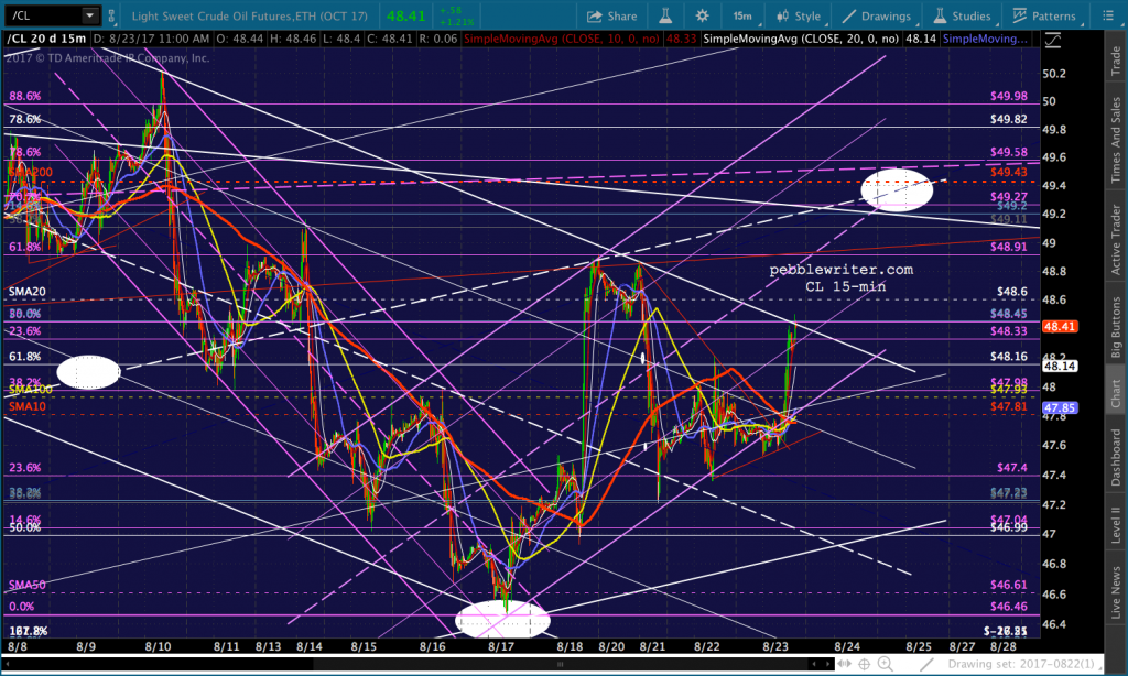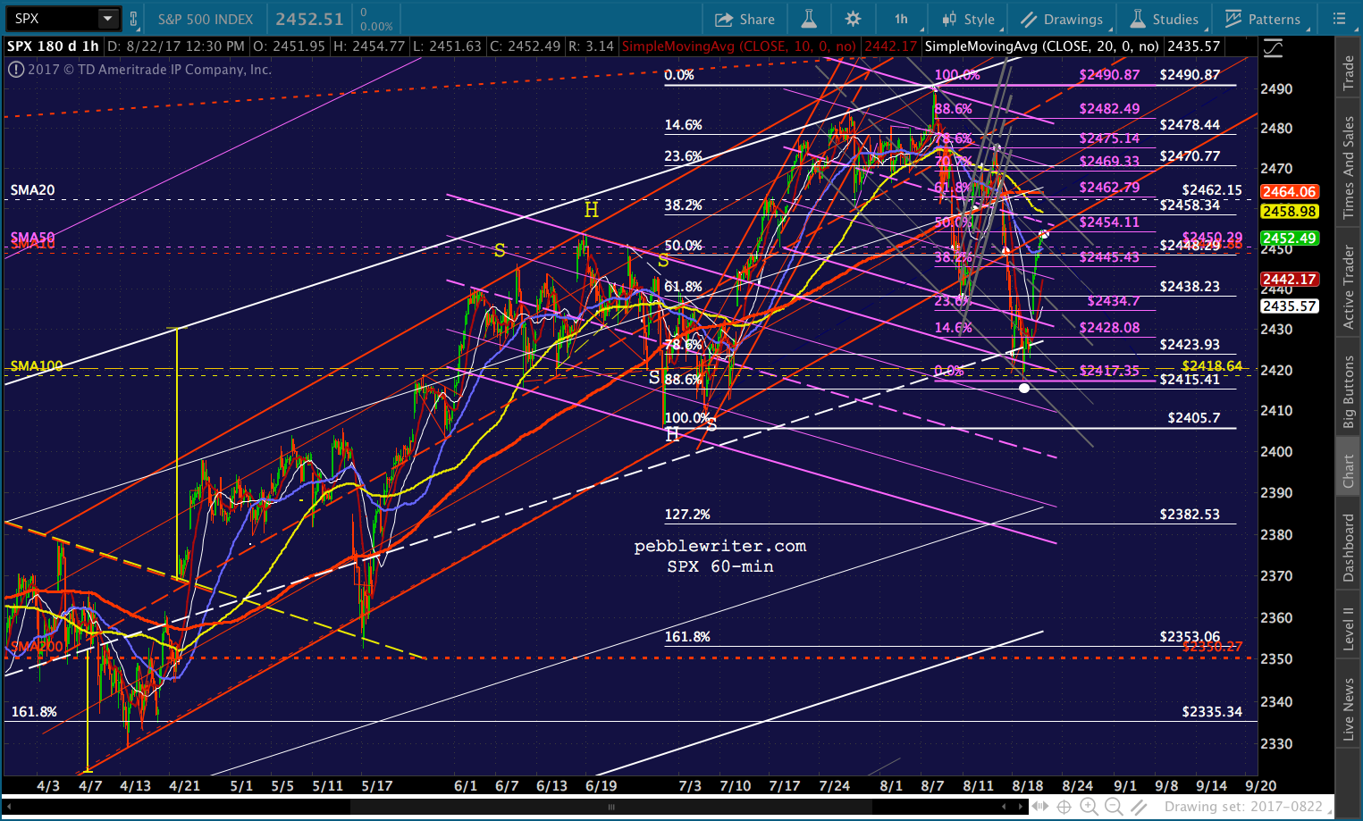 At the close, SPX is off 8.47, VIX didn’t break down but is actually breaking out (a little) and CL didn’t break out. USDJPY continues to slump as the lousy housing report gives the Fed little ammunition to raise rates. We should see a continuation of this slump tomorrow, with Jackson Hole warming up. I’ve restored the .618 target as originally drawn this morning.