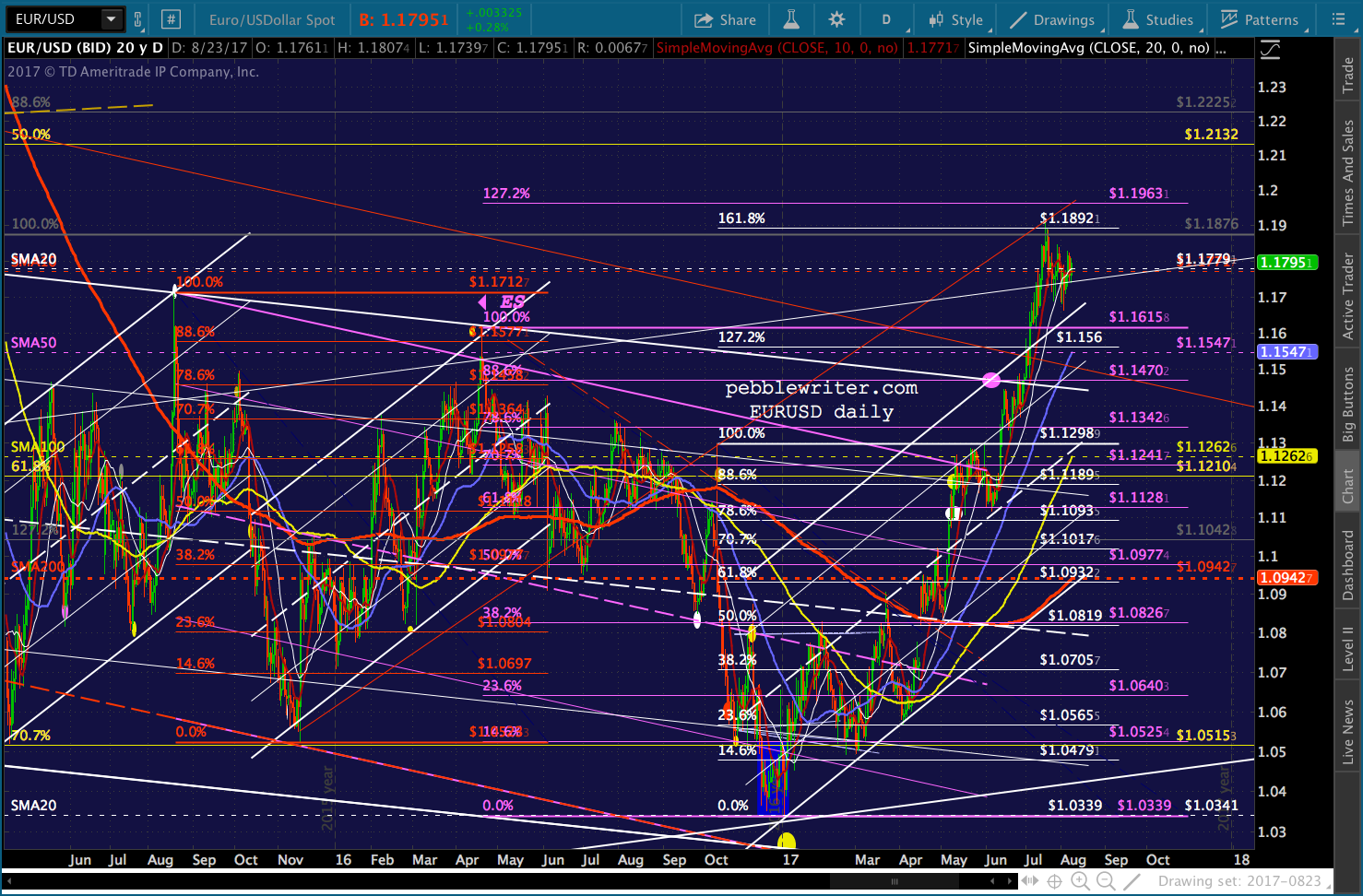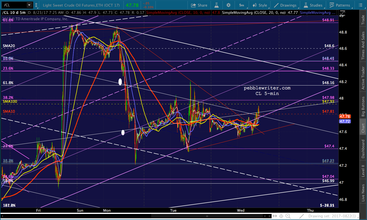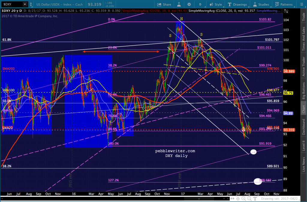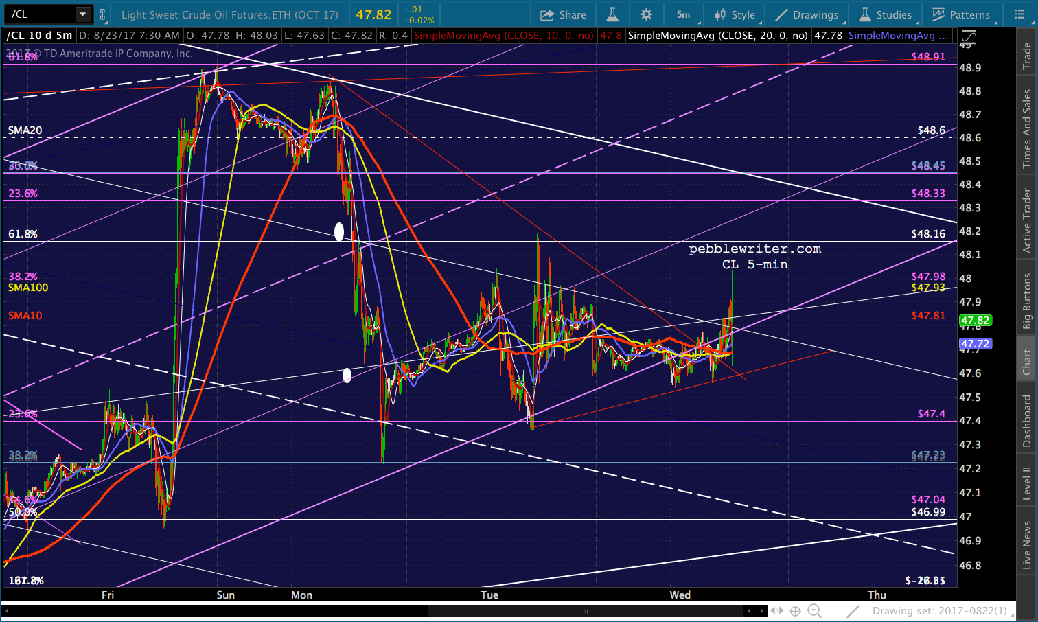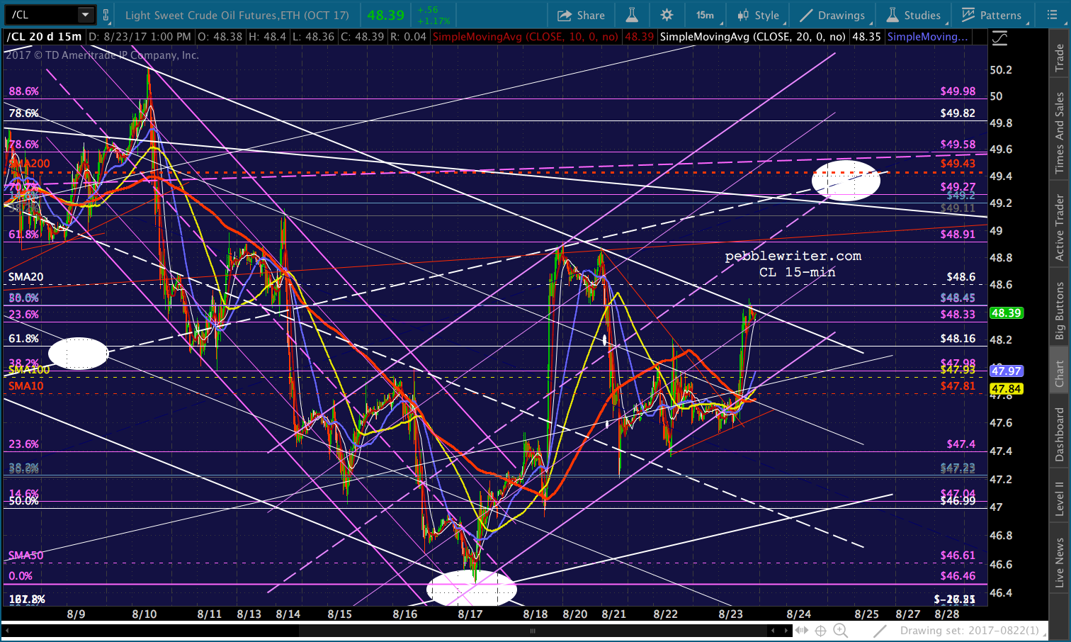 At the close, SPX is off 8.47, VIX didn’t break down but is actually breaking out (a little) and CL didn’t break out. USDJPY continues to slump as the lousy housing report gives the Fed little ammunition to raise rates. We should see a continuation of this slump tomorrow, with Jackson Hole warming up. I’ve restored the .618 target as originally drawn this morning.