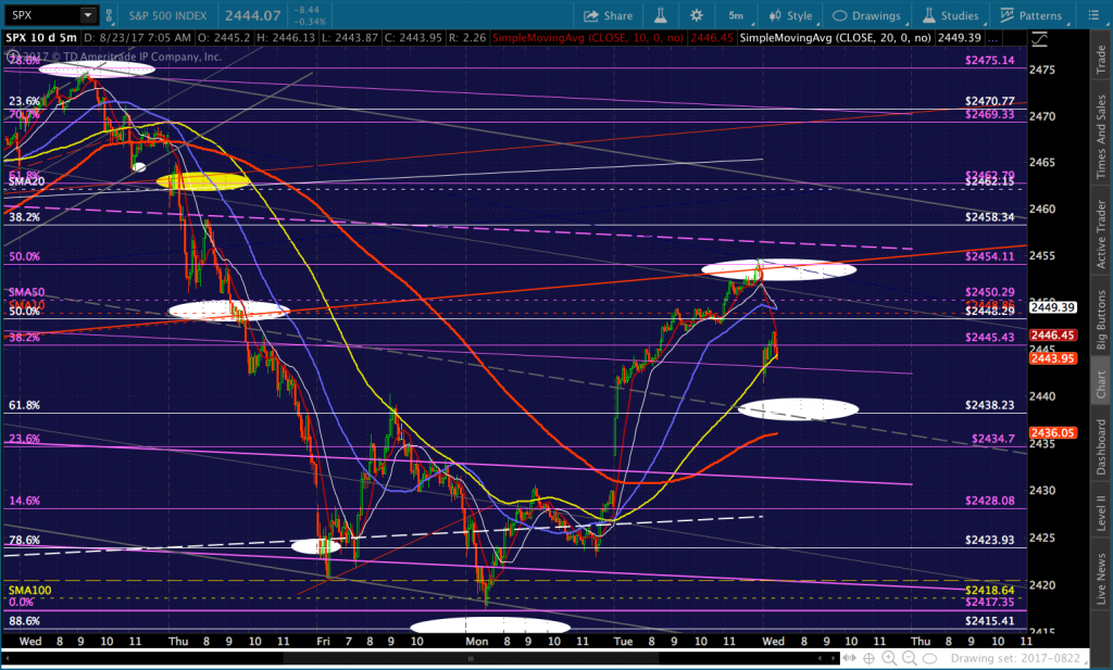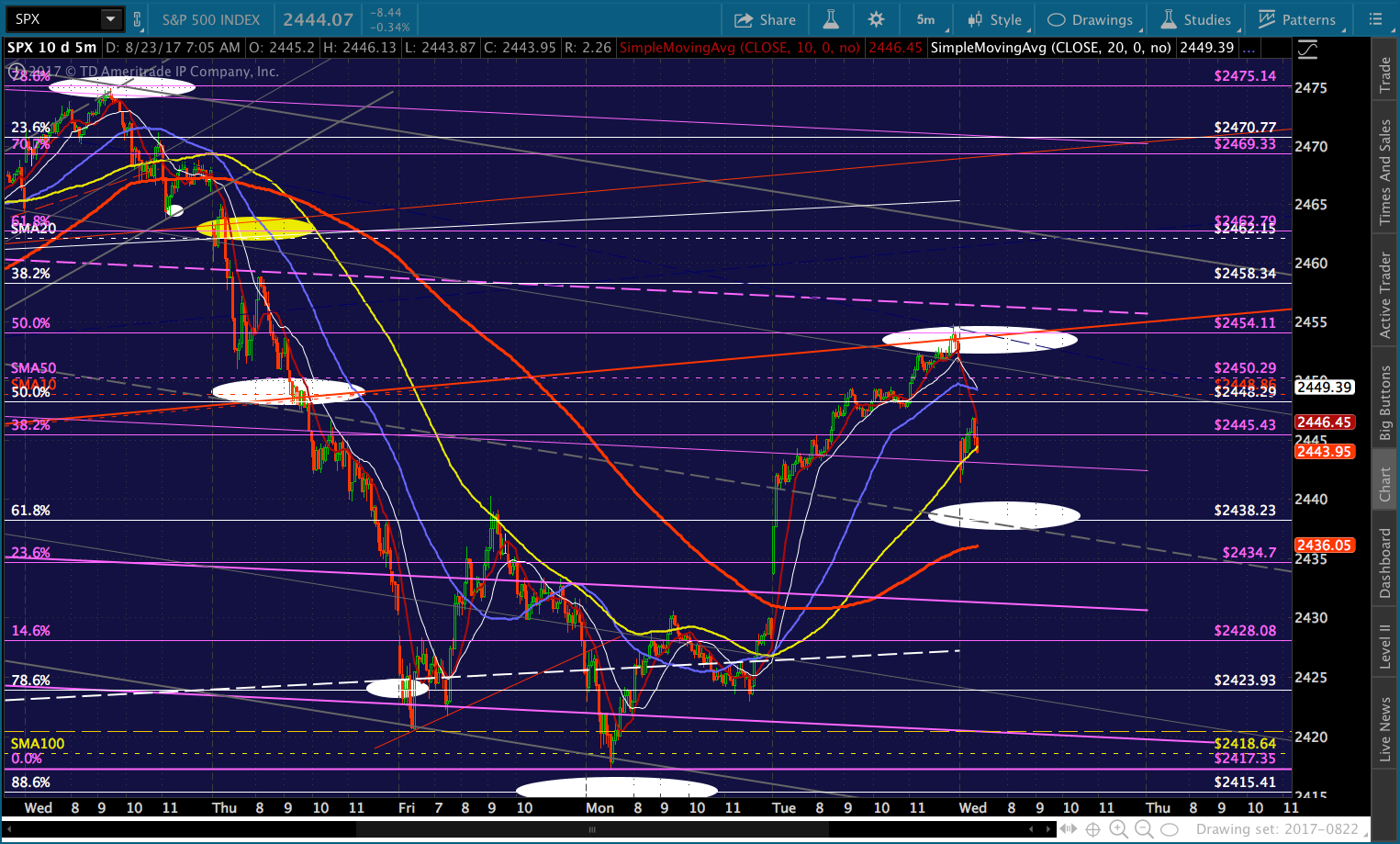 We got the usual ramp into 10AM, where SPX backtested the SMA5 10. From here, we should see it focus on the SMA5 200 as it reaches the gray midline around 2438.23. Whether or not it bounces there will determine whether the backtest holds or not.