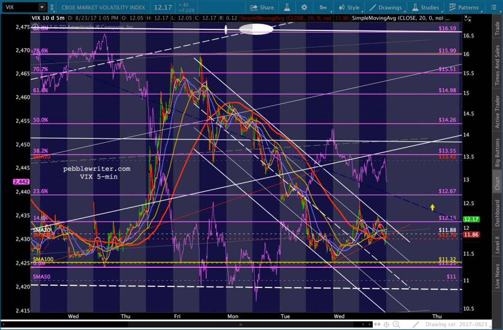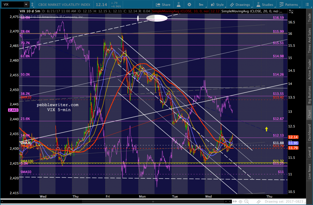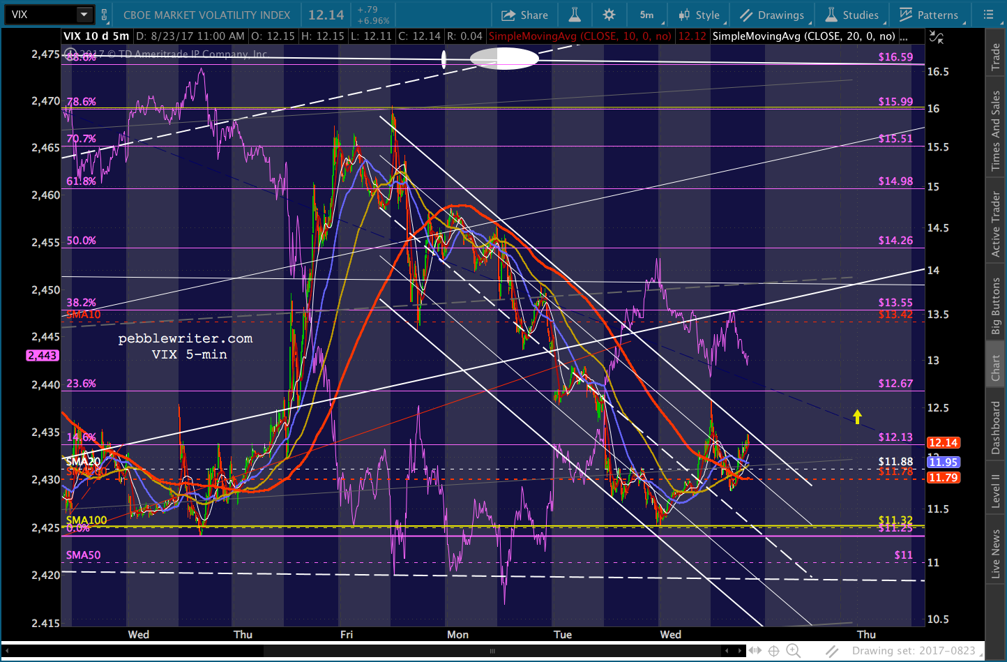 I’ve added an interim target at the red .283 at 2440.48, and shifted the other target to 2436.06, the intersection of the rising white channel and falling gray midline at the red .500. Keep an eye on VIX, though, as it has created an opportunity to break SPX out of the small, falling white channel.