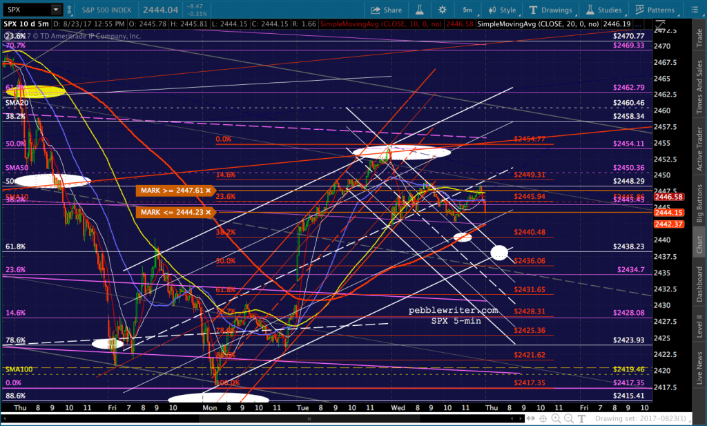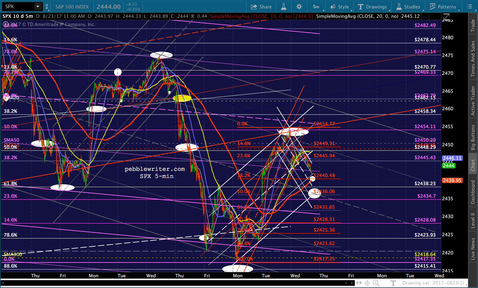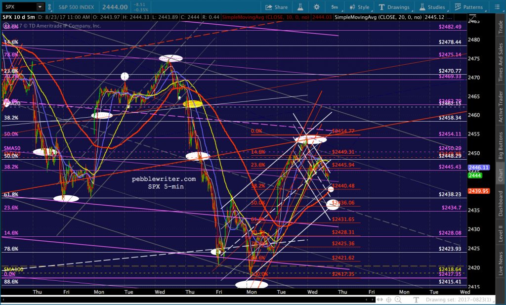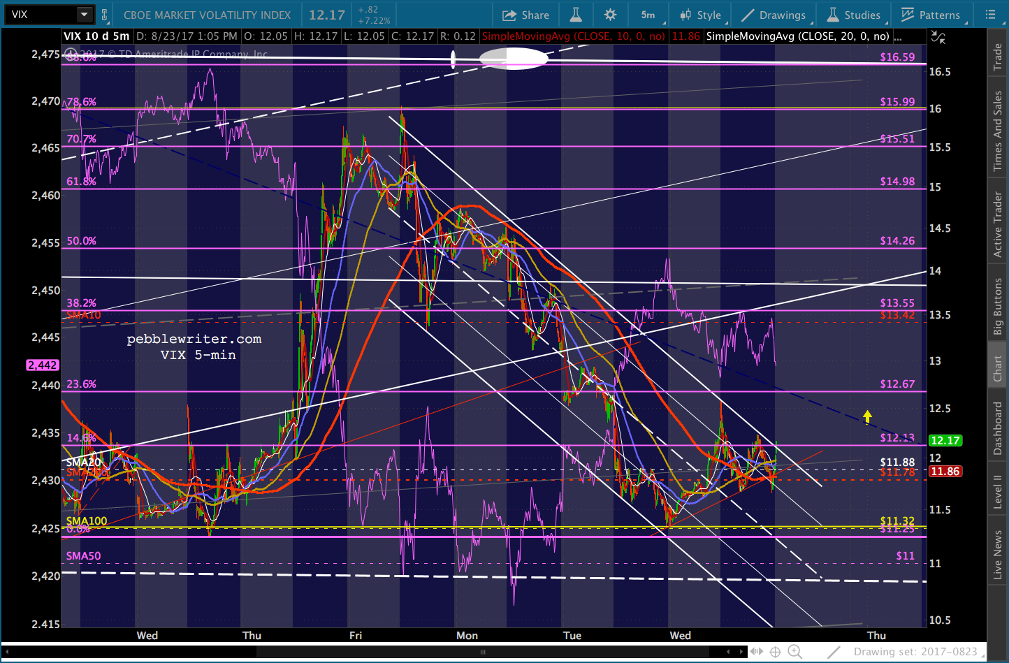 I’ve added an interim target at the red .283 at 2440.48, and shifted the other target to 2436.06, the intersection of the rising white channel and falling gray midline at the red .500. Keep an eye on VIX, though, as it has created an opportunity to break SPX out of the small, falling white channel.
