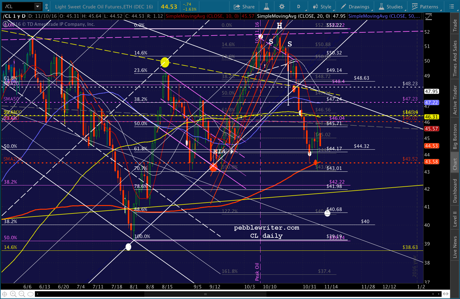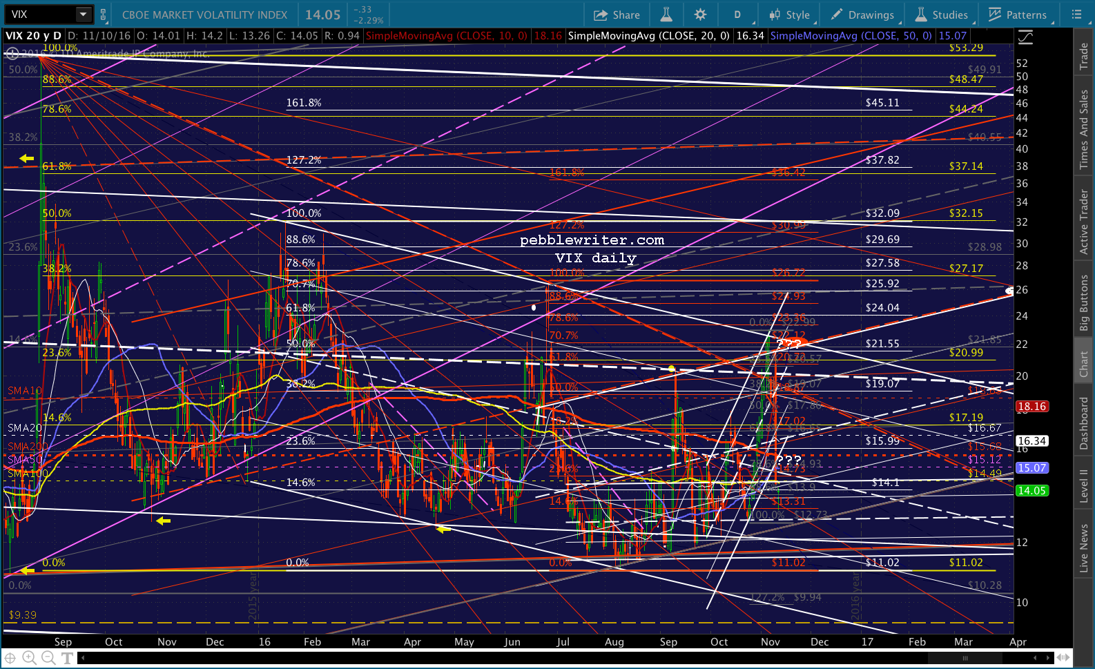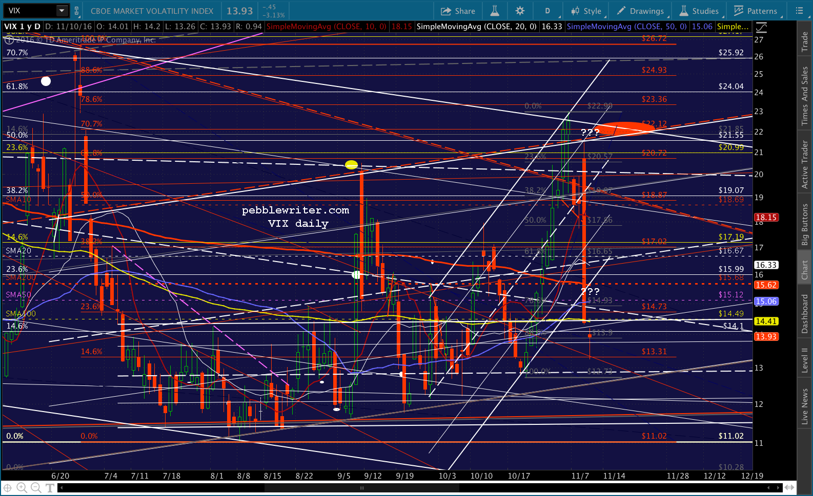 With the latest rising white channel having broken down, there’s little support until VIX reaches 12.55 or so — the bottom of the larger rising channel at or below the Oct 25 lows. Though, there’s potential fan line support around the red .146 at 13.31.