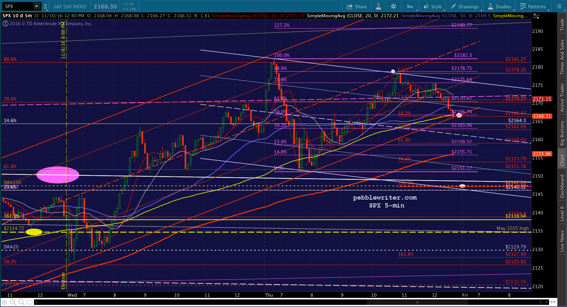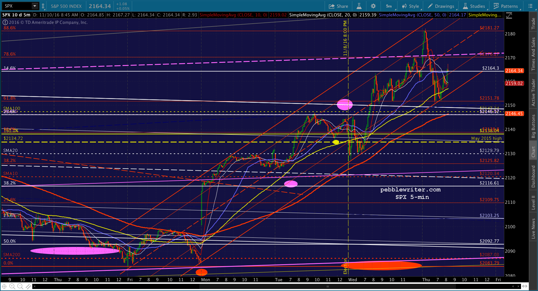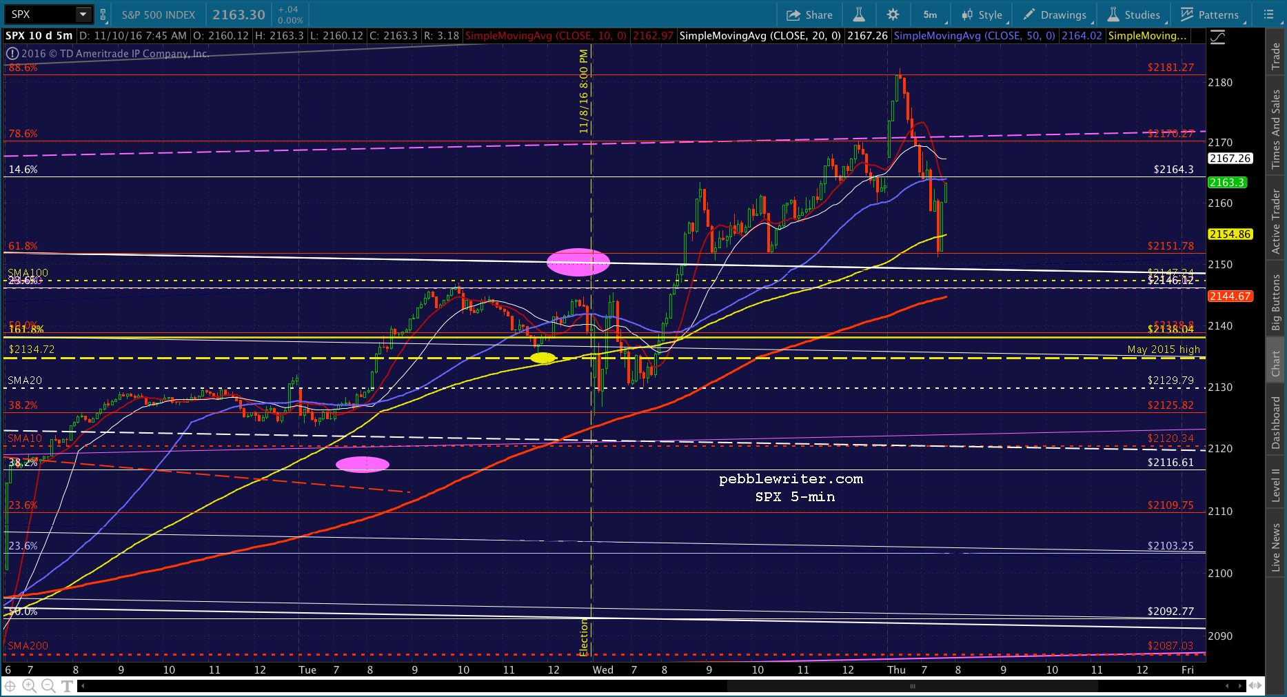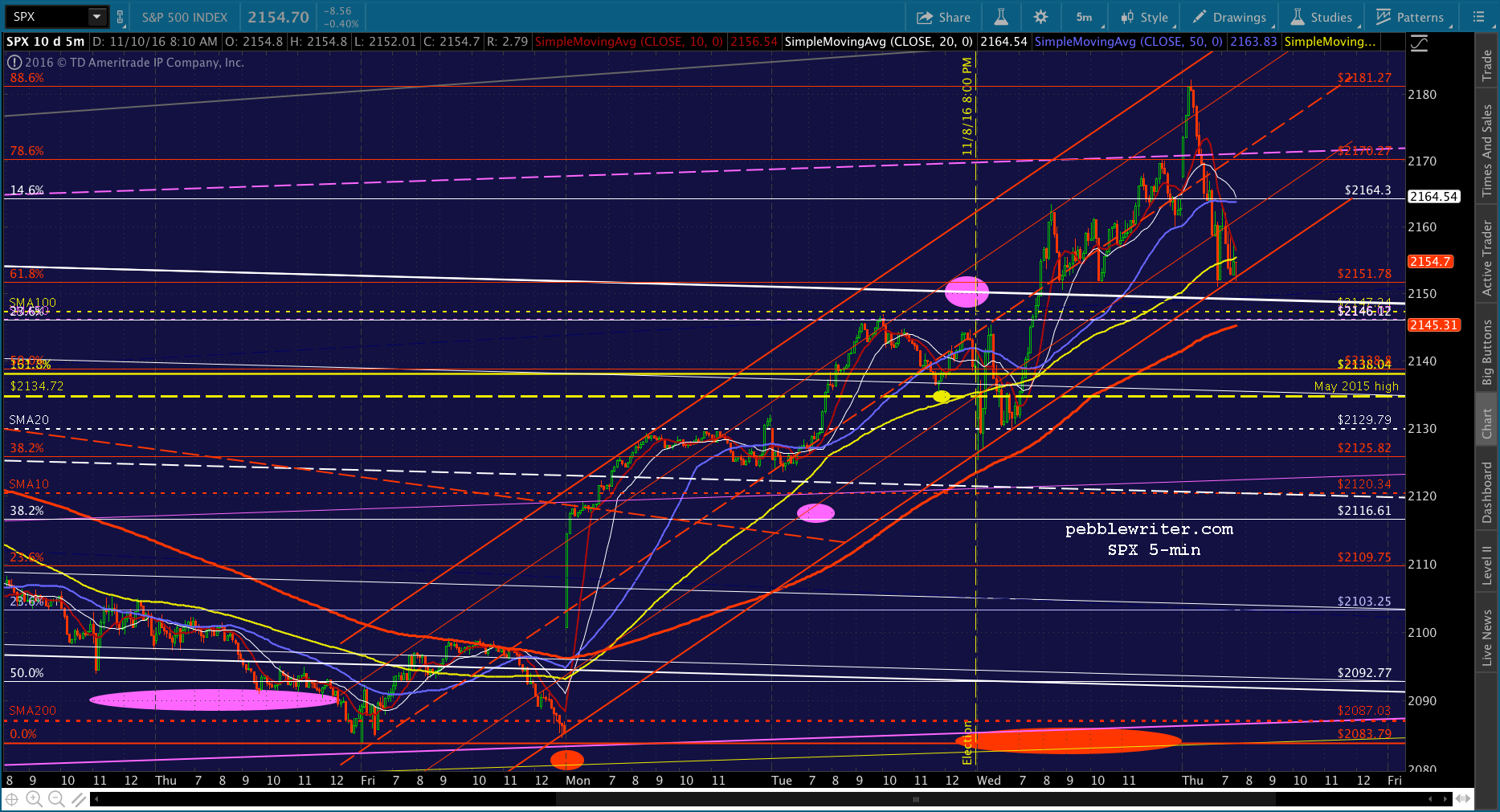 It could also drop lower than 2147.24. Note that ES, which dropped through its SMA5 200 at 2166, has its .618 down at 2129.23 which would be the equivalent of 2134 on SPX. I’ll be watching to see what happens when SPX tests the TL from Monday’s lows again.