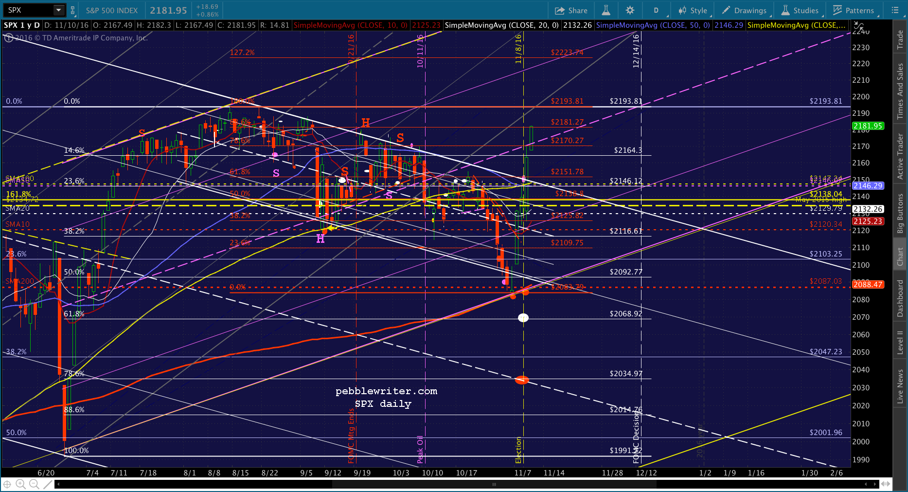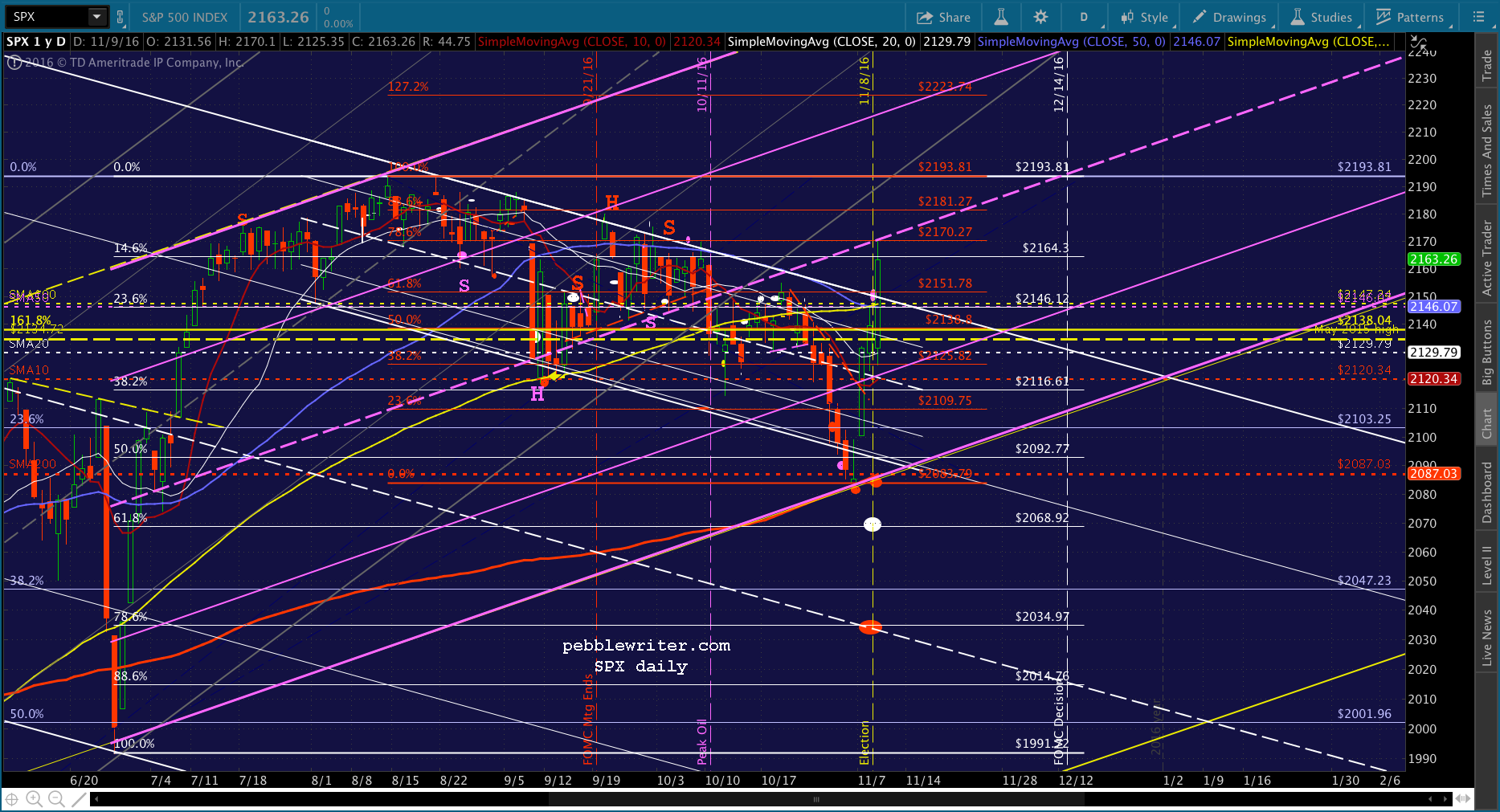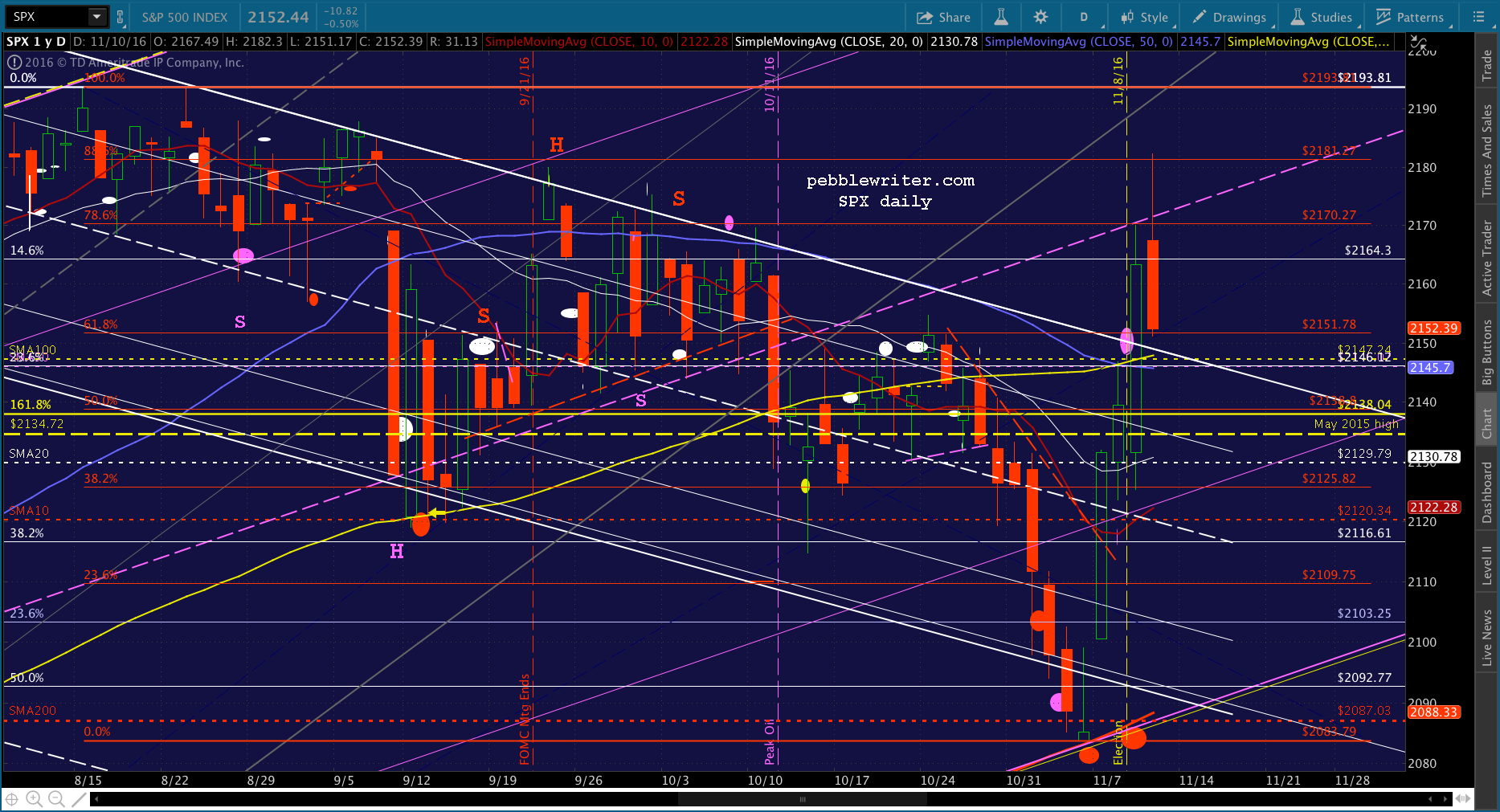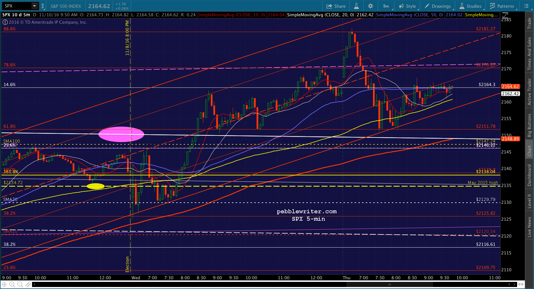 It could also drop lower than 2147.24. Note that ES, which dropped through its SMA5 200 at 2166, has its .618 down at 2129.23 which would be the equivalent of 2134 on SPX. I’ll be watching to see what happens when SPX tests the TL from Monday’s lows again.