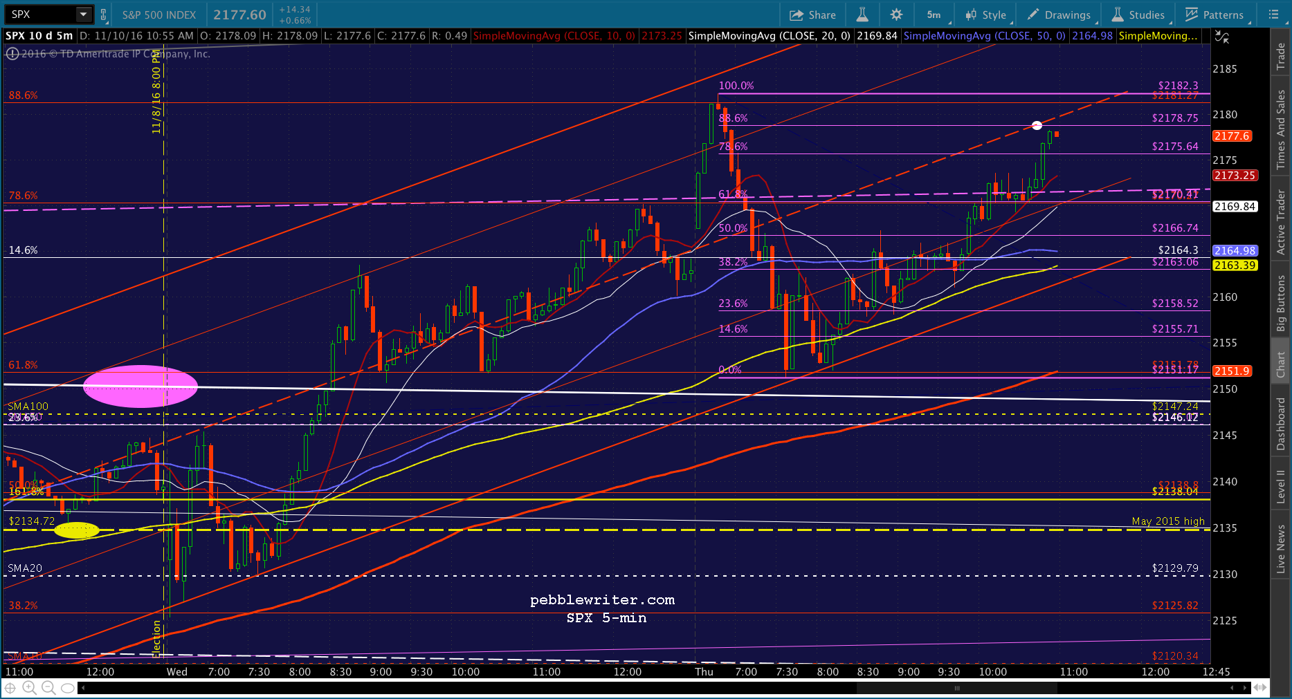 Just reached the red channel bottom. If it’s done declining, it should rebound here at 2166.31. I’d cover the short unless you’re planning on holding short overnight and can hedge or otherwise watch your position. I expect SPX to continue falling to 2148 tomorrow, so would plan on holding short.
