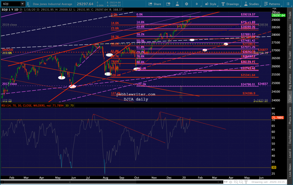 SPX’s RSI action isn’t too surprising given that SPX has pushed through several Fib resistance levels, broke out of its rising purple channel and completed an IH&S.