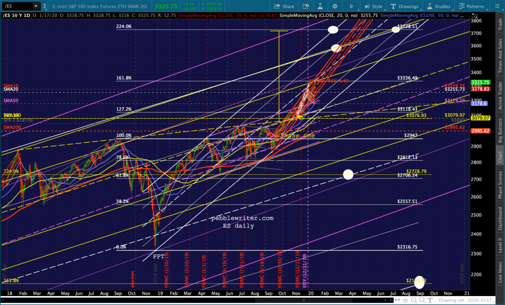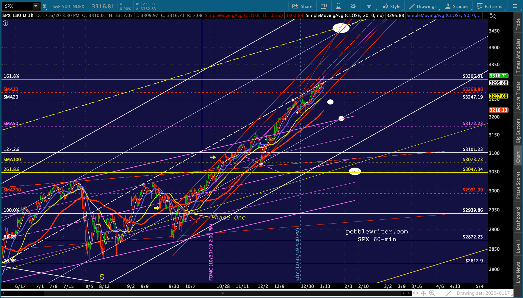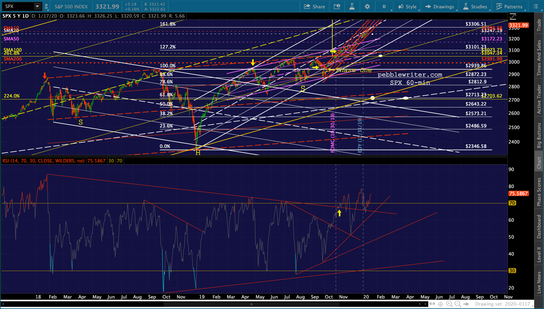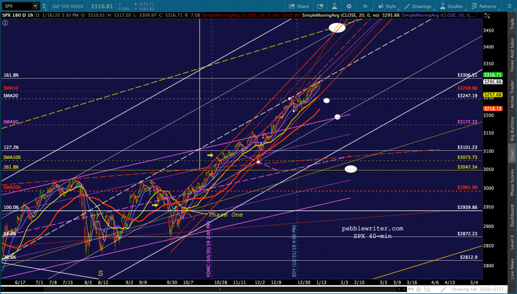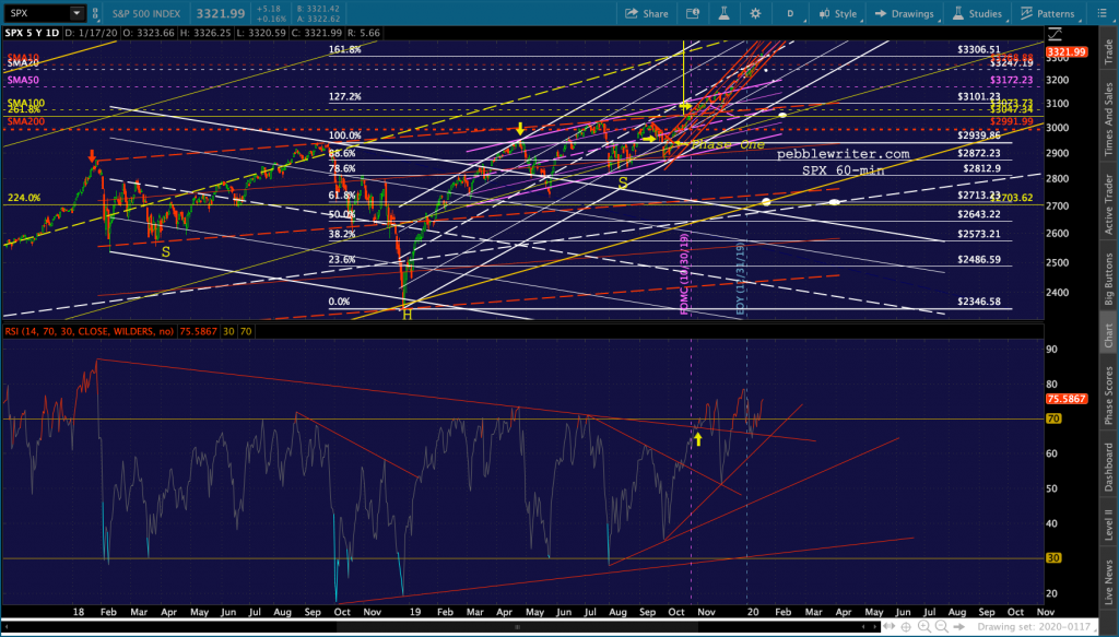 It was already elevated for SPX — though there is very obvious negative divergence in this latest leg up. Note that initial breakout above the red TL occurred when SPX popped through the 2.618 Fib at 3047.34 (the yellow arrow.)