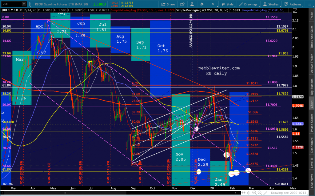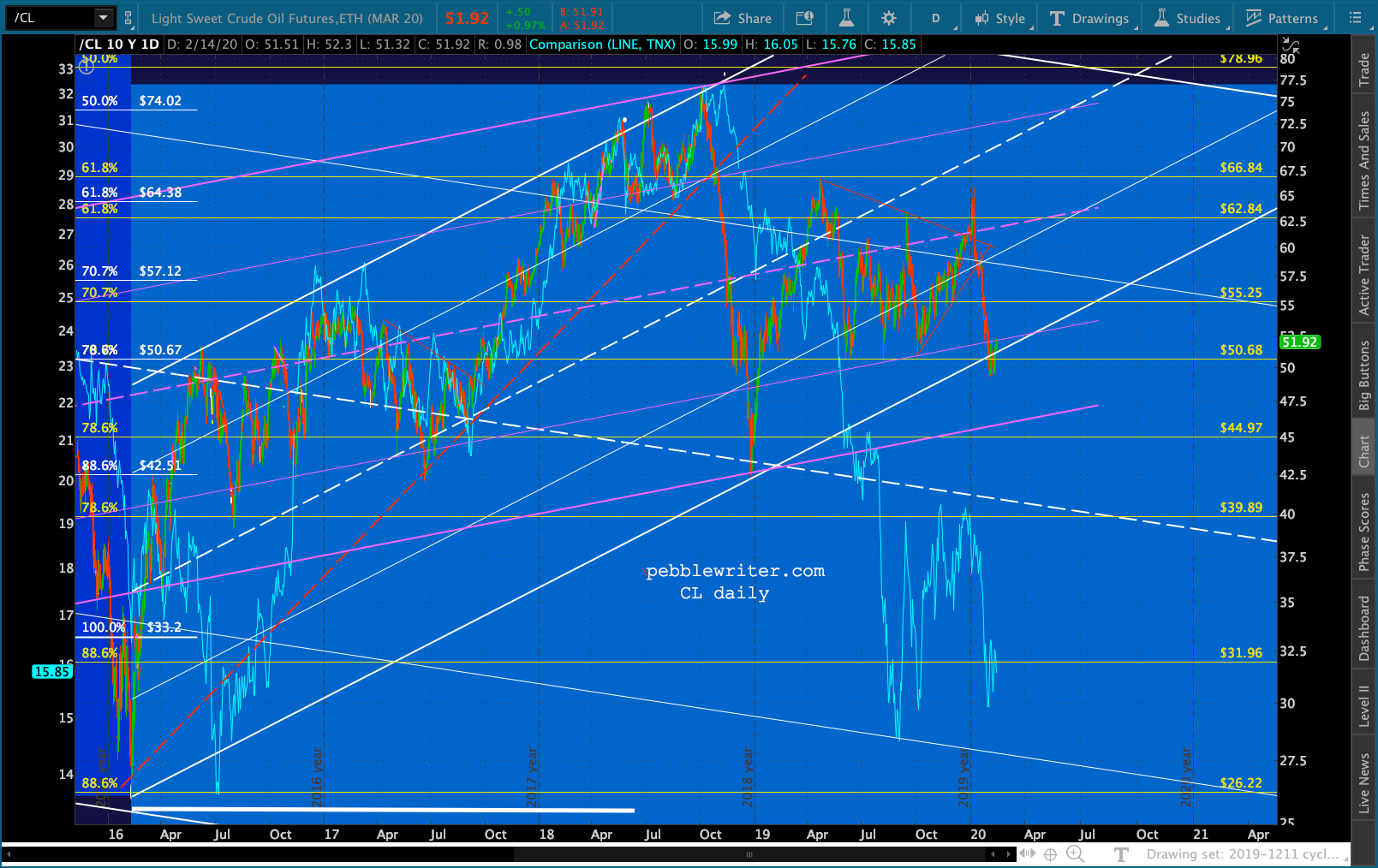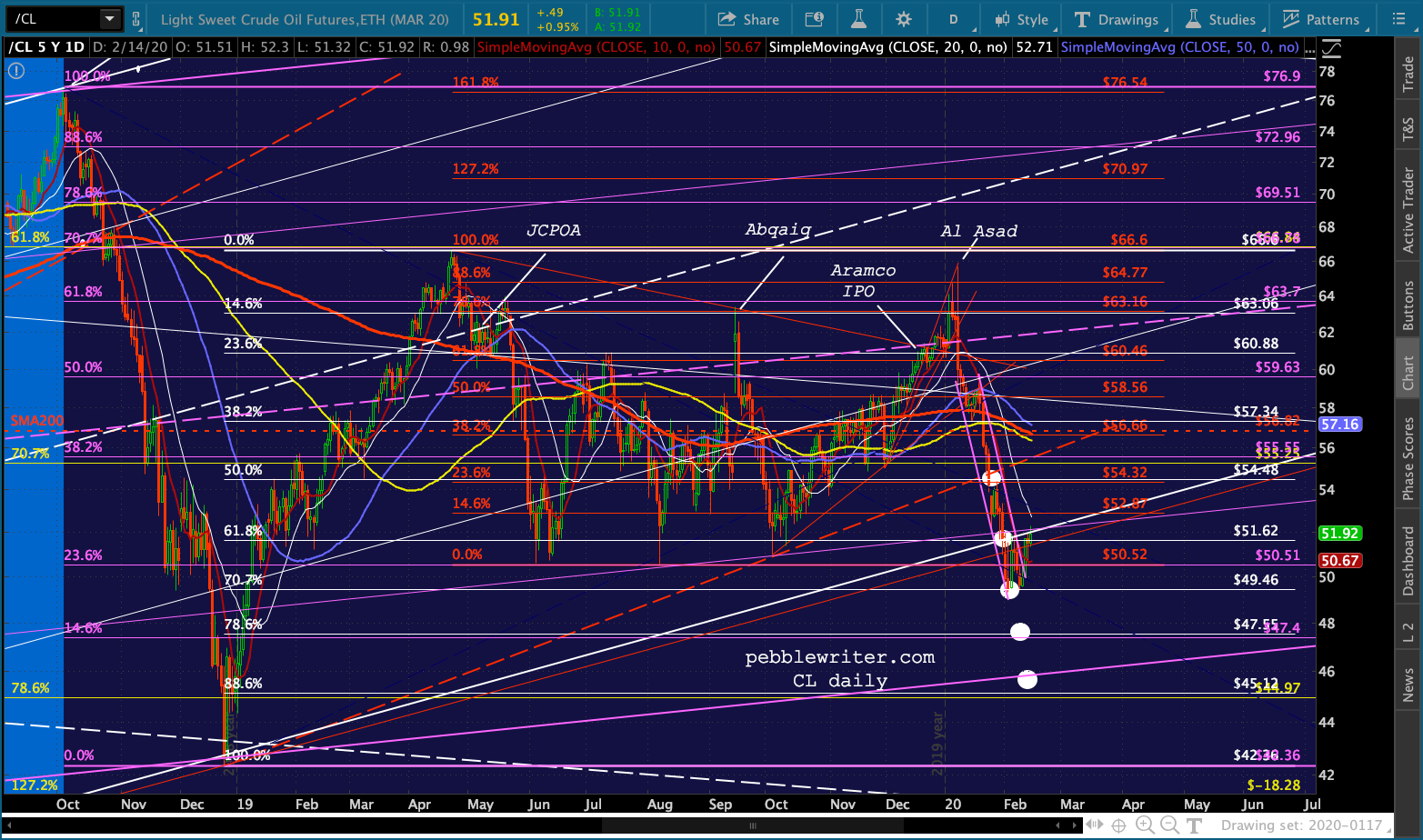 …while CL continues backtesting the white channel bottom. If it pushes through, it will have to contend with the red trend line at 54.65ish.