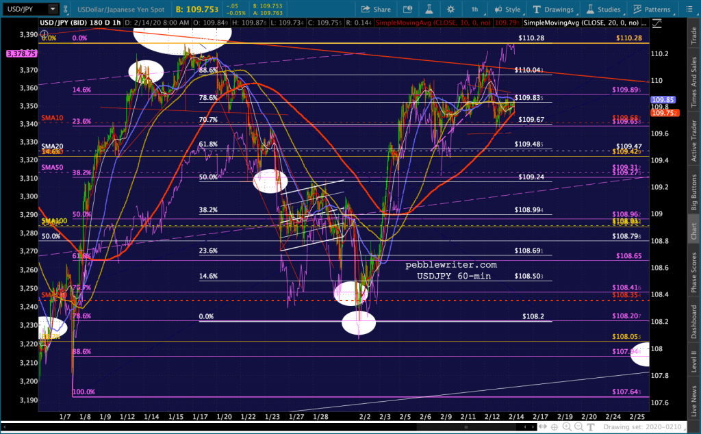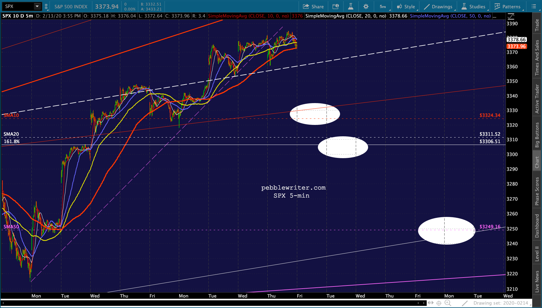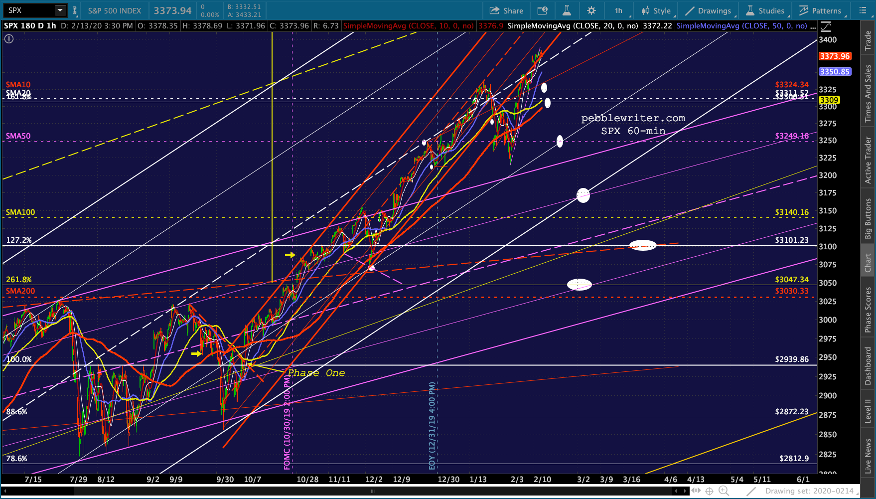 The big picture for stocks hasn’t changed. There are upside targets which have opened up as the result of “breakouts,” but IMO the breakouts are bogus. So, I’m expecting more downside, with ES’ SMA10 having reached the white 1.618 at 3336.49 and SPX’s SMA20 having reached its 1.618 at 3306.51.
