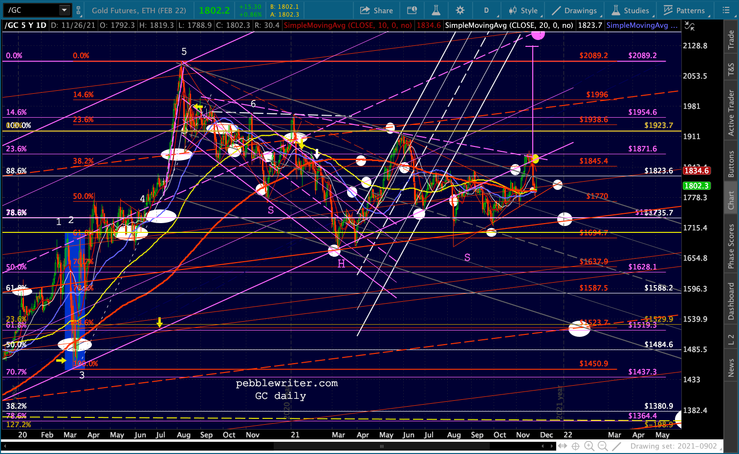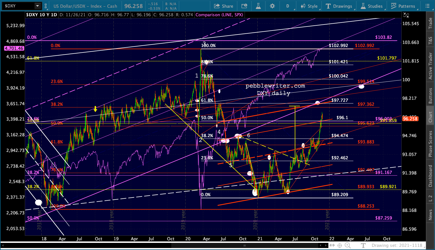 CL’s near backtest of the channel top has turned into a hard test, with the .618/SMA200 looking fairly likely. I had expected it to wait for the two to converge nearer the channel top, but at -7% already, it might not wait at all. Certainly central banks will be egging on this correction – now at 15% from the recent highs.