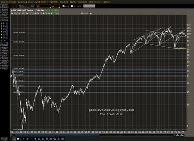 I've been doing a little doodling myself today. I've come across a bunch (tons) of charts which all exhibit the same behavior. Take a four year daily chart, log scale. Draw fib fan lines from March 09 low to May 10 (ish) high. That will create the top of the wedge. For the bottom, draw a trend line up from August 11 low. Perhaps this is just highlighting what you mention above but I thought it interesting how the fib lines drew half the wedge.