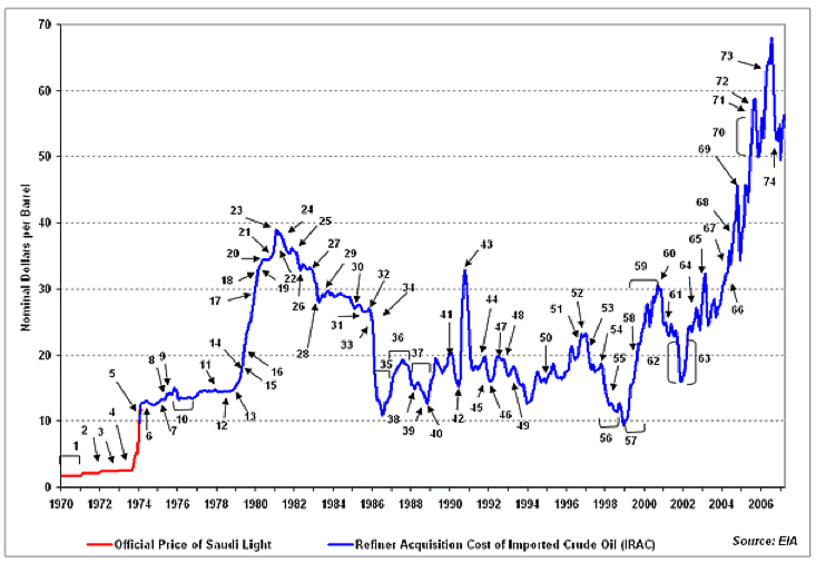 We had a decade-long war in Vietnam and an oil shock when OPEC imposed an embargo in response to our military support of Israel in the Yom Kippur War. Oil prices went from $3/bbl in 1970 to nearly $40 in 1980. The following chart, from the EIA and posted on Wikipedia, shows the blow by blow. (For history buffs, there’s an interesting chronology available here.)
