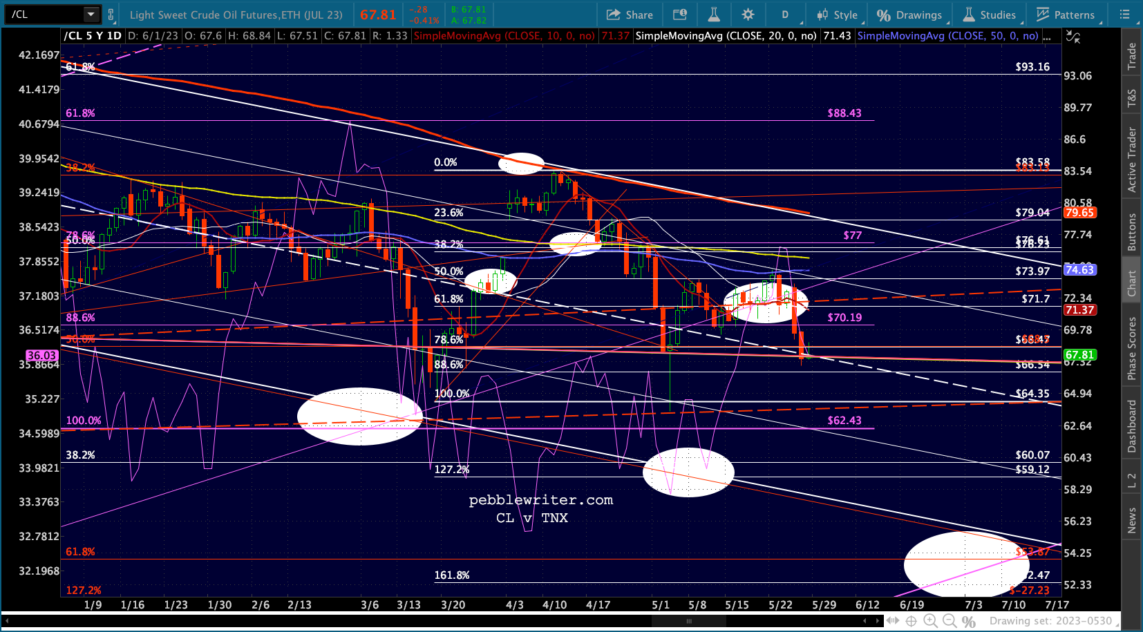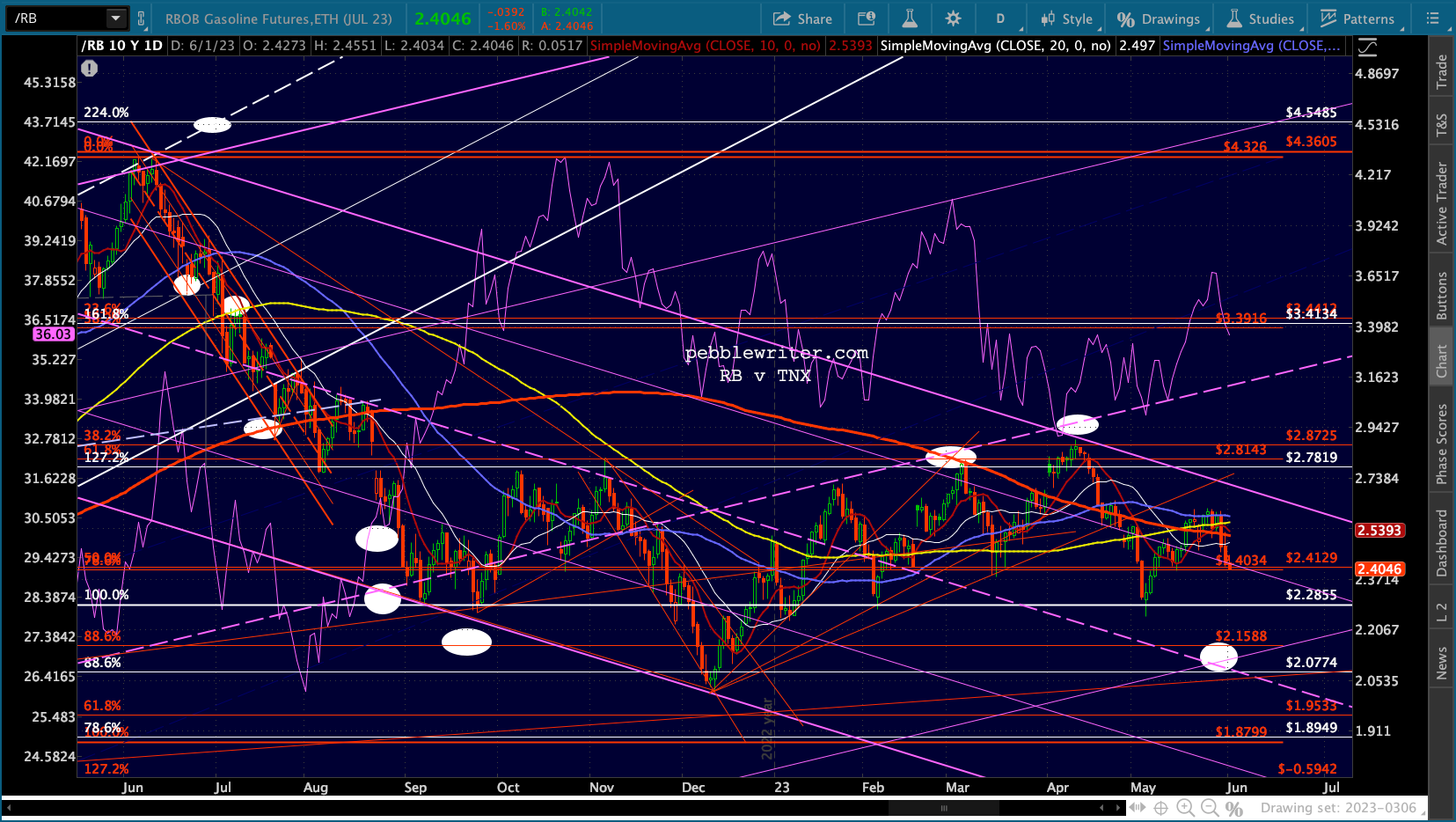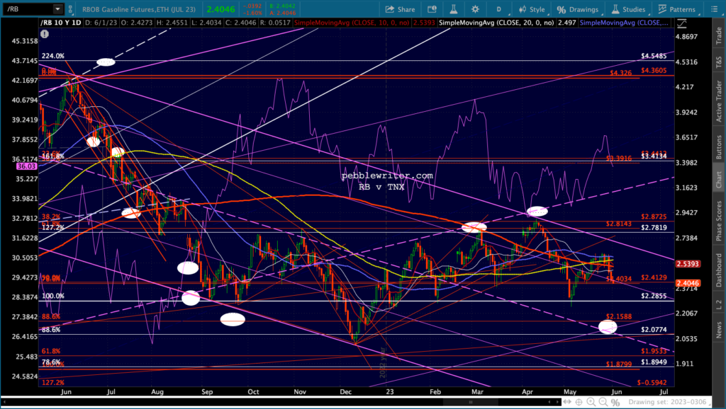 CL continues to make new lows after having fallen through all MAs and seeing its SMA10 drop through its SMA20 again. RB is off much more, and similarly has little support in this range.