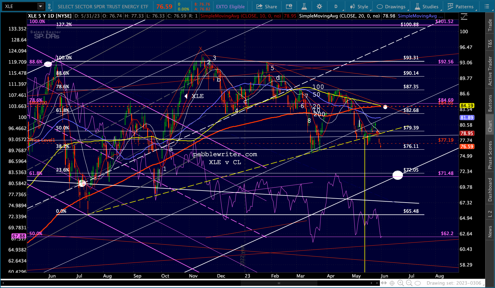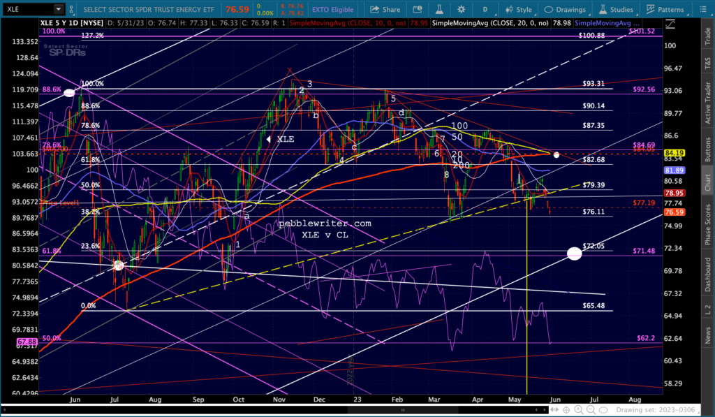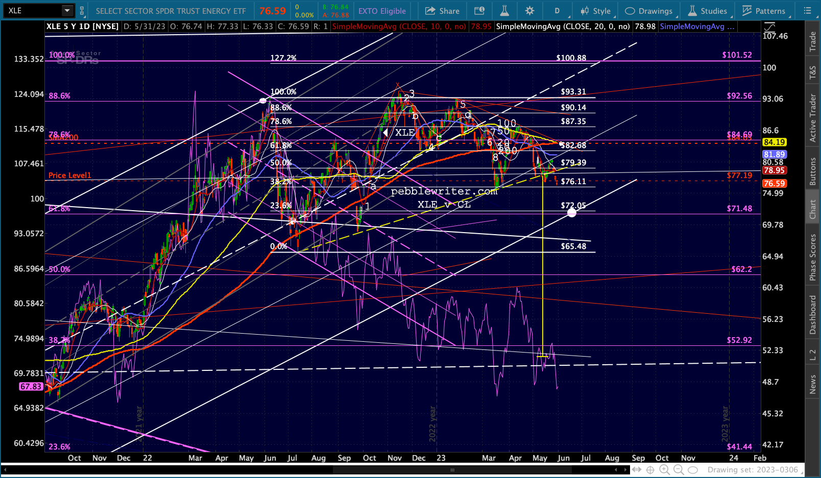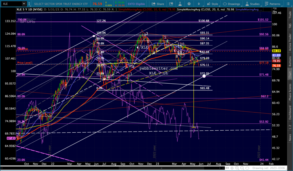 Needless to say, this puts additional pressure on XLE, which is making new lows after falling through the yellow neckline. I’m very uncomfortable suggesting it will fully play out. But, the bottom of the white channel is definitely in play.