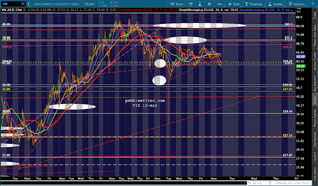 For now, the algos continue to follow VIX’s lead. A drop through the SMA5 200 would point to a test of the SMA20 and red neckline at 58.60. A drop through it would unleash the bulls for another leg up.