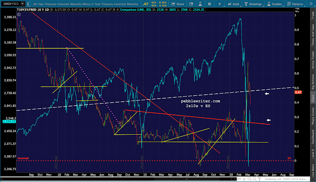 Perhaps significantly, ES failed to retake the yellow neckline at 2568ish despite the usual smackdowns in VIX and 2s10s. The 2s10s dropped back through the white TL support which has been the last line of defense for bulls…