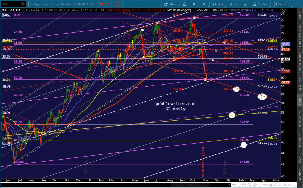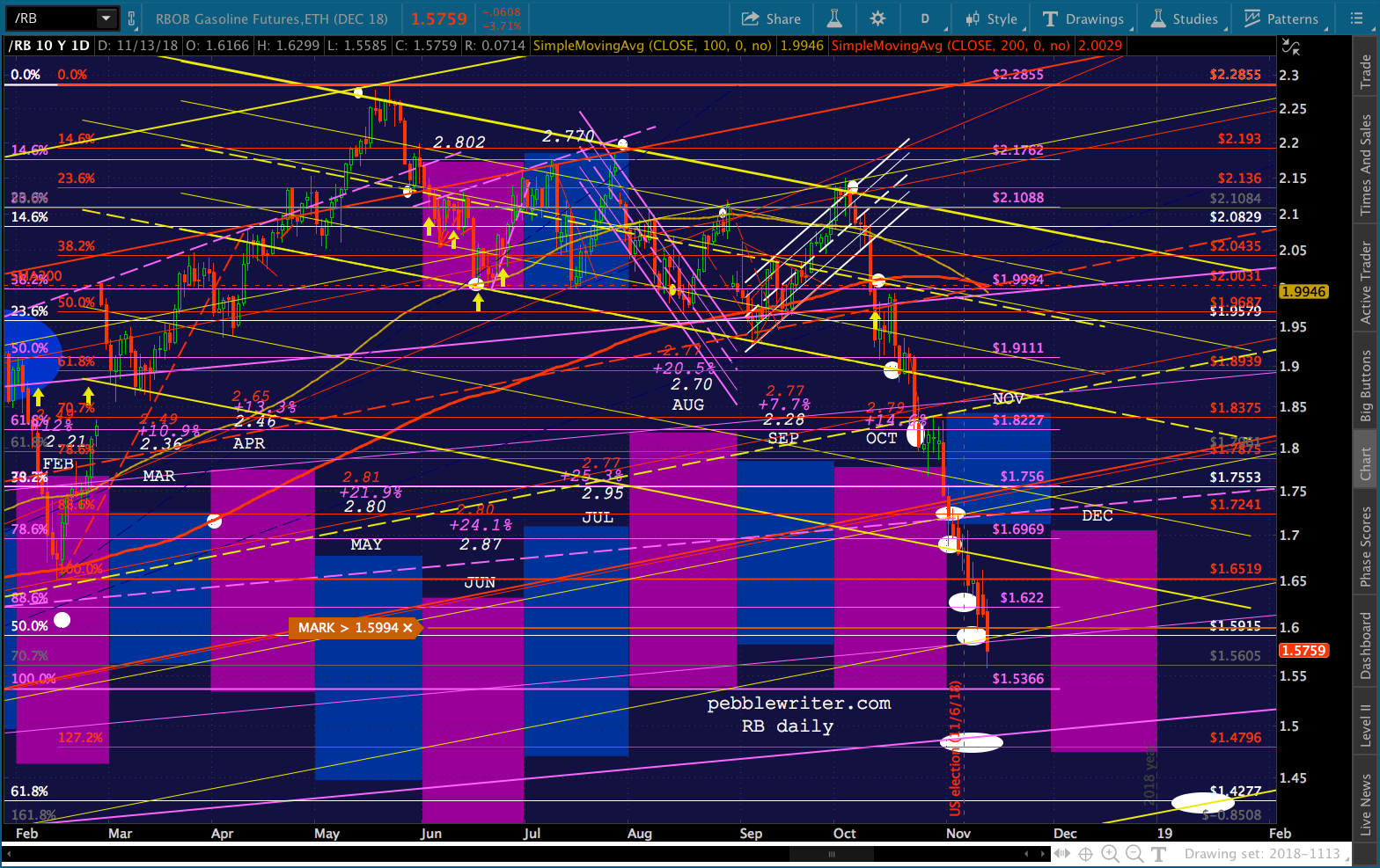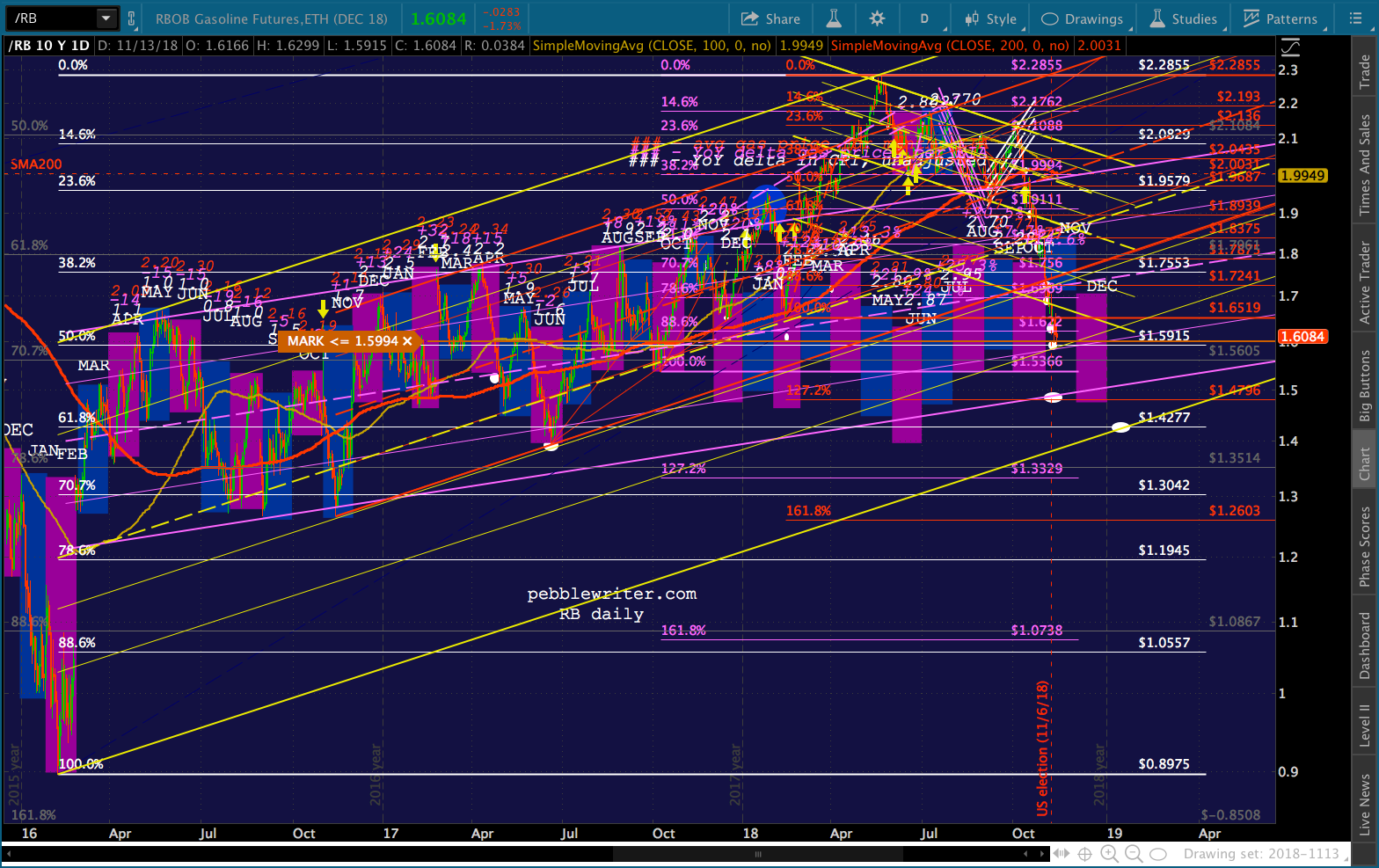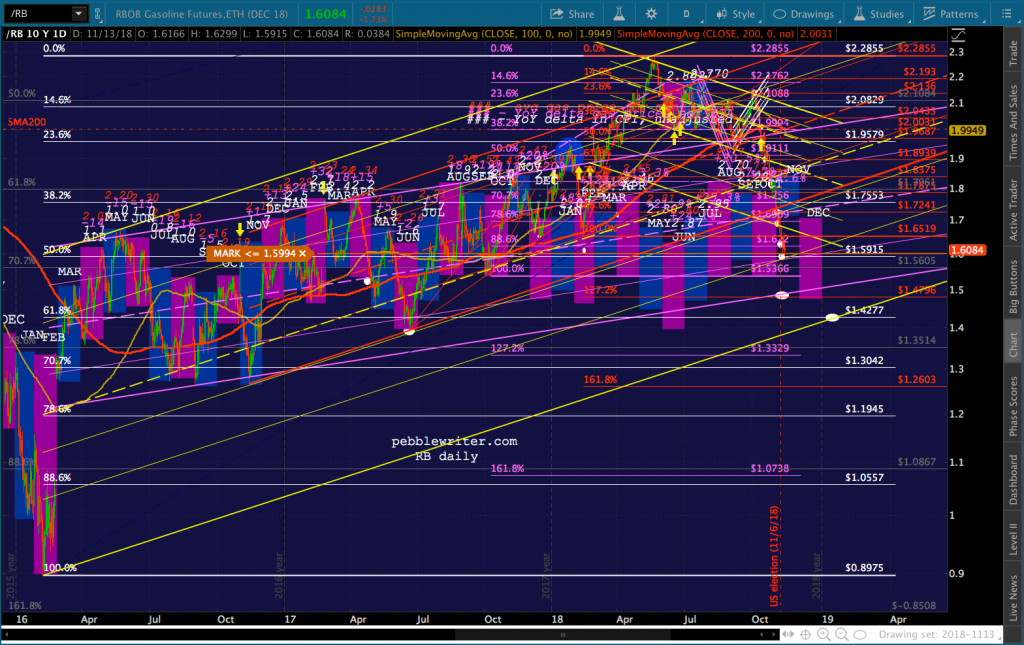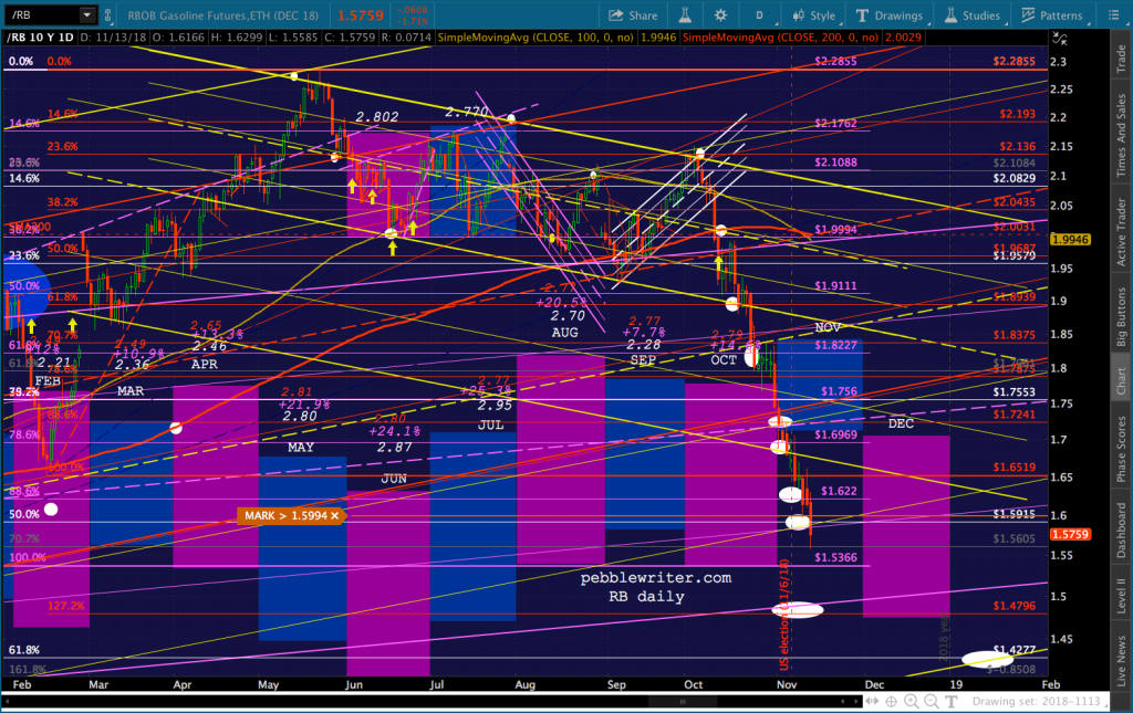 While those lower levels are perfectly legit, the original placement assumed the falling channels could keep it together. If CL’s falling red channel fails, we could get a quick downdraft to 57.47, 51.47 and even 45.47. Ditto for RB and its falling yellow channel — which has already broken down — and 1.4796 and 1.4277.