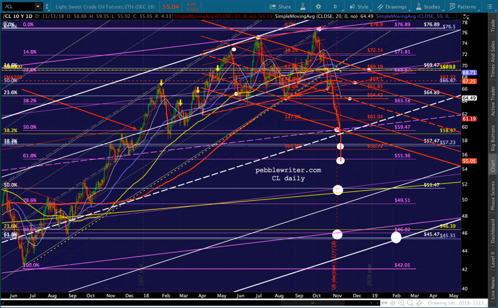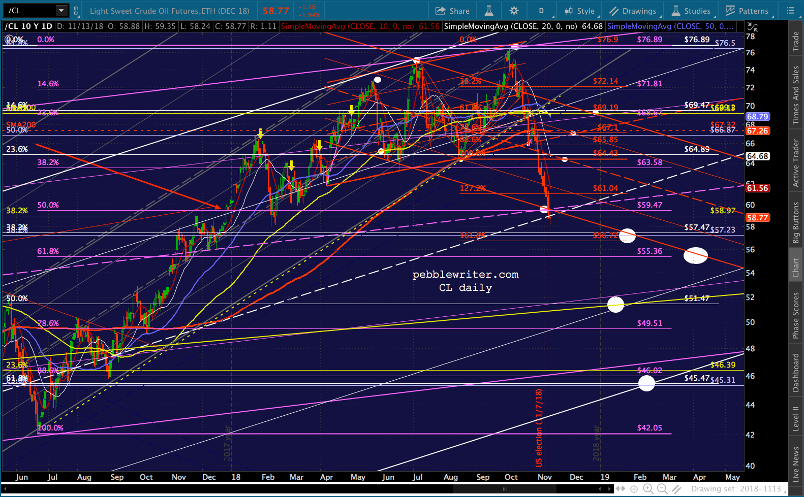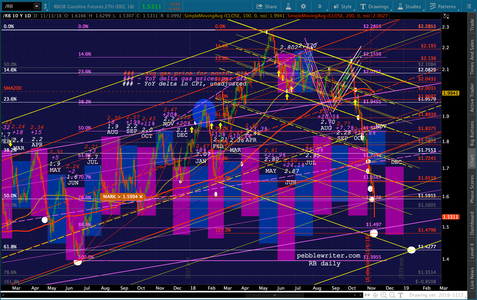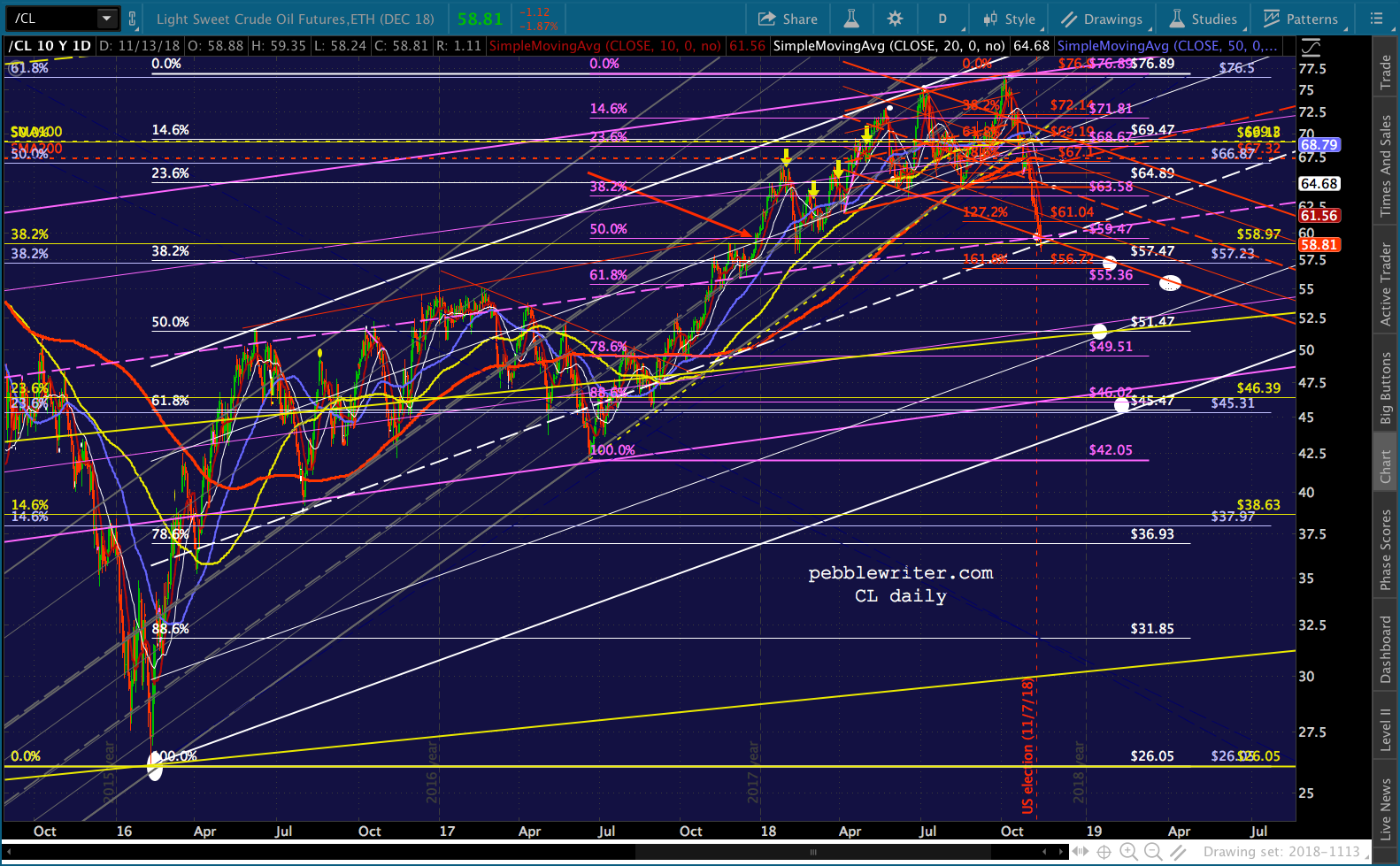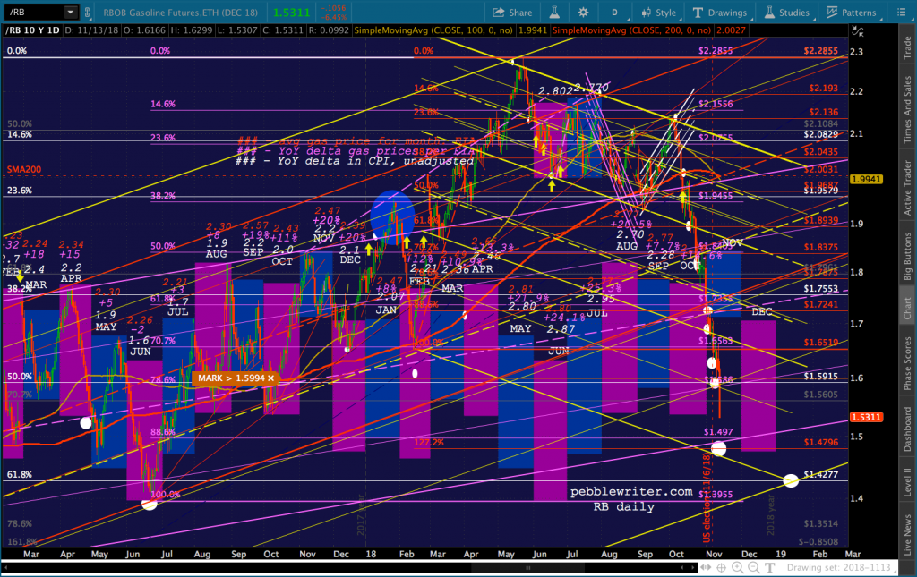 While those lower levels are perfectly legit, the original placement assumed the falling channels could keep it together. If CL’s falling red channel fails, we could get a quick downdraft to 57.47, 51.47 and even 45.47. Ditto for RB and its falling yellow channel — which has already broken down — and 1.4796 and 1.4277.