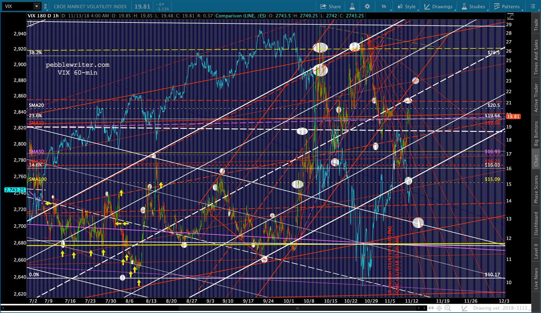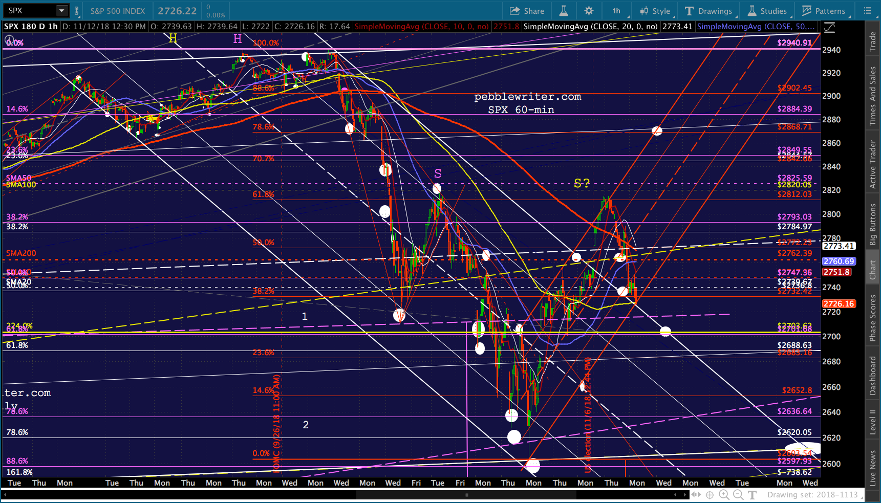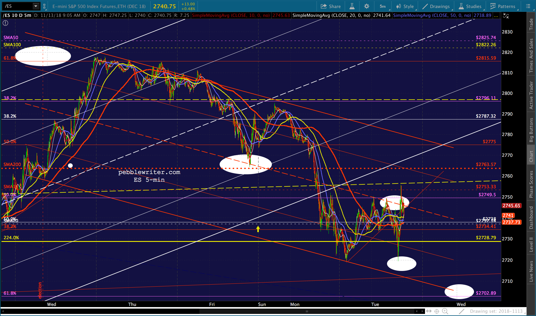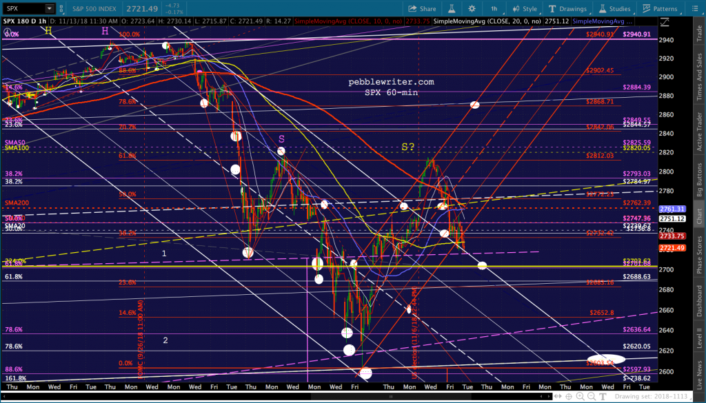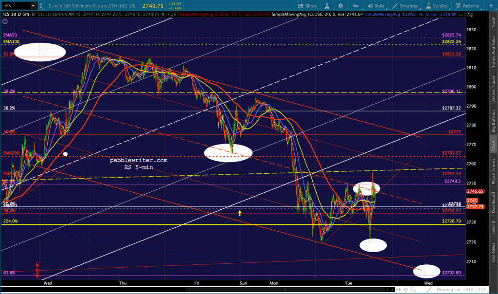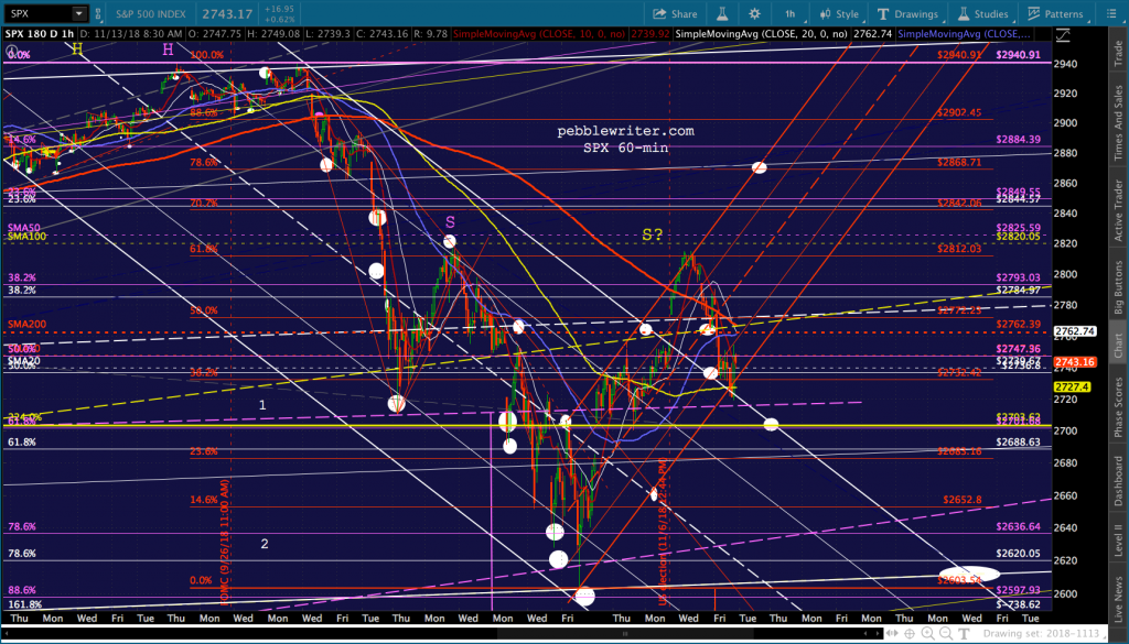 A bit of a wild ride, today, as ES reached our initial target and then bounced 35 points. It is now perched above the red TL while SPX is hanging out just below its SMA10. This feels more like a delay than a reversal with legs. But, keep an eye on USDJPY and VIX for confirmation.
