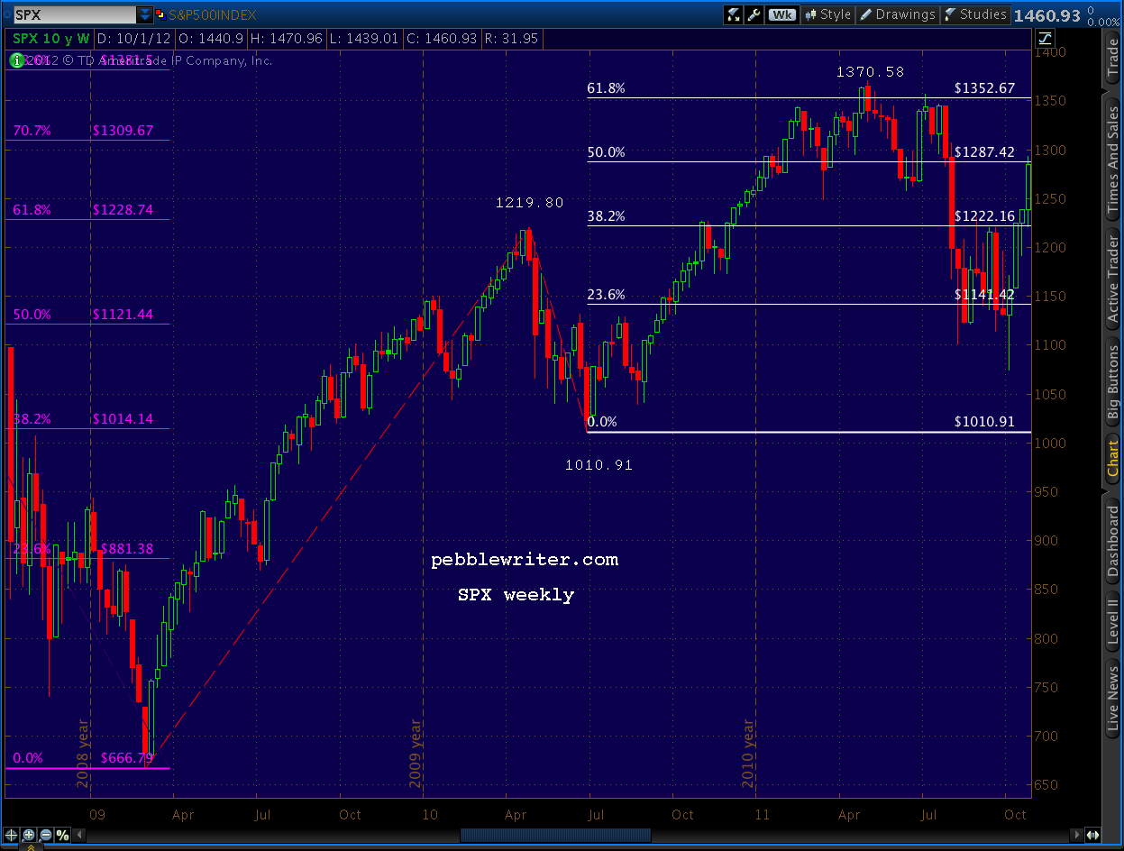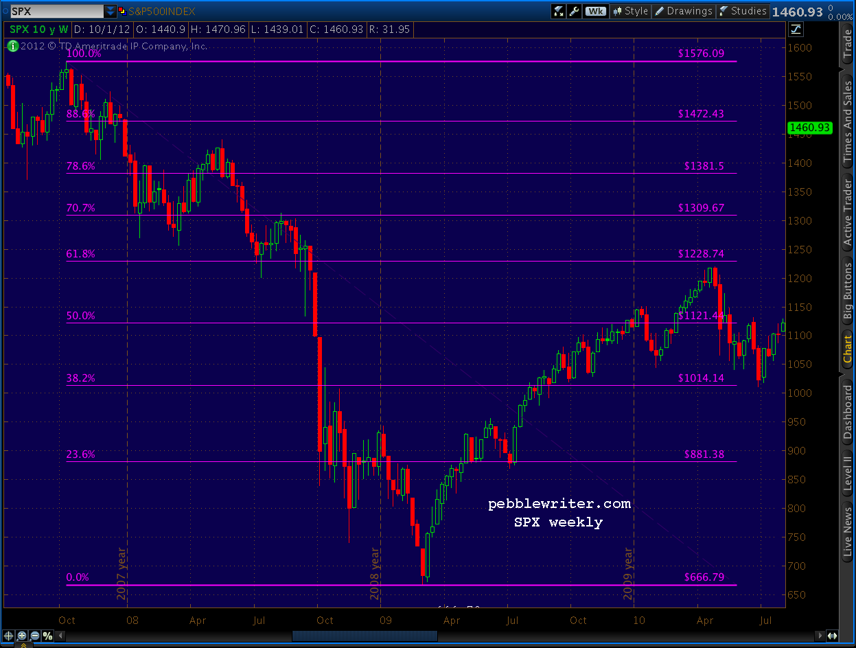Interestingly, the gains to the next peak of 1370 in May 2011 were 61.8% of the previous 666-1219 move. [This was also within 11 points of the Fibonacci 78.6% retracement of the 1576-666 plunge for a well-formed Gartley Pattern — kick-starting my fascination with harmonic patterns and giving birth to the original pebblewriter blog.]