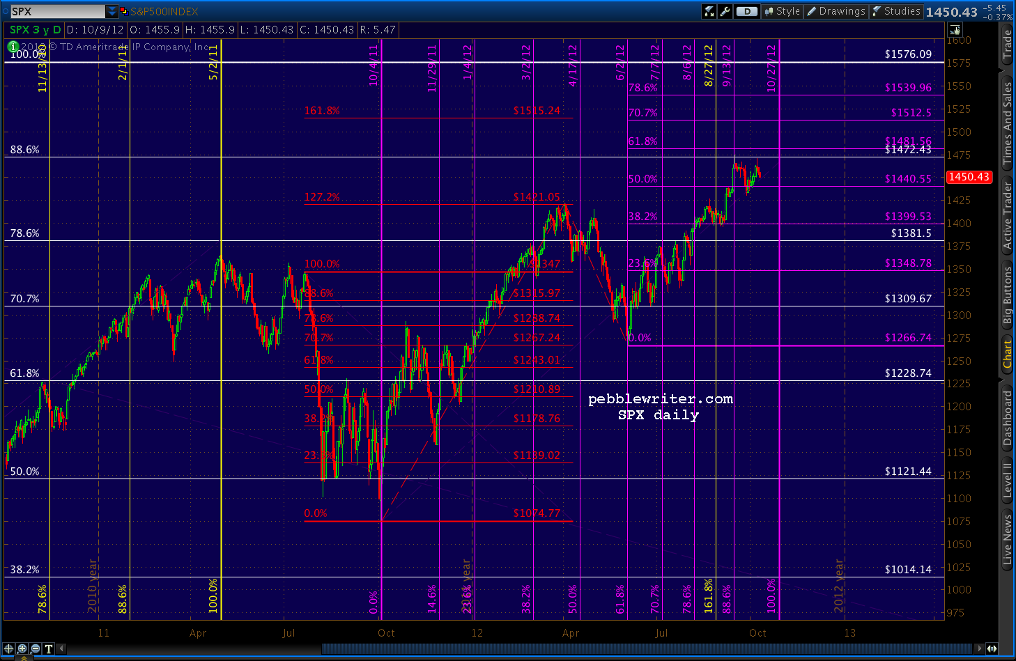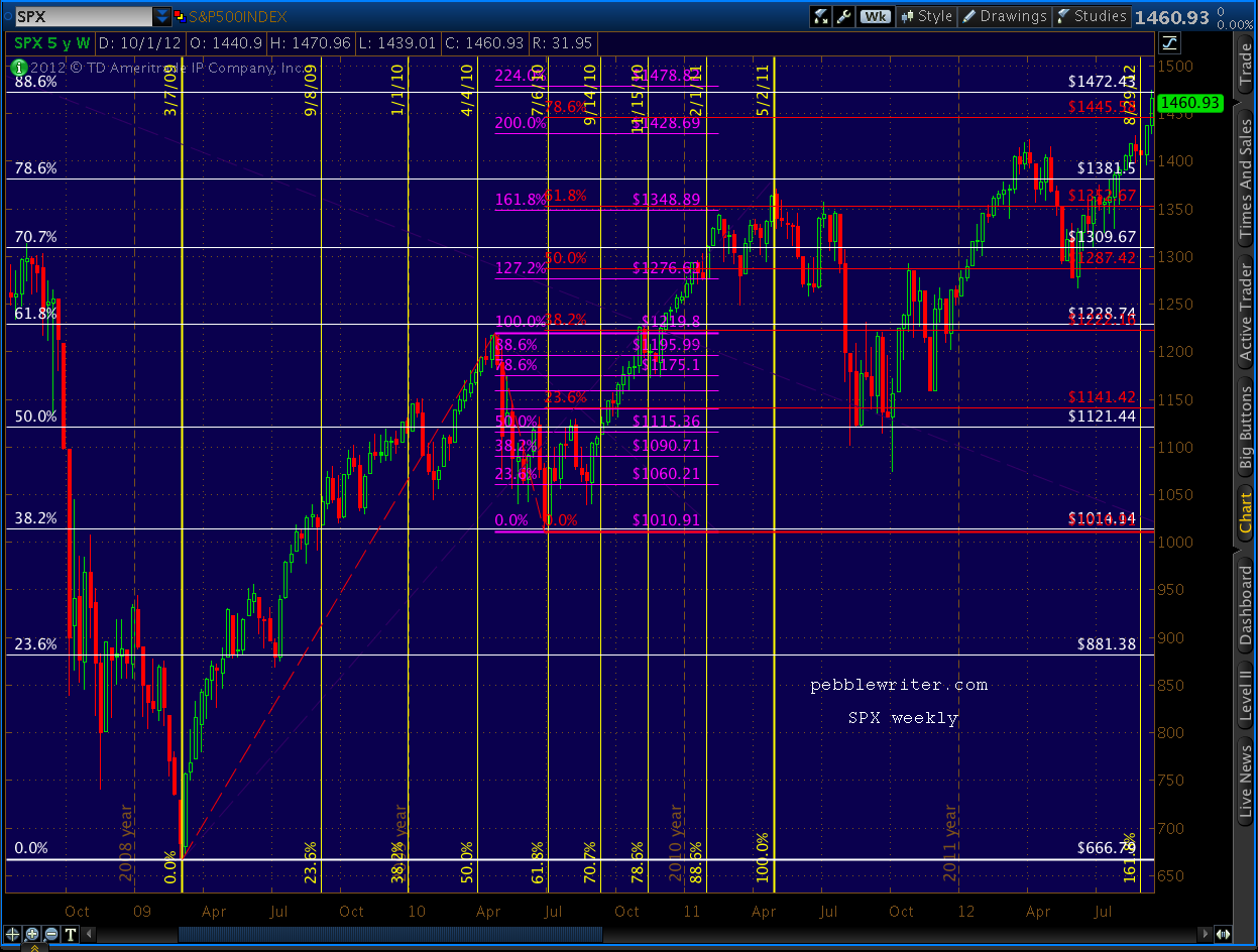 Note that upon reaching 1344 in February 2011, SPX also completed a Crab Pattern at the 1.618 (shown in purple below.) And, if we apply Fib time ratios to the move from Mar 2009 to the eventual high of May 2, 2011, we can see even more interesting coincidences. Most important interim highs and lows occurred around key Fibonacci dates.