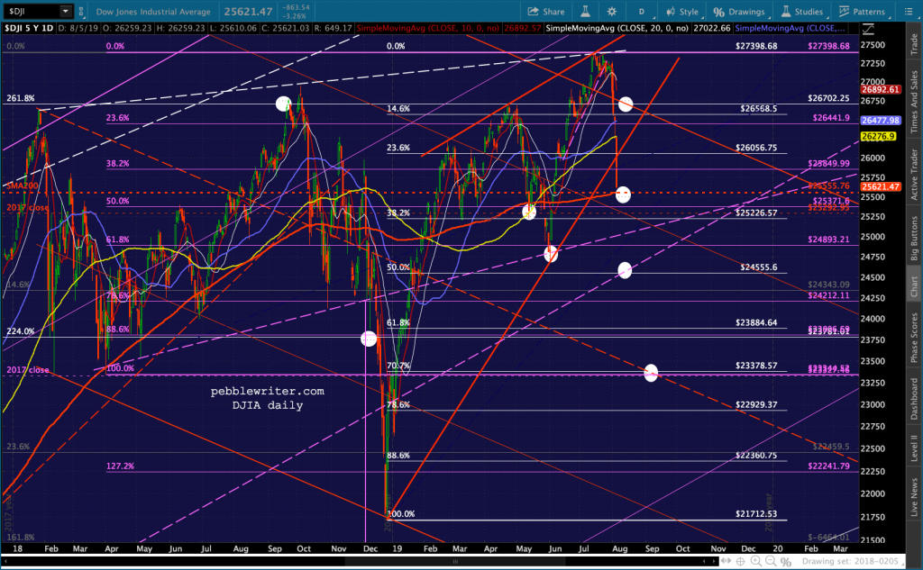 An example is the Aug 14 low. The model suggested 2856.42. But, I felt a turn at the red .618 would be more logical and drew the analog path to reflect that level, leaving the white dot as a reference for how well the model is working.