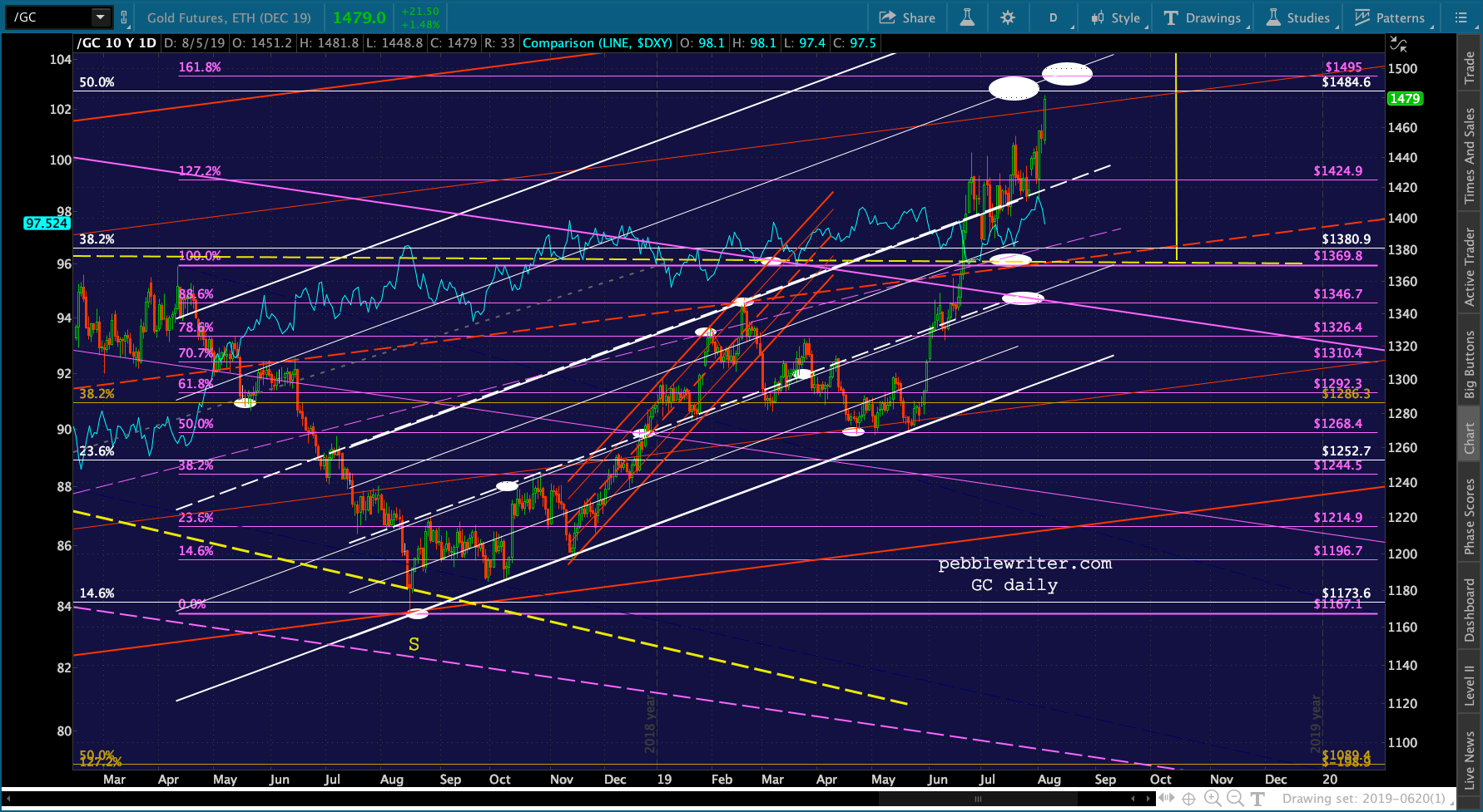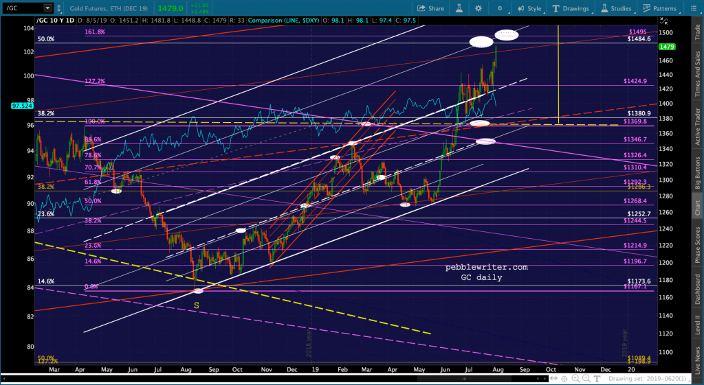 And, a quick glance at gold — almost to the .500 Fib at 1484.60, with a secondary target of 1495.