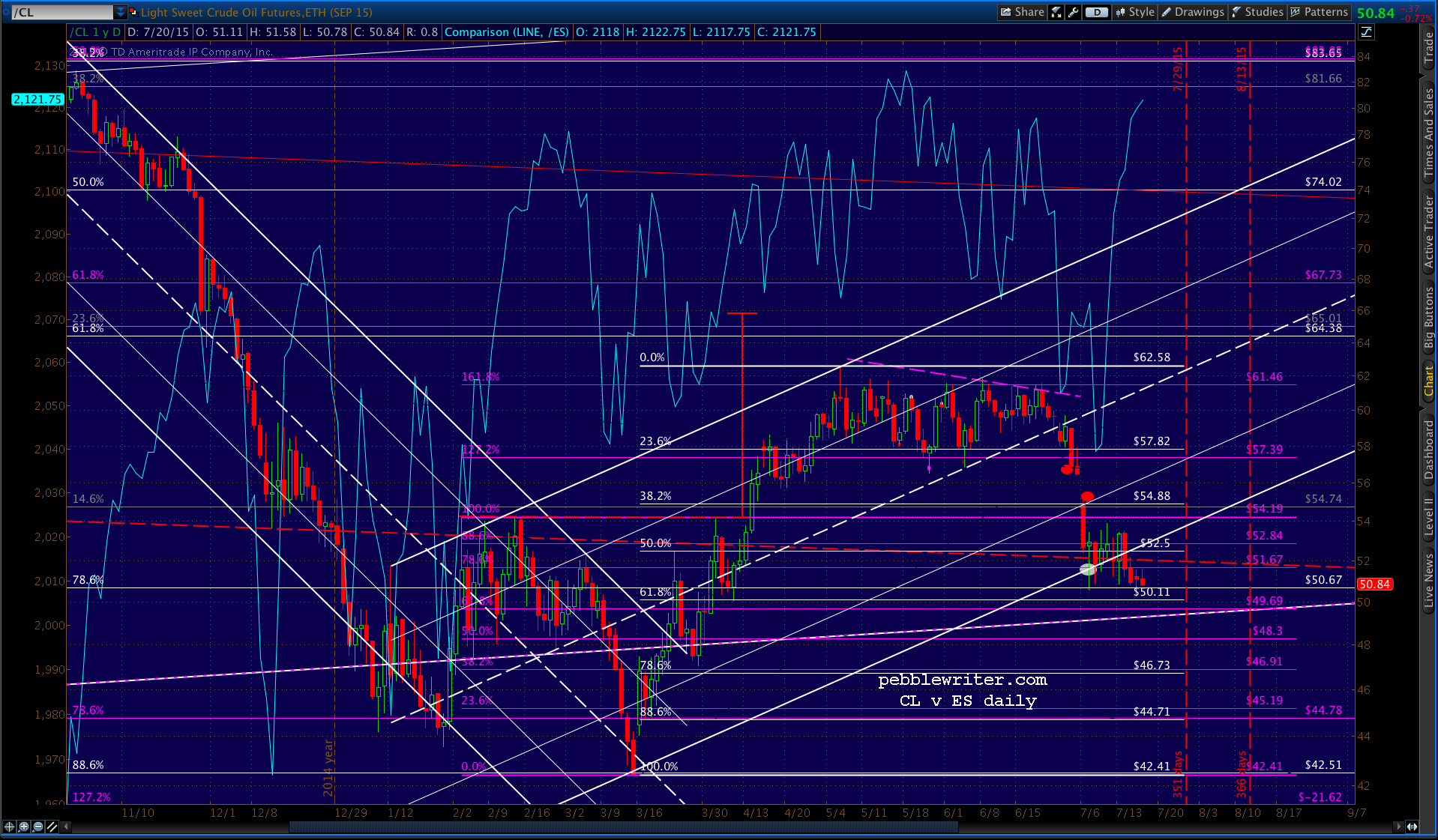 And, as we noted last week, CL’s rising white channel has officially died. Though, given the fact that it’s loitering just above the .618 at 50.11, I wouldn’t write off a Lazurus-like recovery just yet. A strong bounce would be an effective tool to drive stocks higher or, at least, prevent a drop.