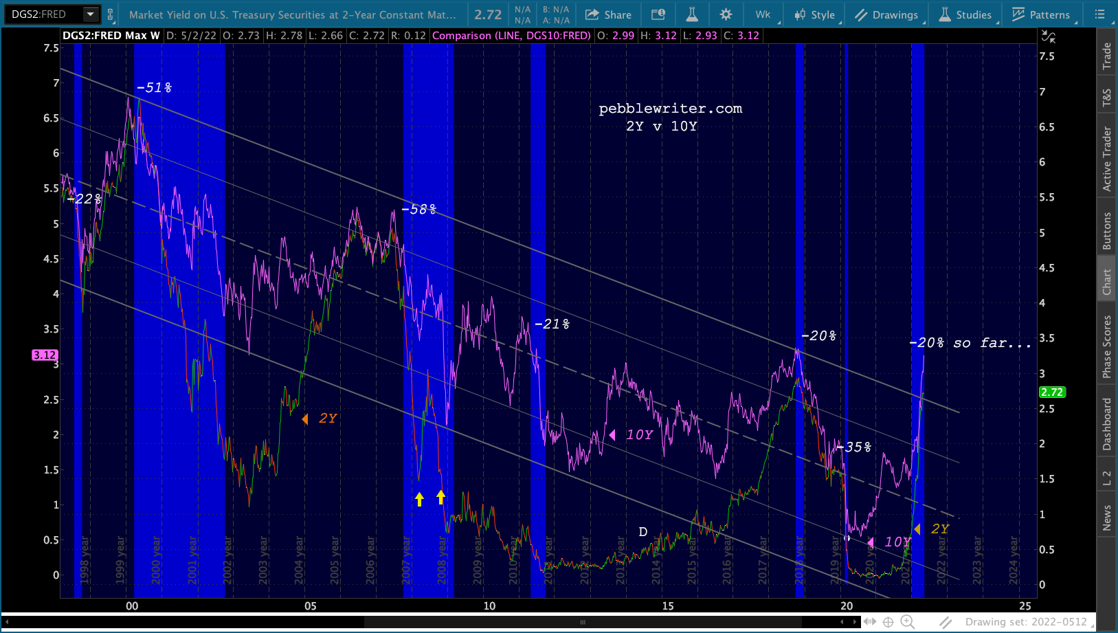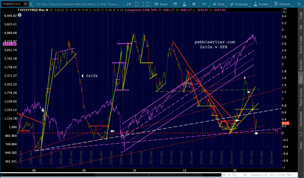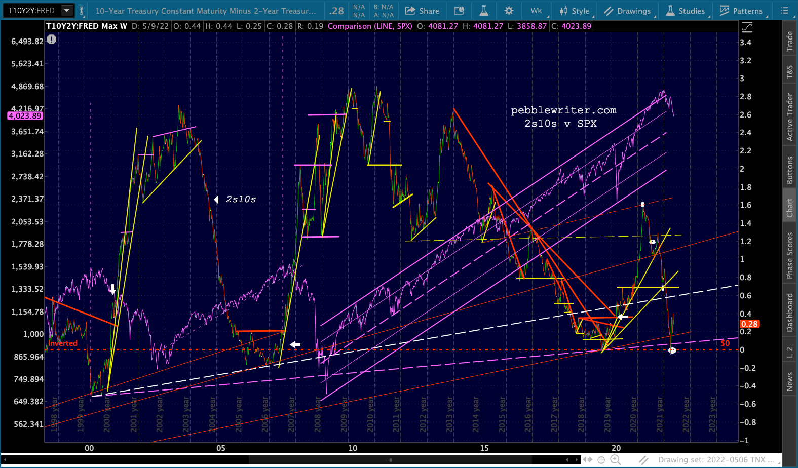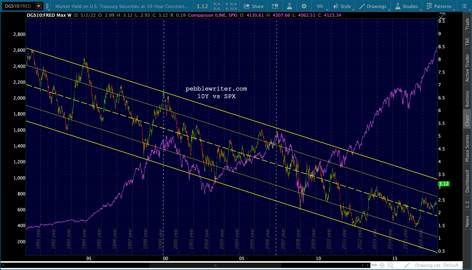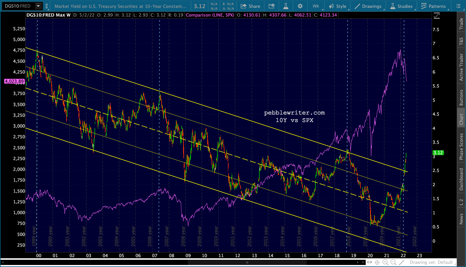 There are big differences, as well. There was no ZIRP back in 2000. The 10Y reached 6.8%. Note, however, that SPX topped out when rates reached the top of the falling yellow channel.