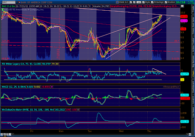 As can be seen in this chart, the stock broke though overhead resistance in the form of a TL that’s kept it down for 7 days. But, in so doing, it runs smack dab into heavier resistance in a TL that dates back to Jun 29.