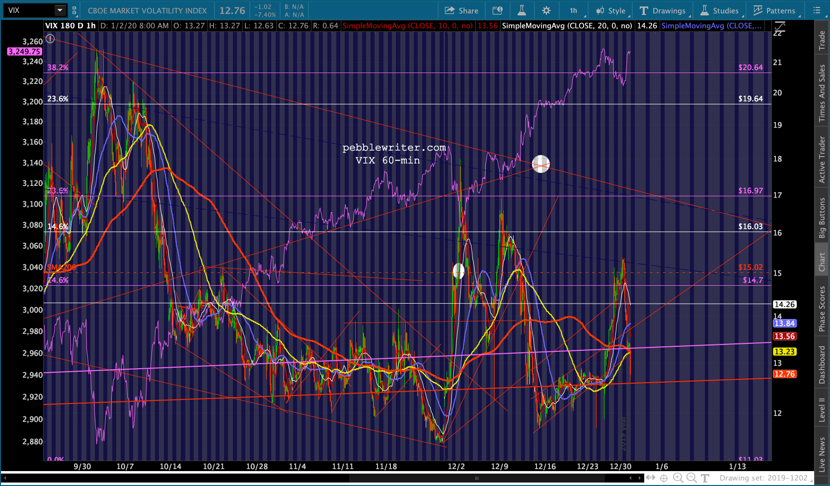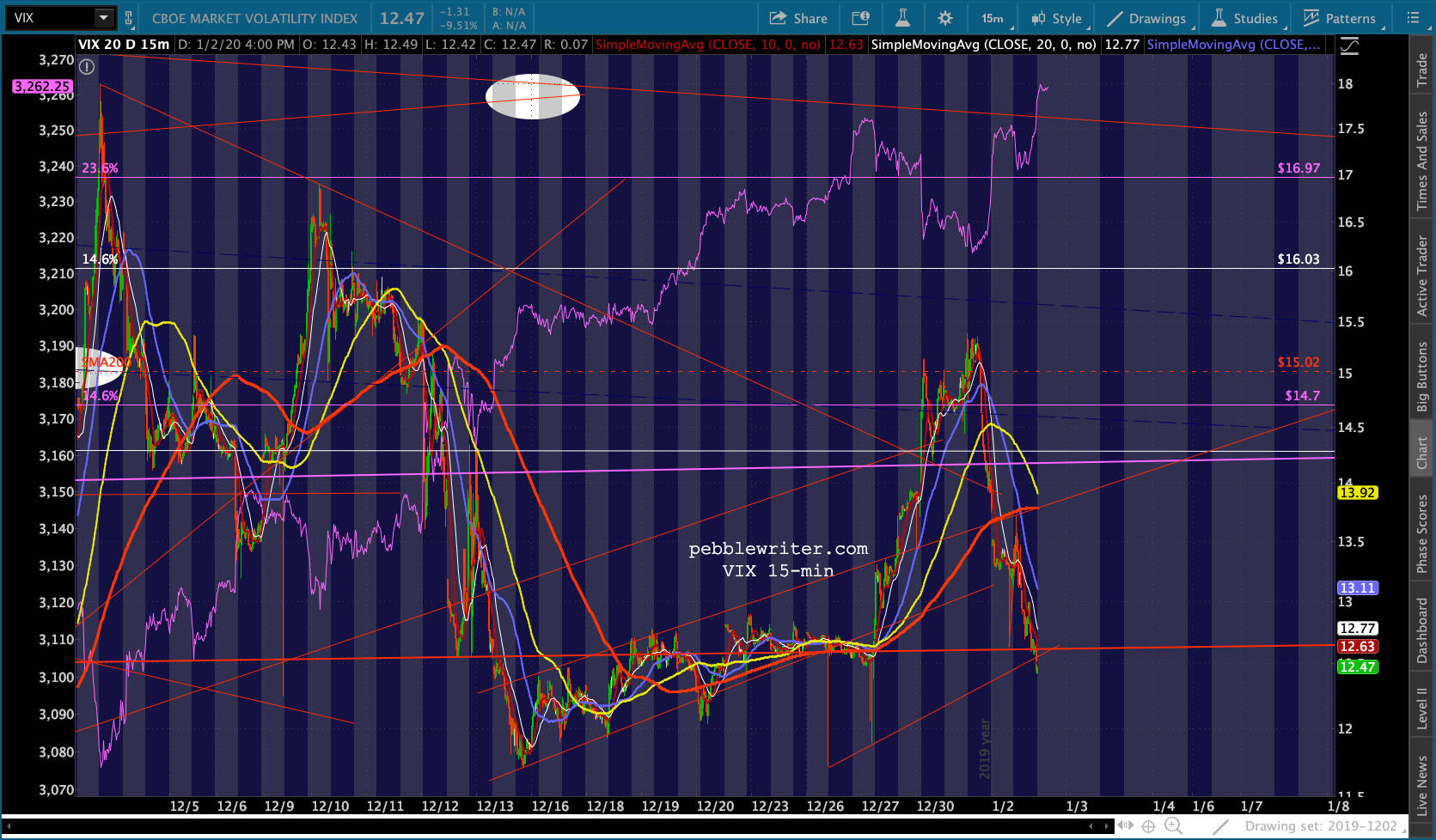 continued for members…VIX’s bigger picture charts show how important this morning’s lows are to the algos. It was a very precise tag which needs only to drop a tiny bit lower to drive stocks to new all-time highs.