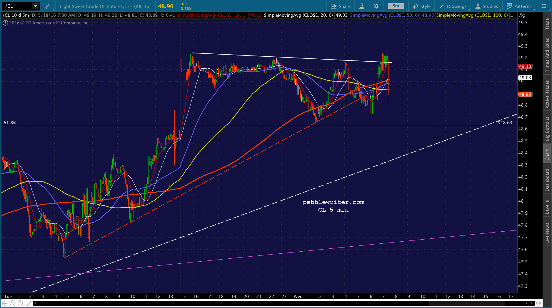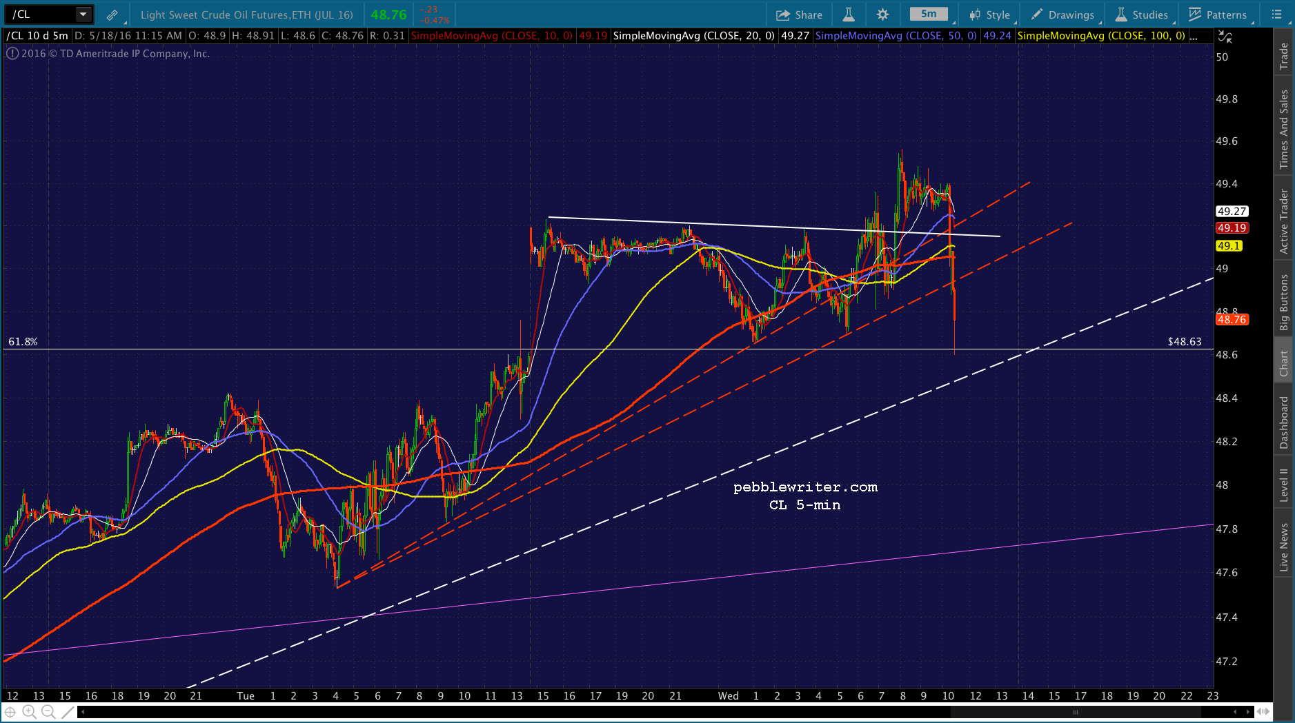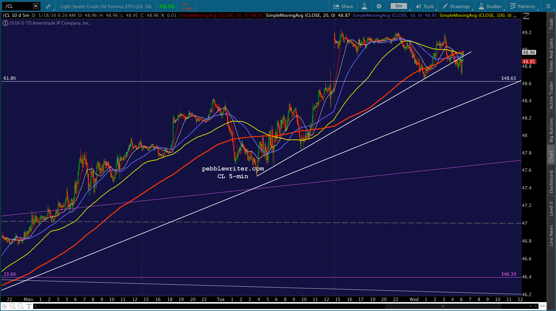 The EIA inventory report is due out in minutes. CL is acting as though it’s not sure, so my gut tells me it won’t be positive. Might be looking to short at the SMA5 100 or 200 on any weakness.