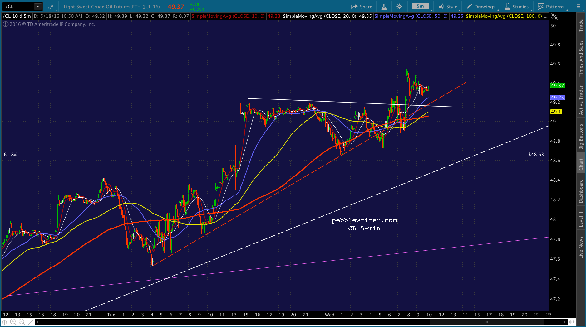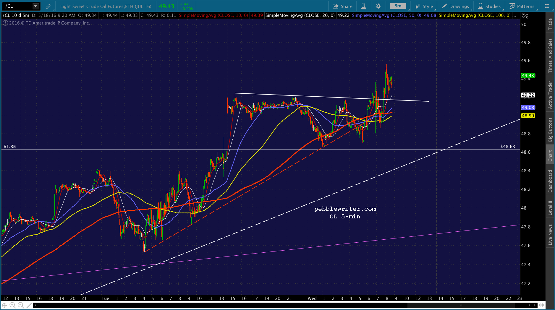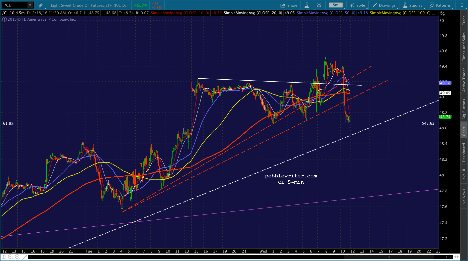 The EIA inventory report is due out in minutes. CL is acting as though it’s not sure, so my gut tells me it won’t be positive. Might be looking to short at the SMA5 100 or 200 on any weakness.