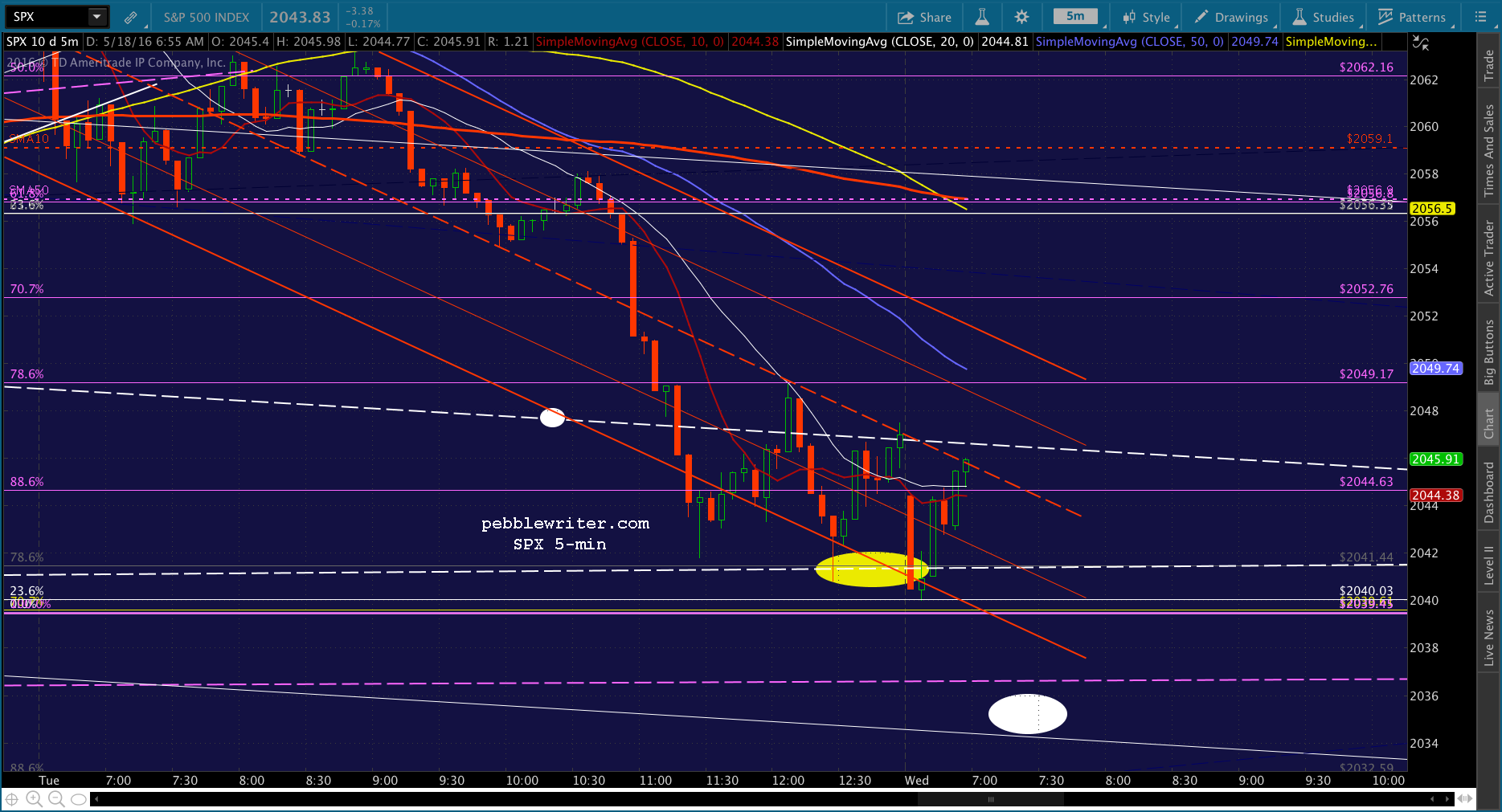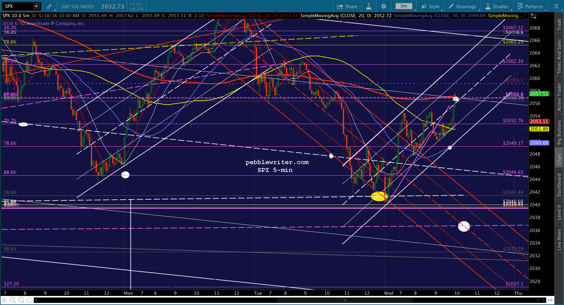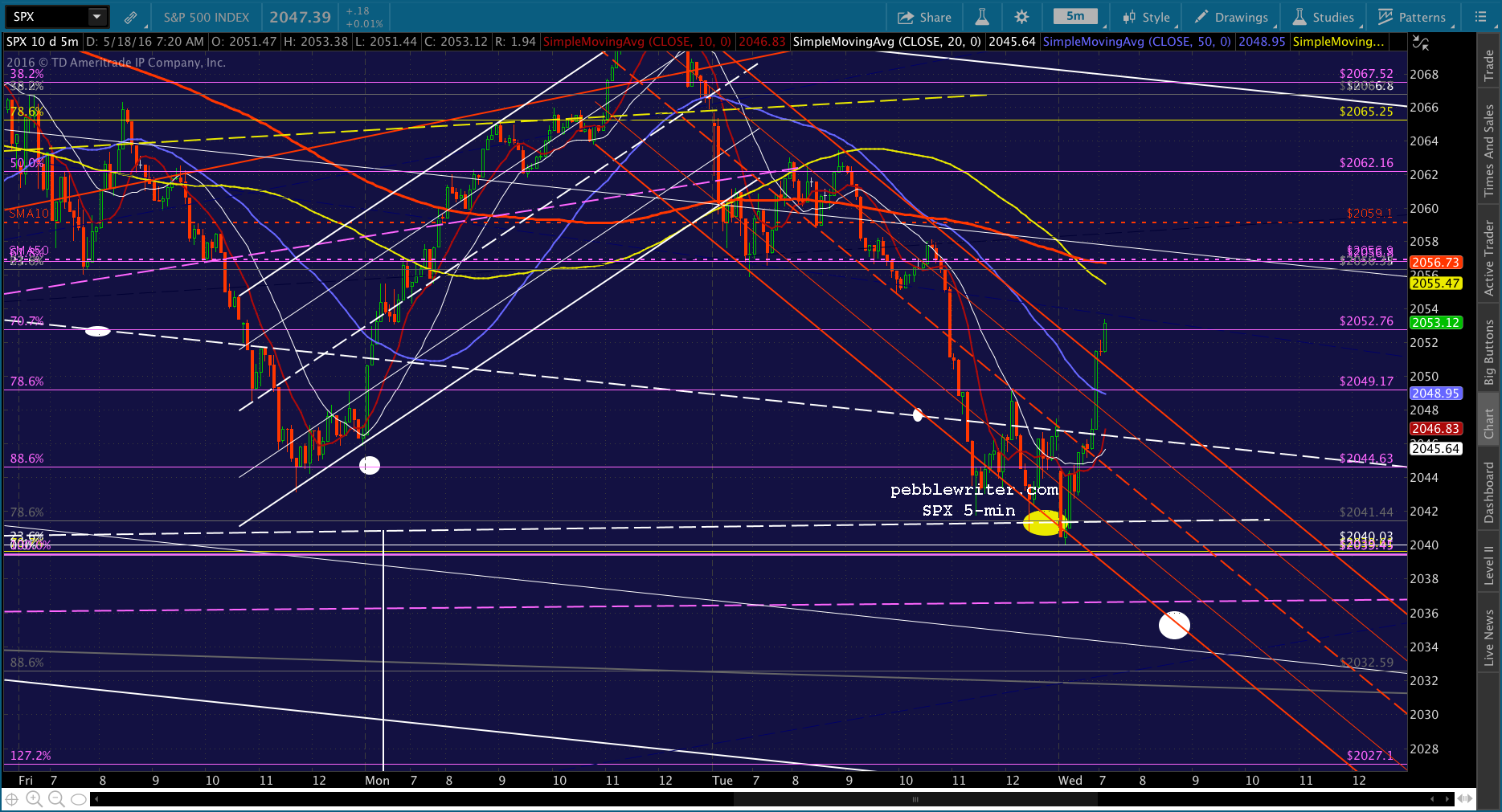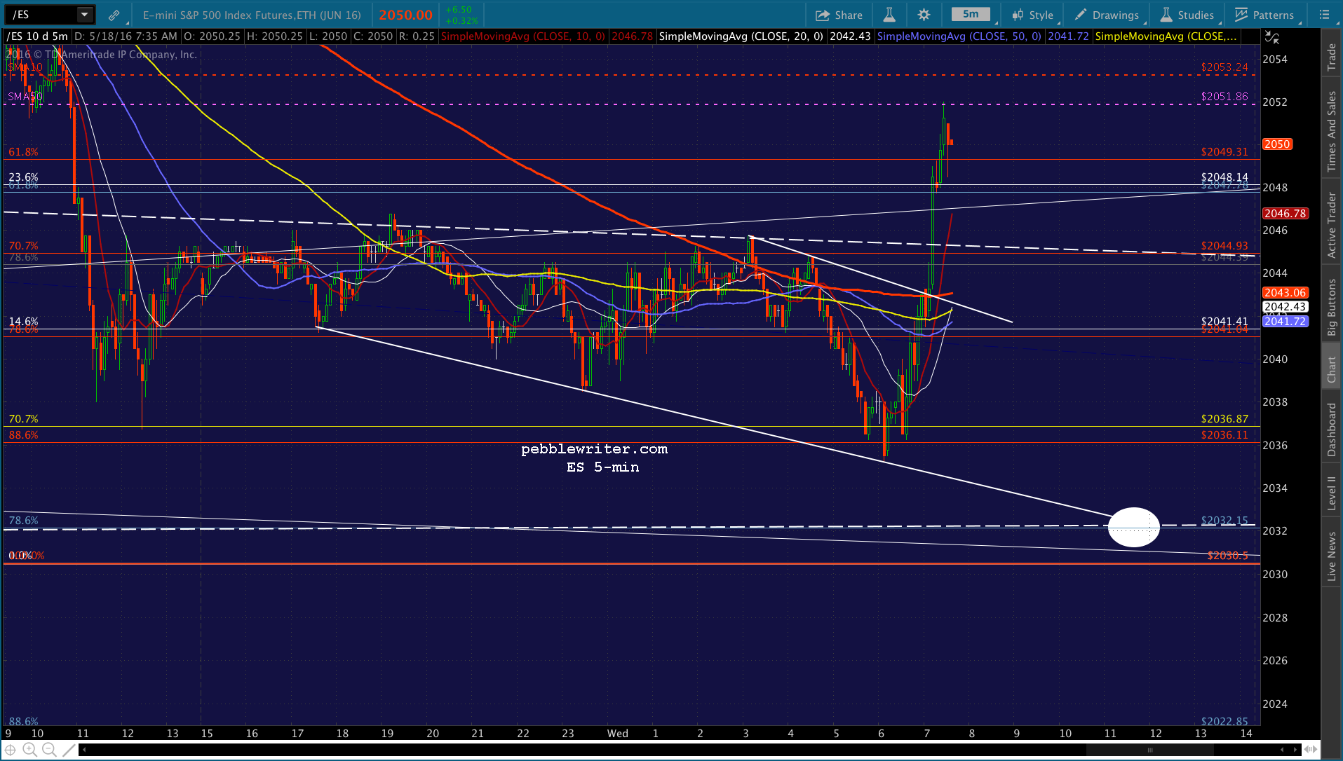 It appears to me that we’re going to get up to the SMA5 200 at 2057ish on a backtest of the rising wedge. I’d cut loose the short here if it pops through the SMA5 100 (2052.75ish) and hopefully pick it back up then.