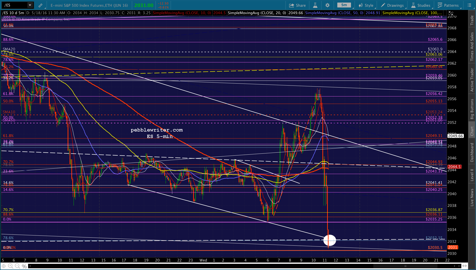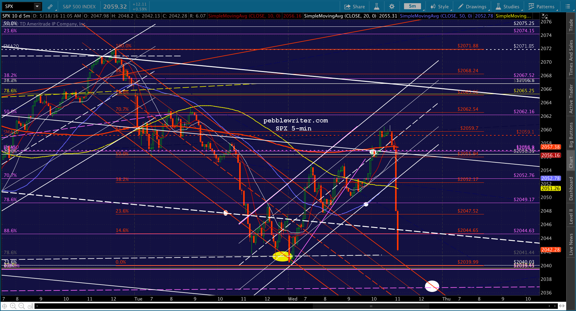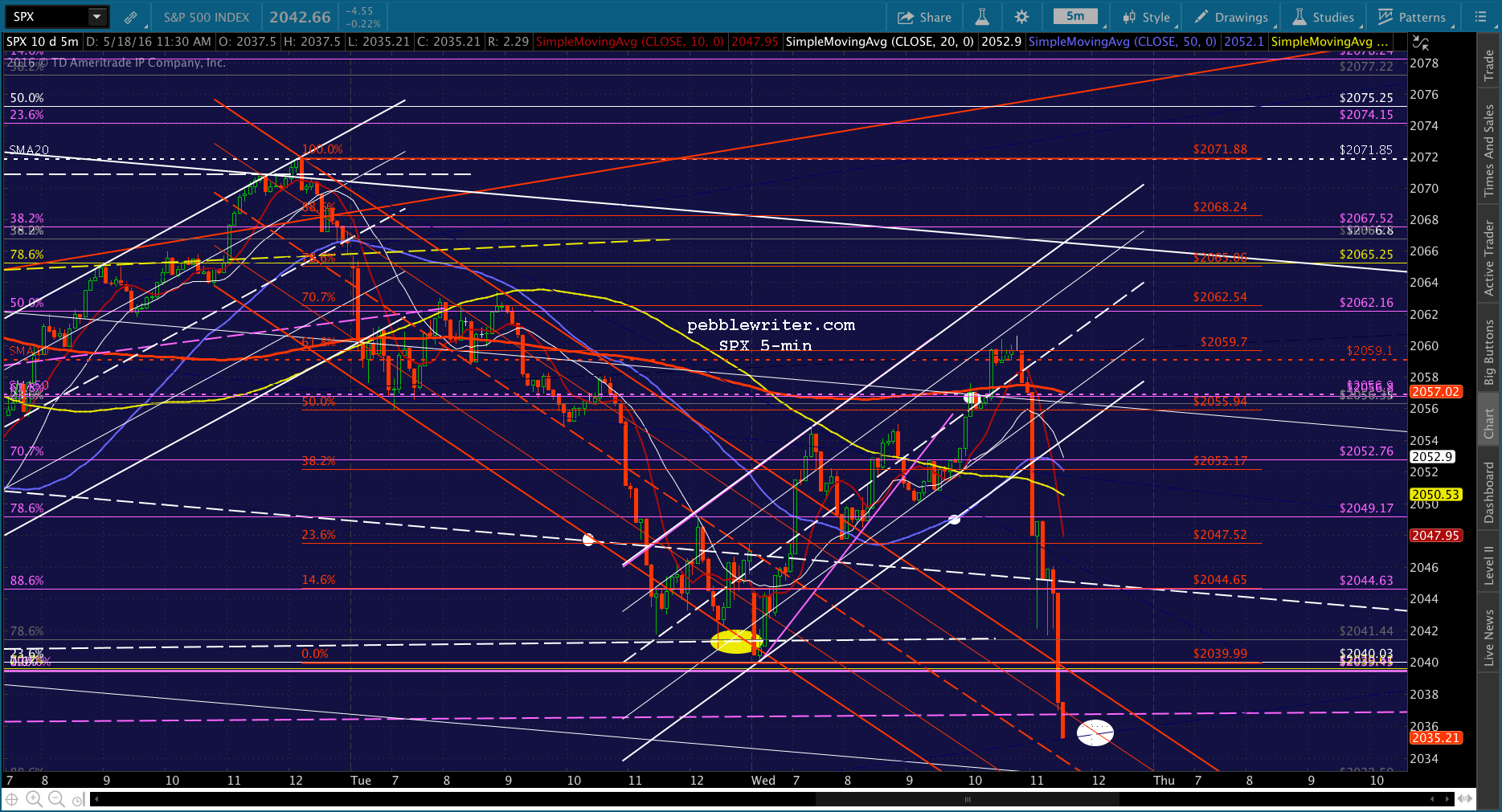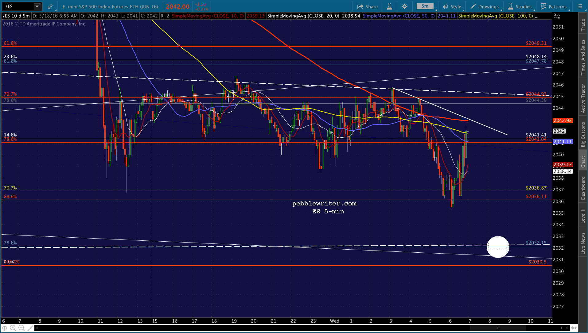 It appears to me that we’re going to get up to the SMA5 200 at 2057ish on a backtest of the rising wedge. I’d cut loose the short here if it pops through the SMA5 100 (2052.75ish) and hopefully pick it back up then.