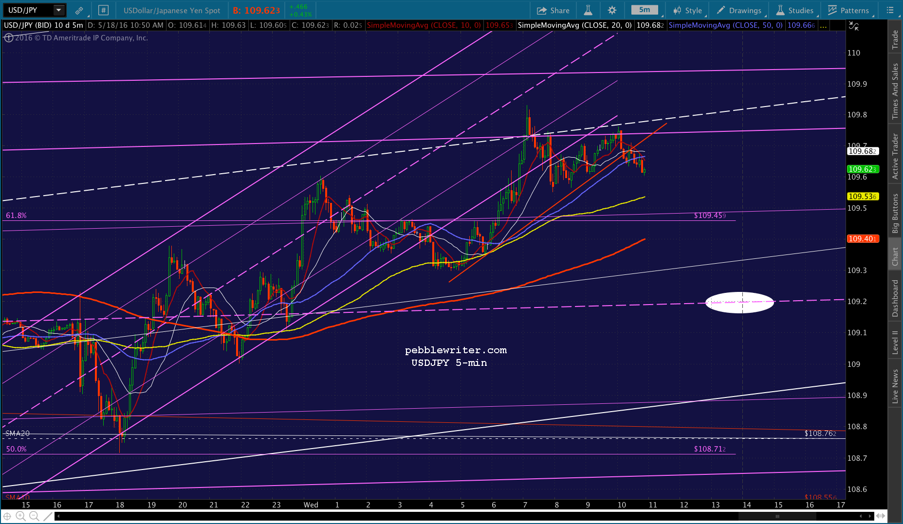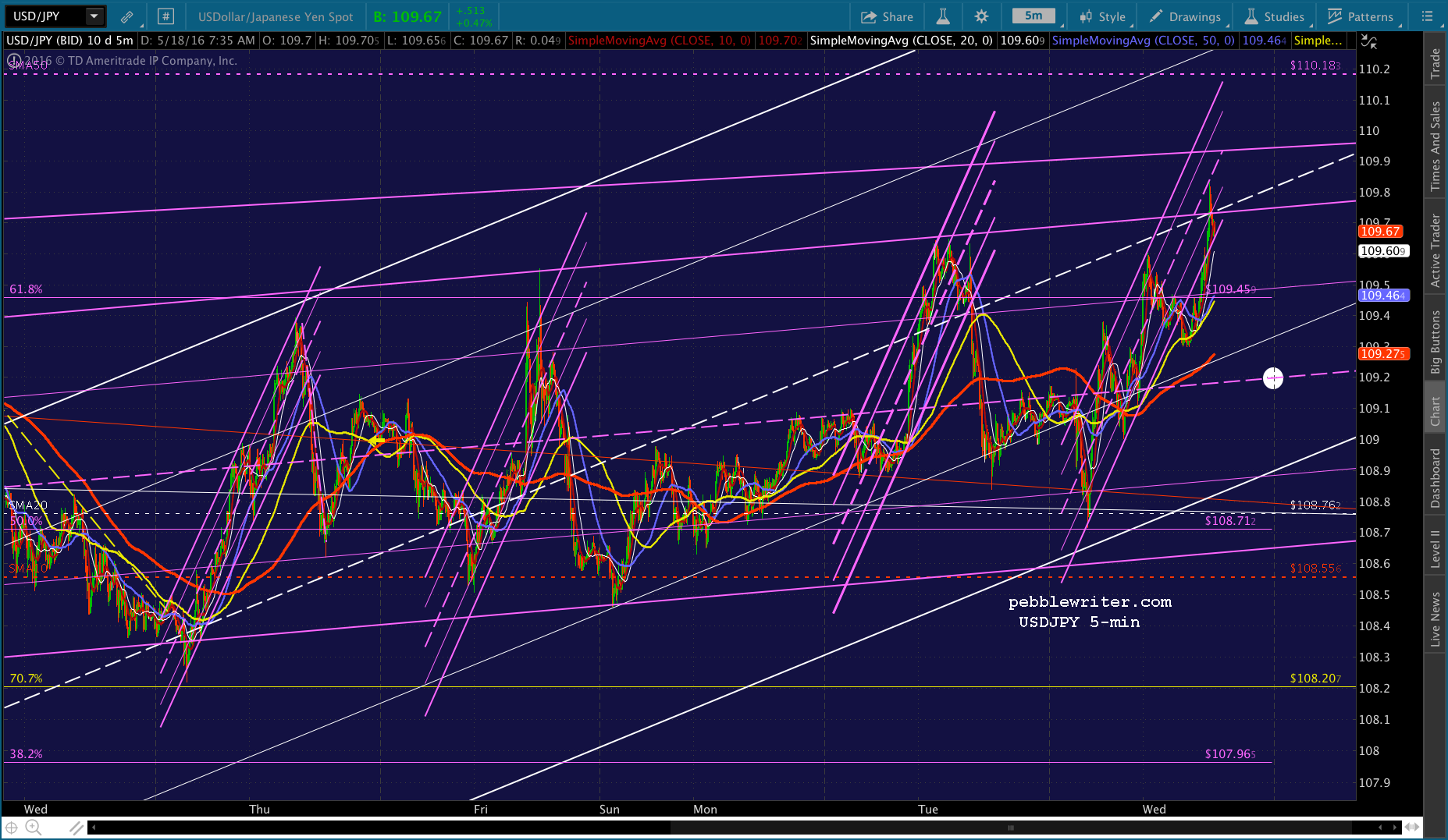 Note that USDJPY has corrected its overshoot and is back down below the white channel midline.