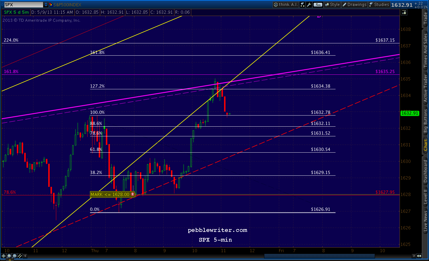SPX just reached 1635.01. We should see a reaction here, probably to the 1632.78 (former high) or perhaps even the red midline around the .618 at 1630.54. But, there’s potentially more on the table.