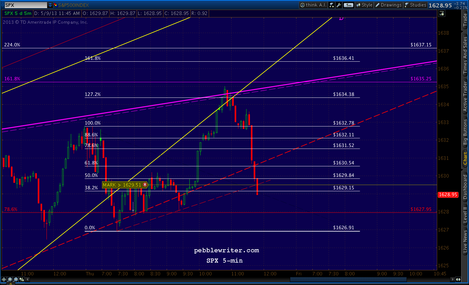 Just dipped below 1632.78. Probably 60:40 that SPX rebounds from here. I’m closing out my interim short. If it keeps going, look for the .618 Fib intersection with the red midline at 1630.54.