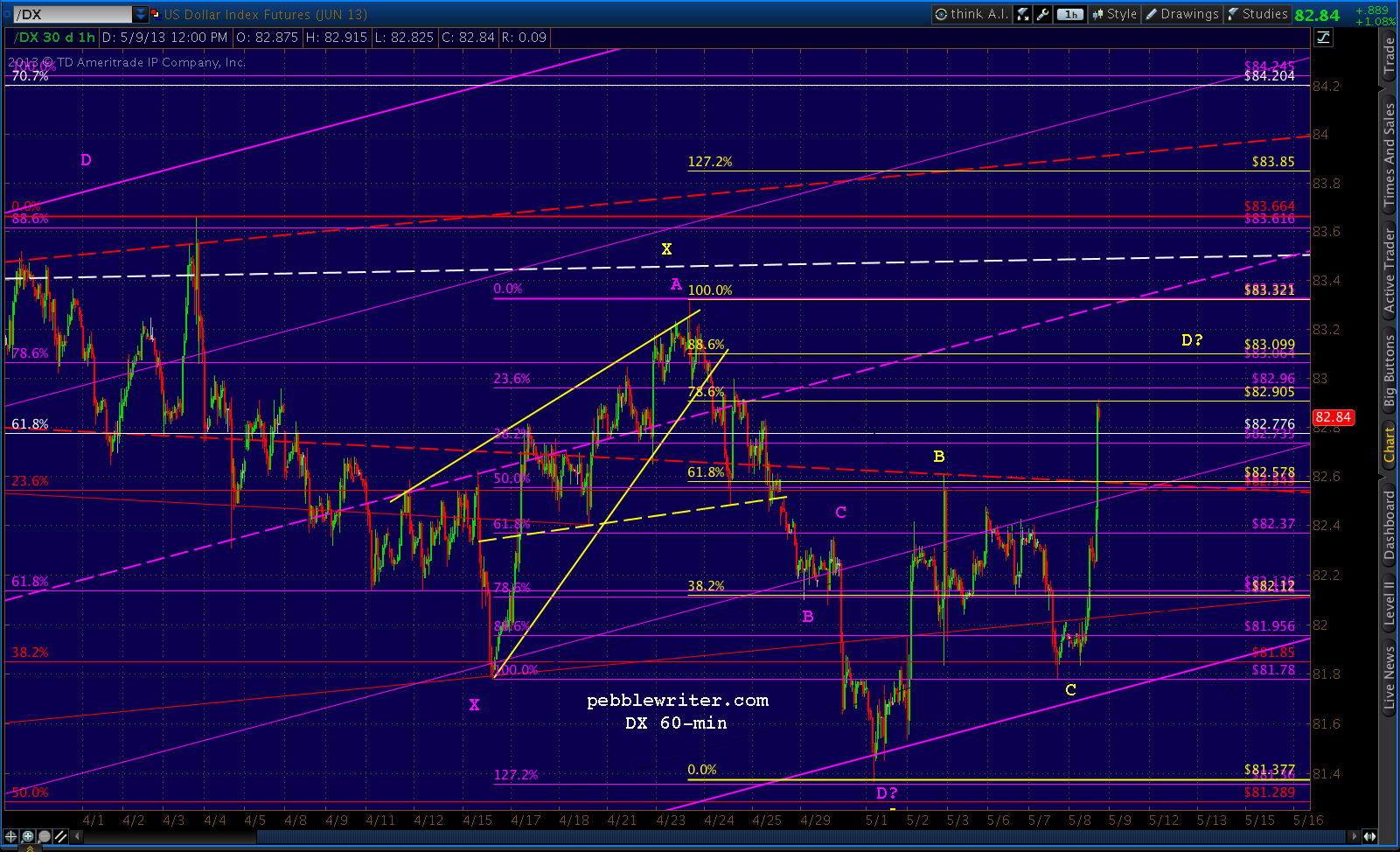 Checking the dollar, DX completed a Gartley Pattern that should see it back off the .786, even if it still has more room to run (the .886 or 1.618.)