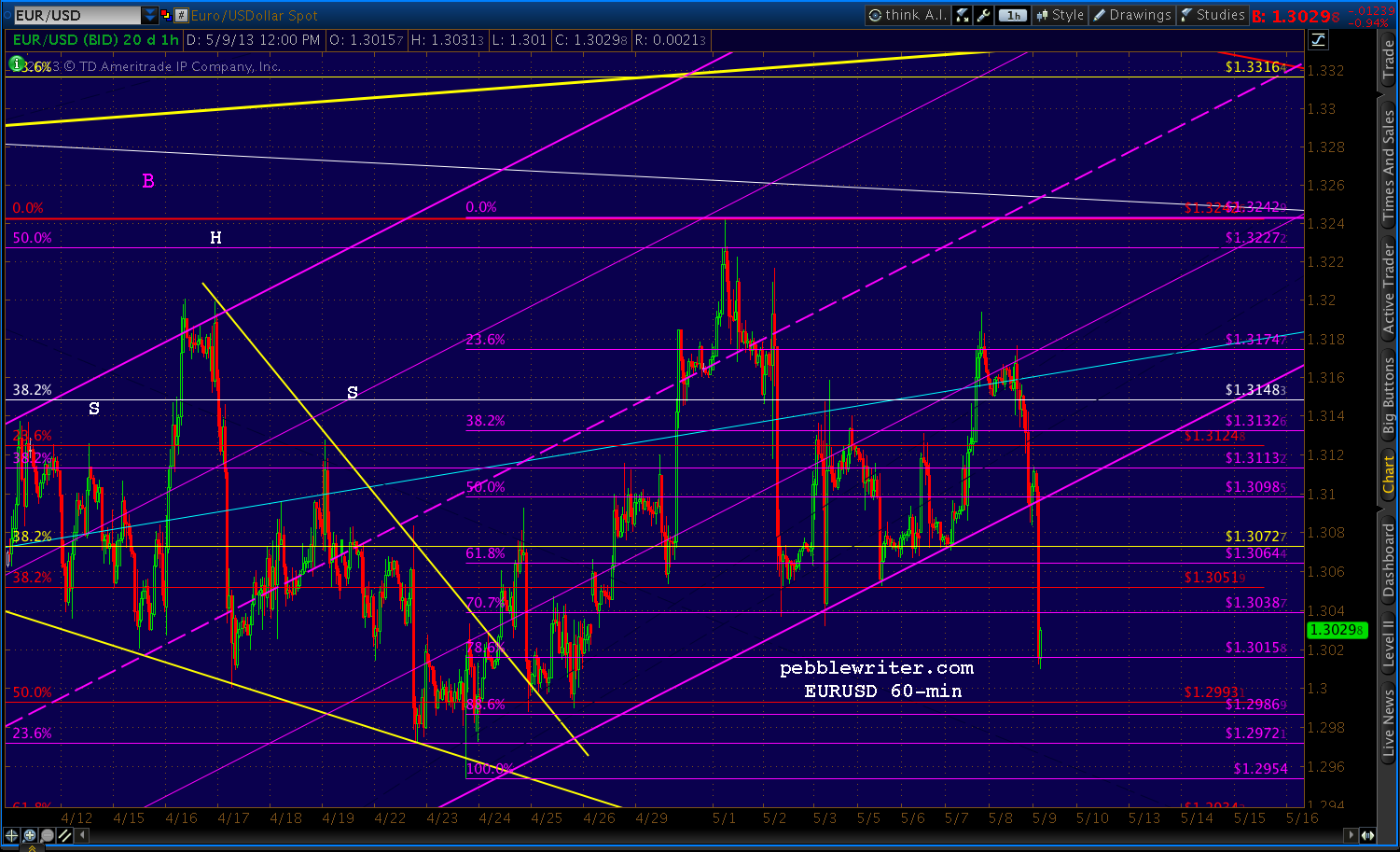 And, the EURUSD channel broke down — also with a .786 retracement. I would expect a back test of the channel — possibly at the .500 Fib of 1.3098 — before any further drop to the .886 or the red .786 at 1.2850 (favored target.)
