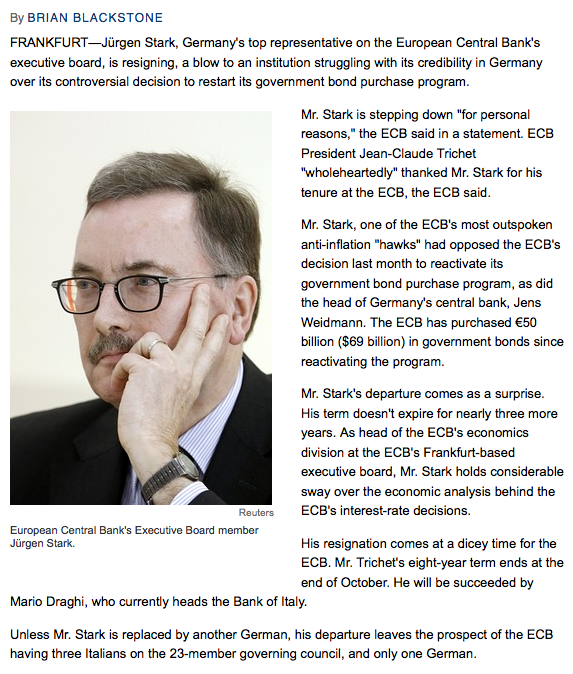 Jürgen Stark, chief economist (and chief hawk) of the ECB, just quit over the ECB’s decision to ramp up their version of QE. It leaves three Italians on the governing council versus only one German.