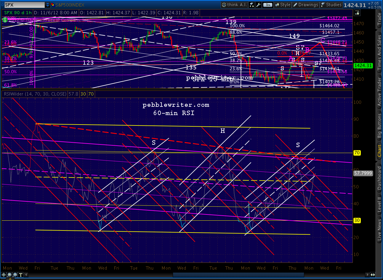 According to the election watchers, Obama will carry the presidency and the House and Senate will remain split. So, there’s little need to pump things any higher than they already are. As a result, I’m going to try a short here at 1424 and will maintain a rather loose stop, probably at the former high of 1434. If I’m wrong and we exceed 1434, I’ll play along on the upside and look to re-short at either Point B or Point C of our analog.