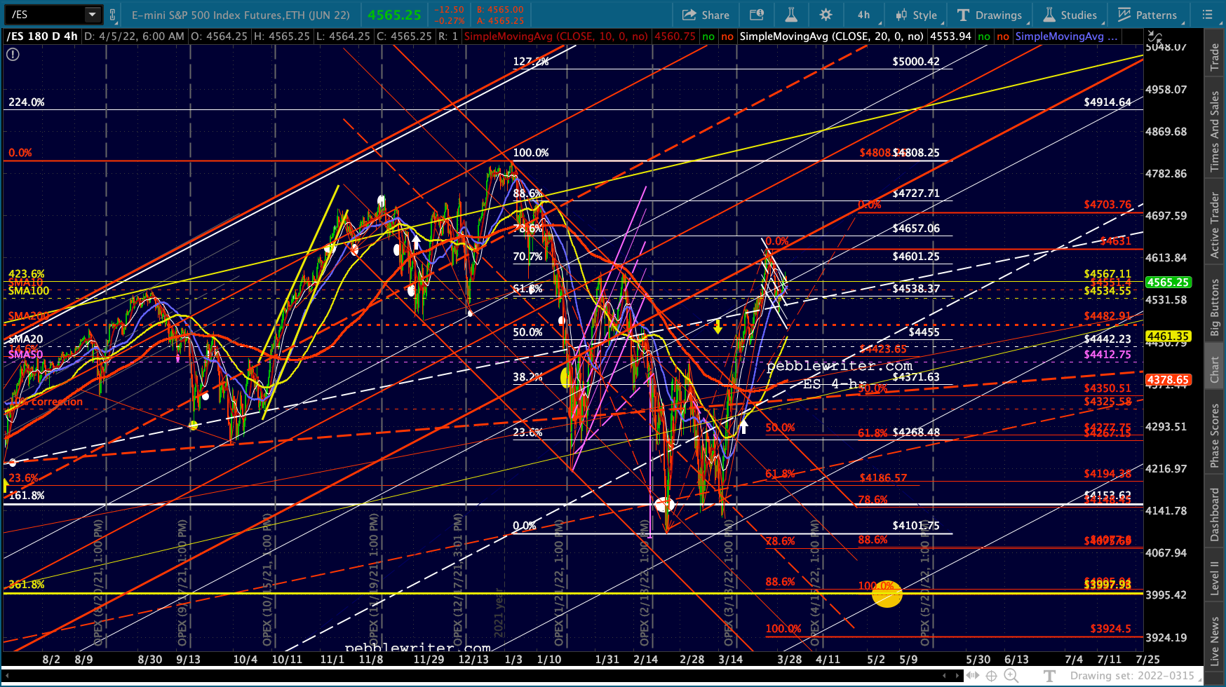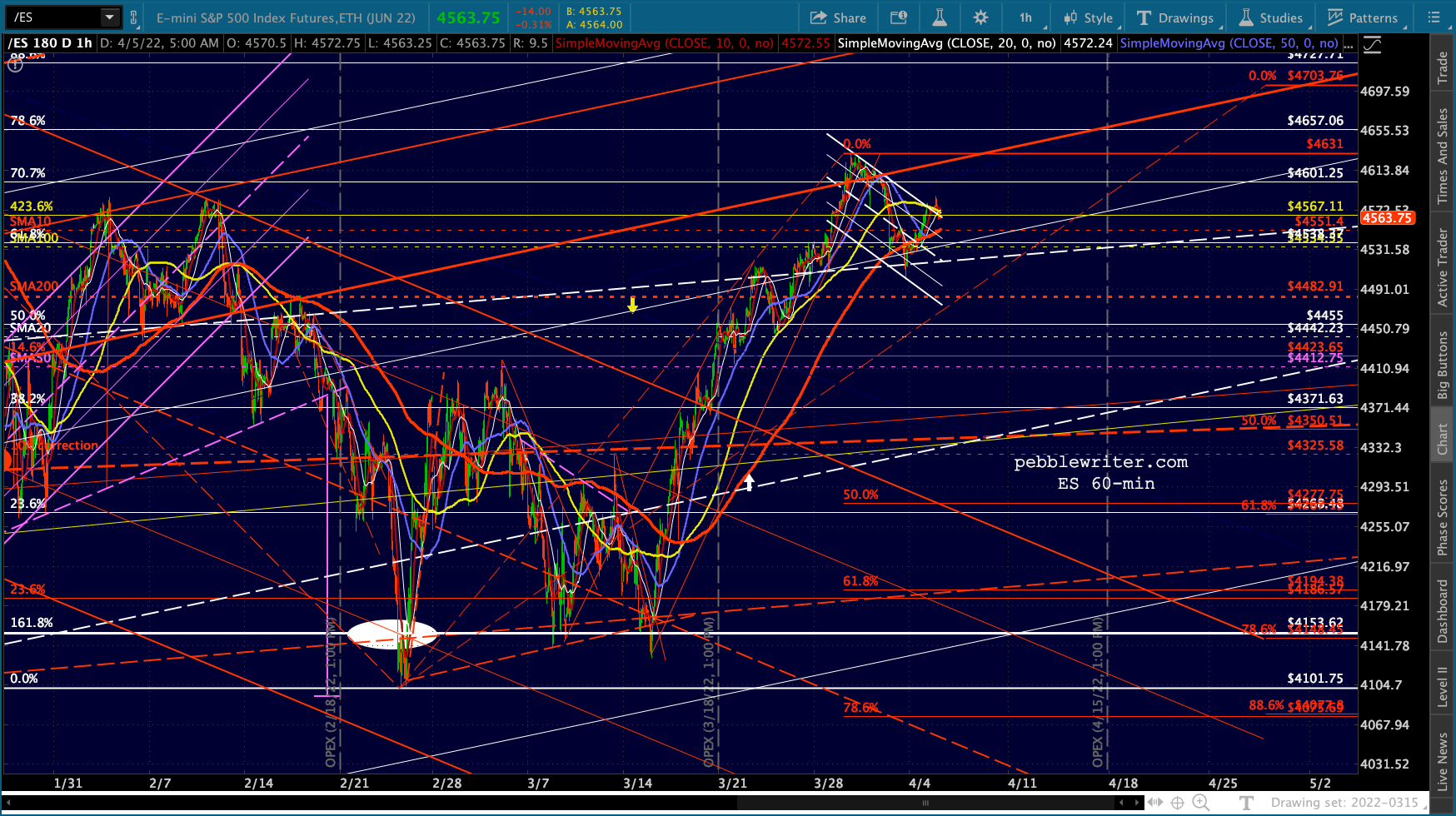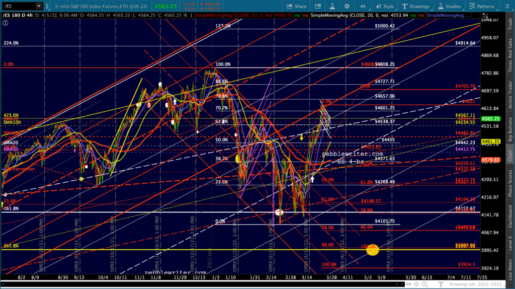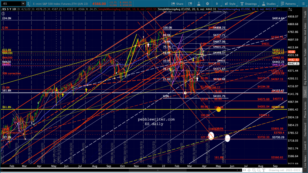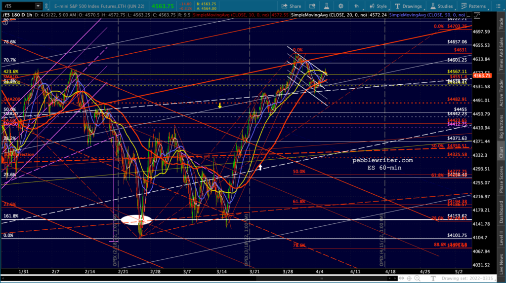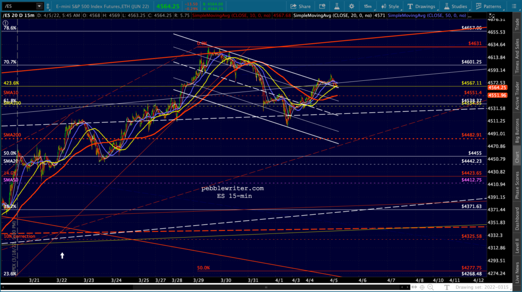 The EOD theatrics was enough to push ES up out of the small falling white channel I sketched in intraday, but it’s back to the top of the channel at this time.